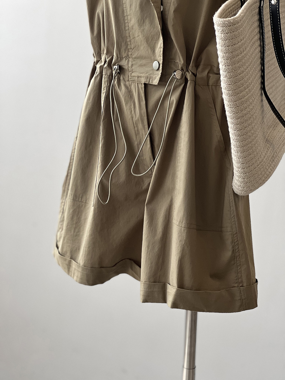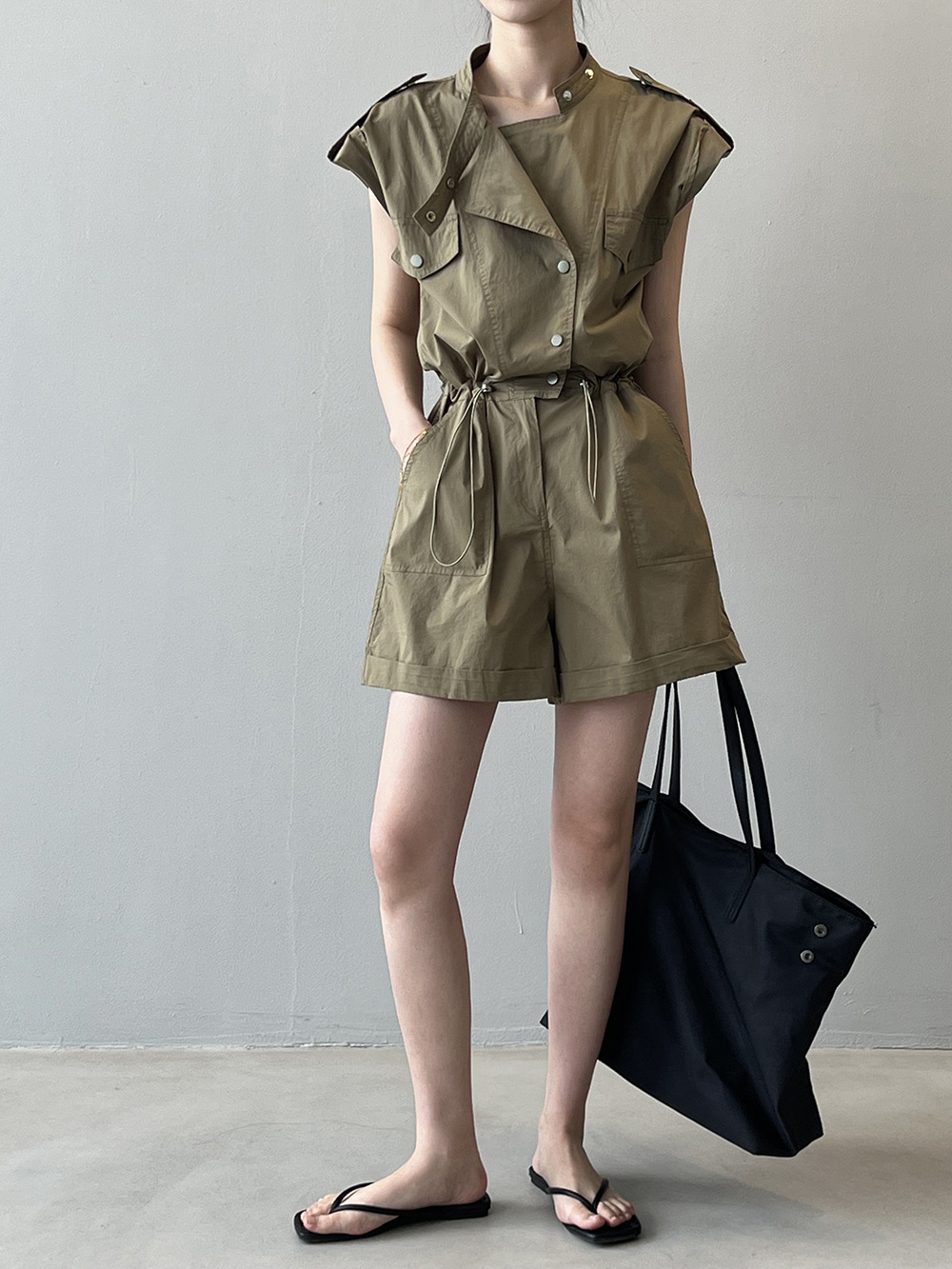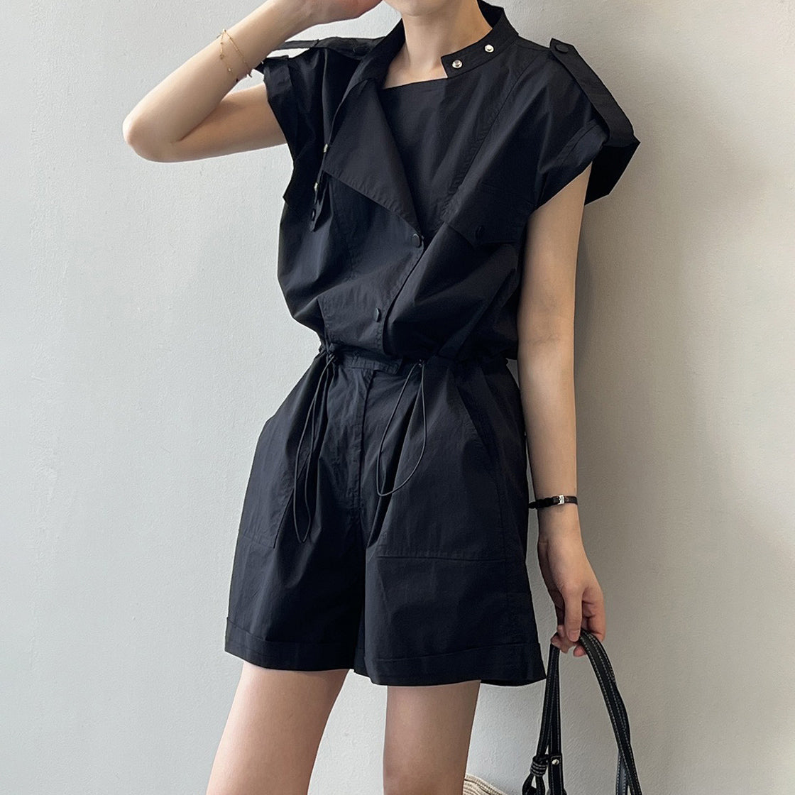 【商品名】【ボトムス】ハイウエスト 夏 ワーク風 オールインワン スタンドカラー フリルスリーブ シャツ風 ショート丈ジャンプスーツ【JZシリーズ】