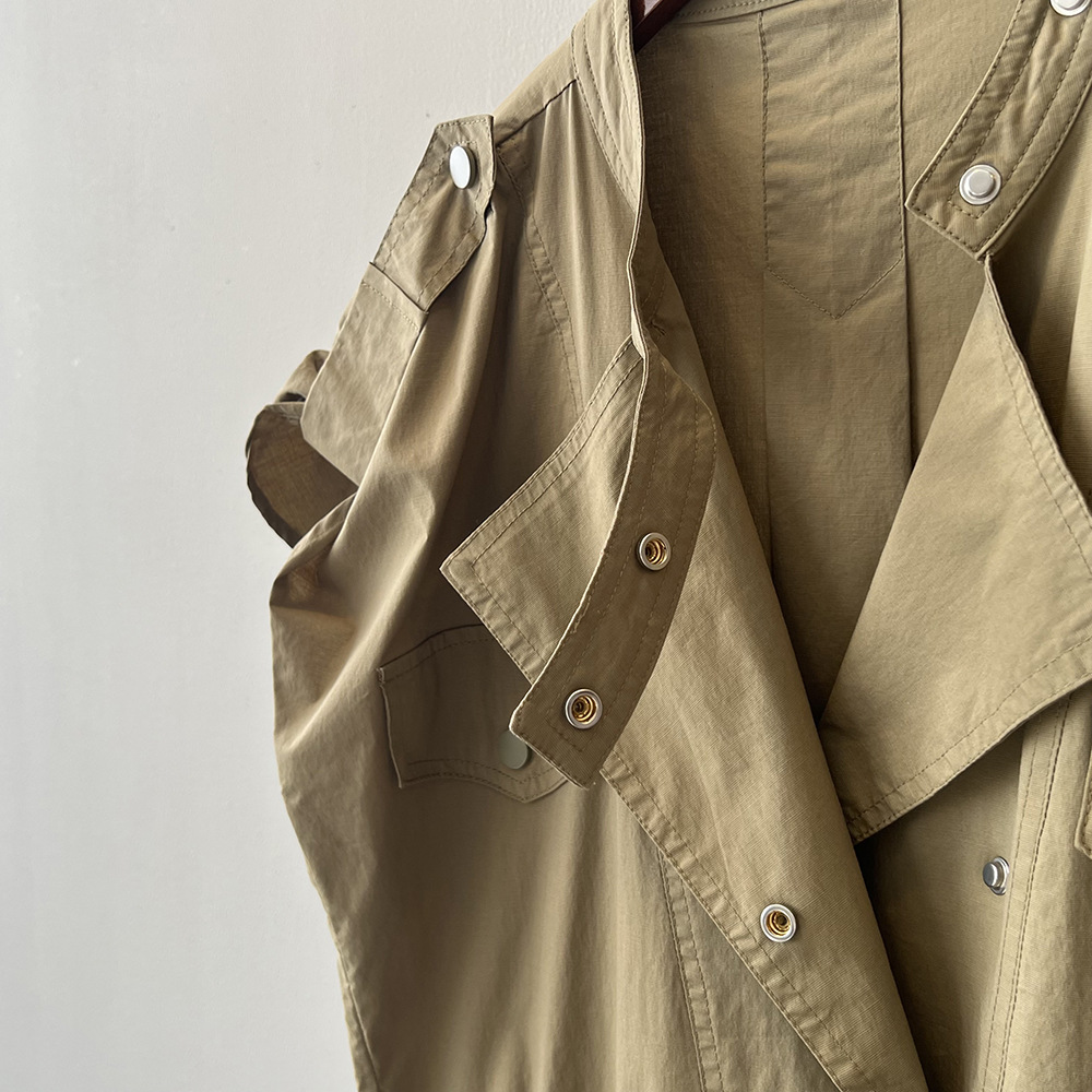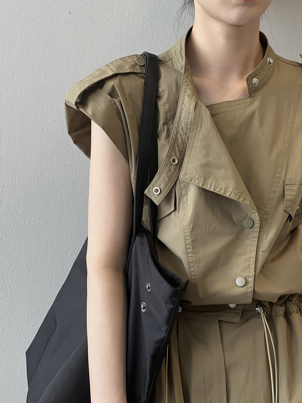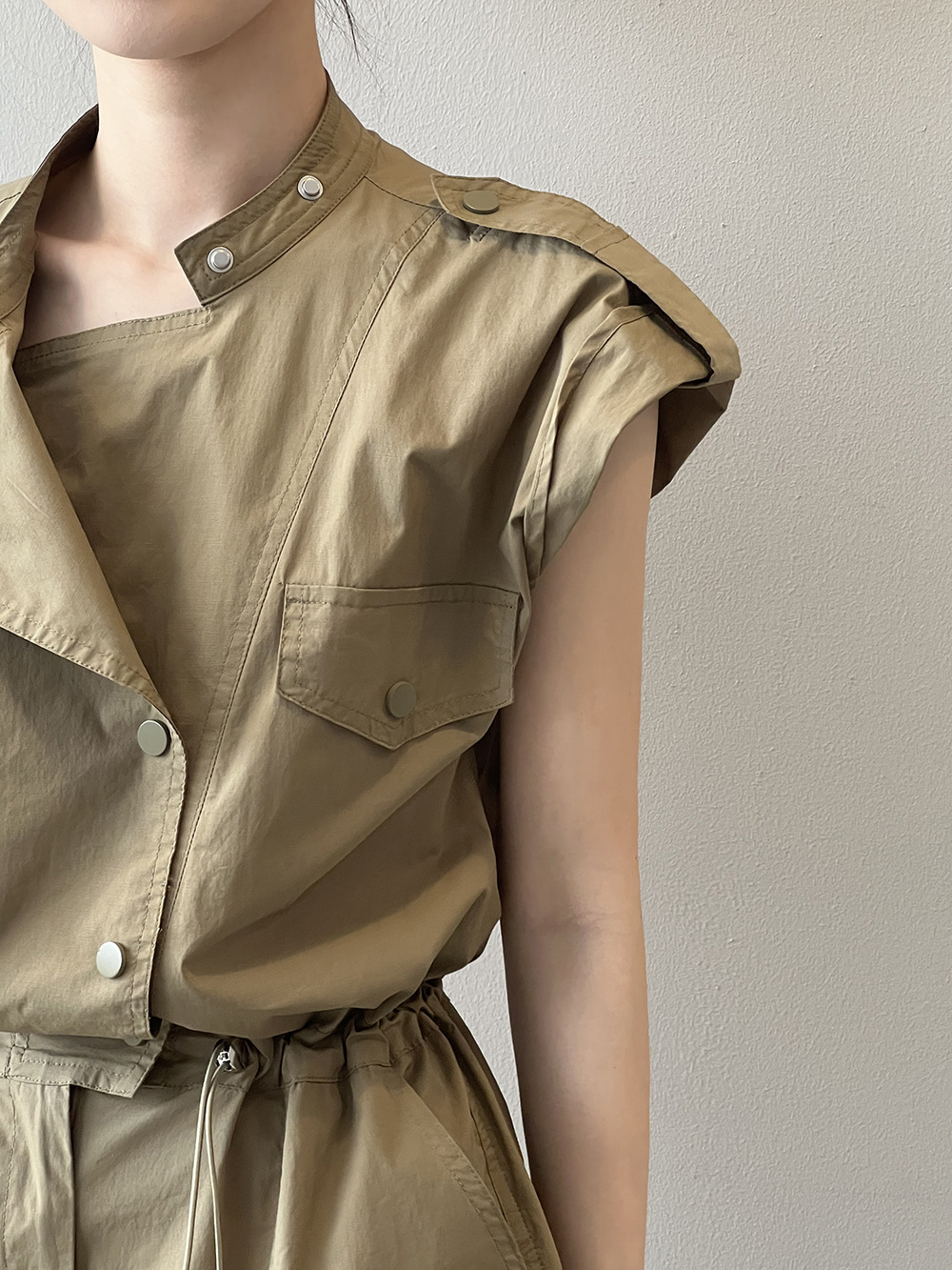 【商品名】【ボトムス】ハイウエスト 夏 ワーク風 オールインワン スタンドカラー フリルスリーブ シャツ風 ショート丈ジャンプスーツ【JZシリーズ】