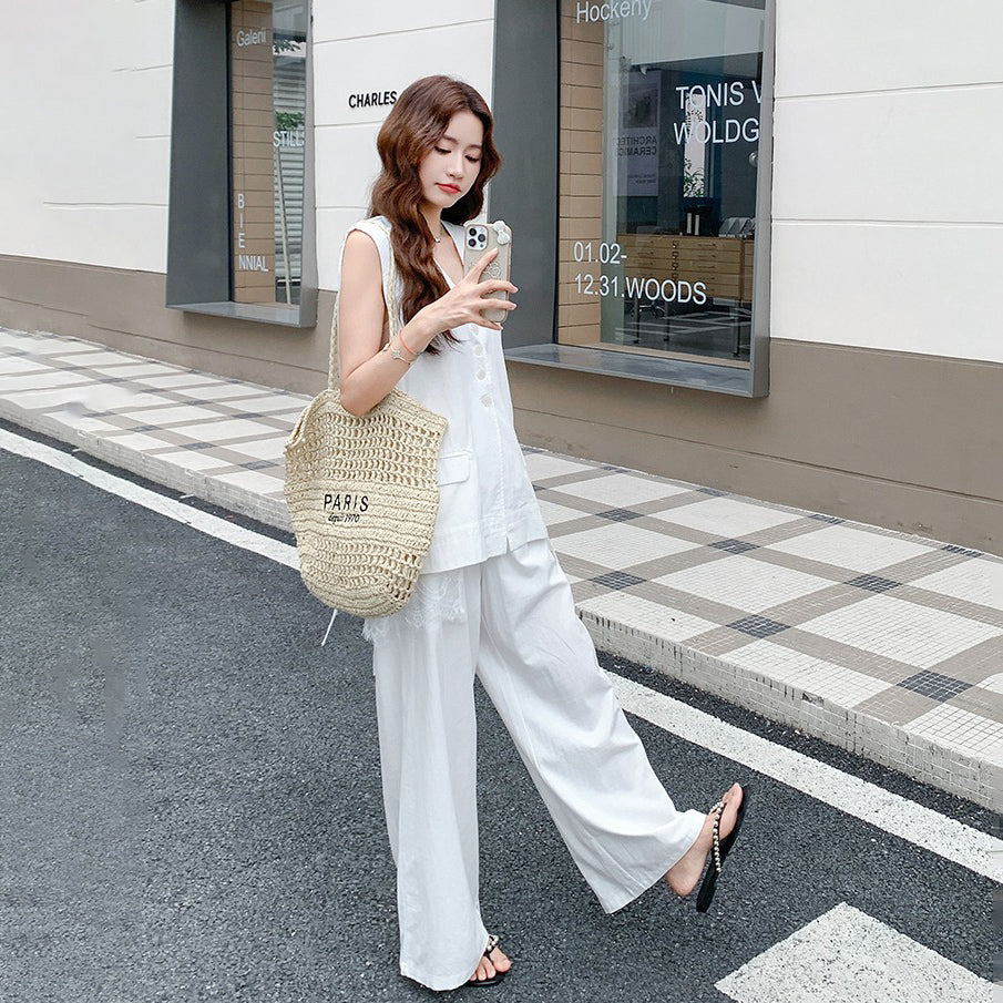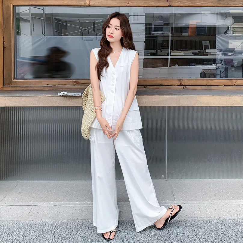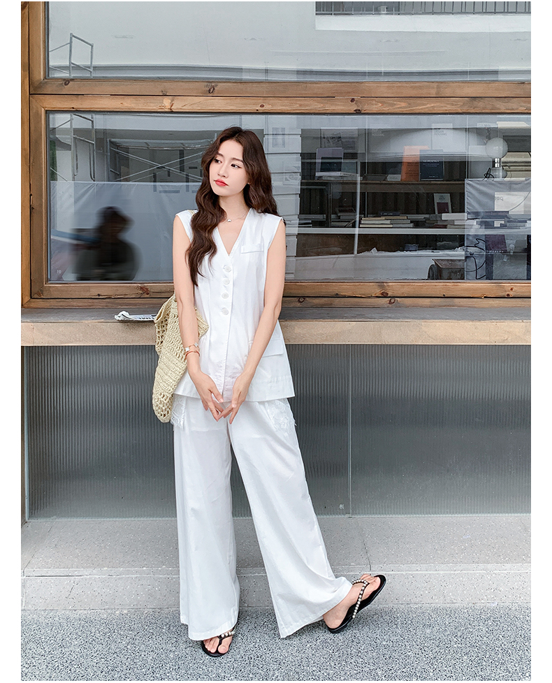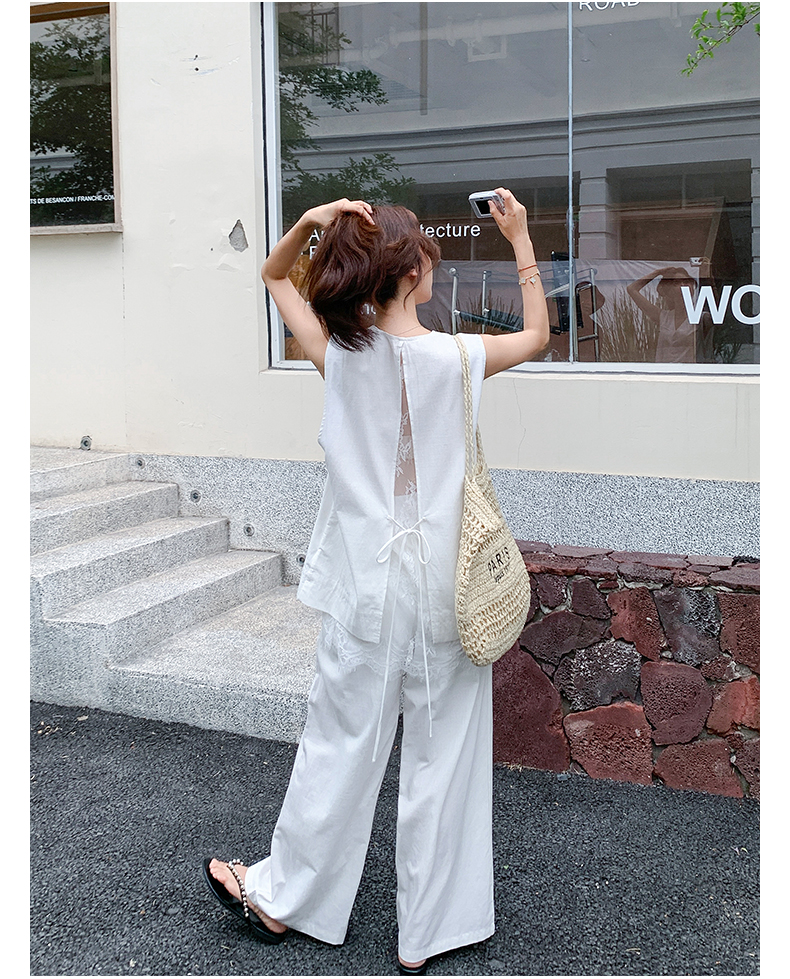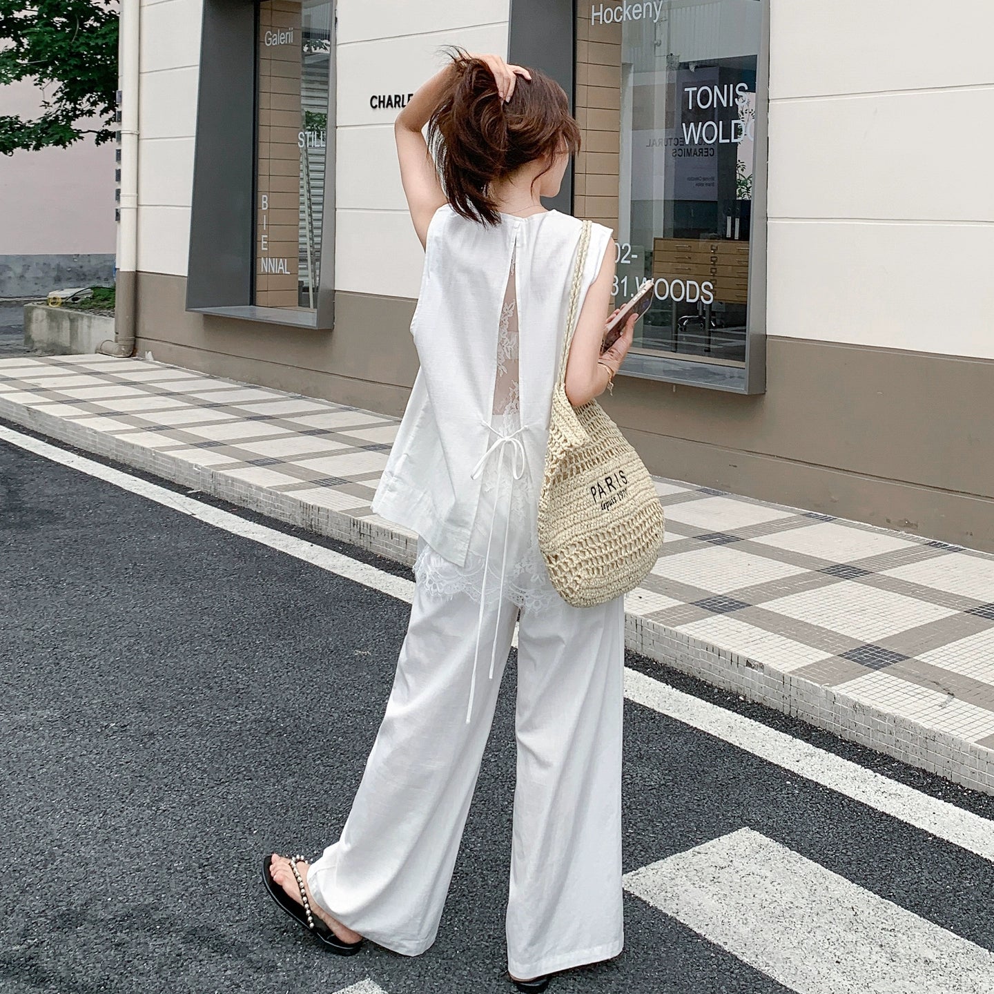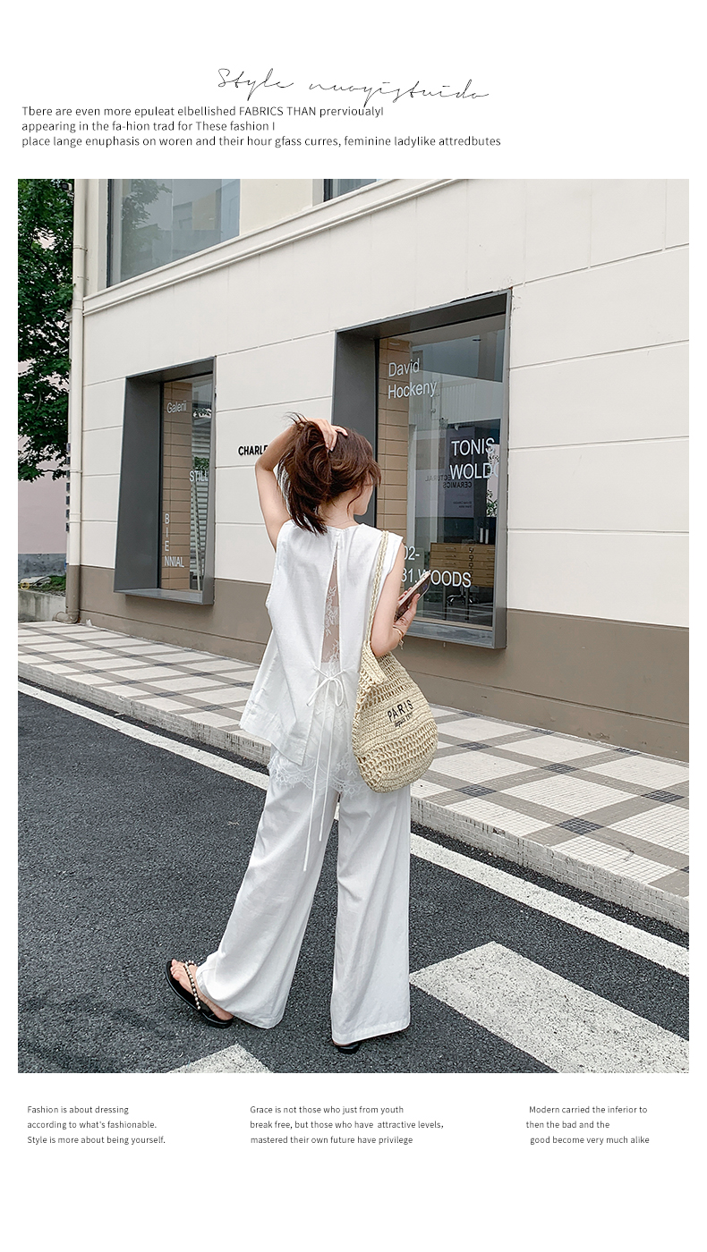 【商品名】2点セット!【ボトムス】夏 通勤 レース切替 バックレス ベスト+ワイドパンツ 上下セット【JZシリーズ】
