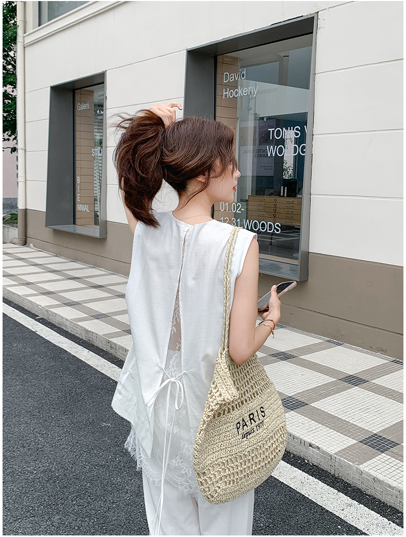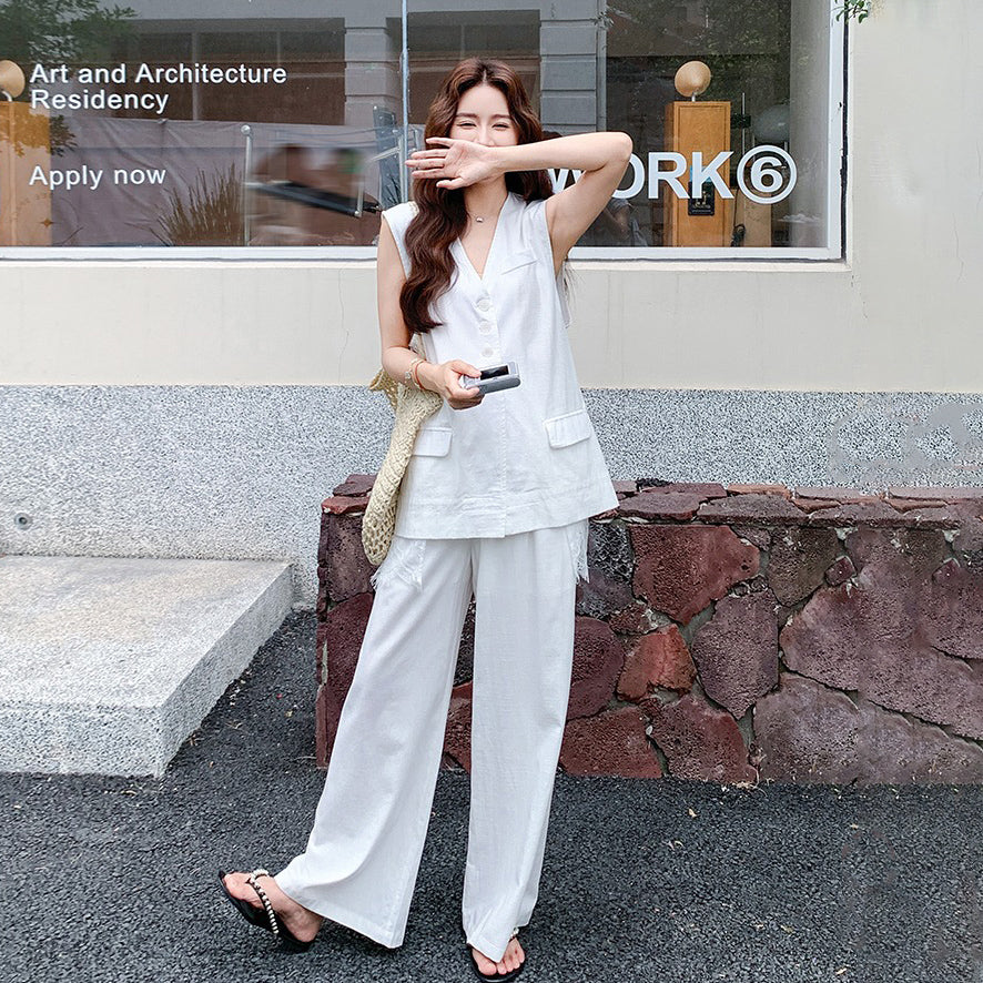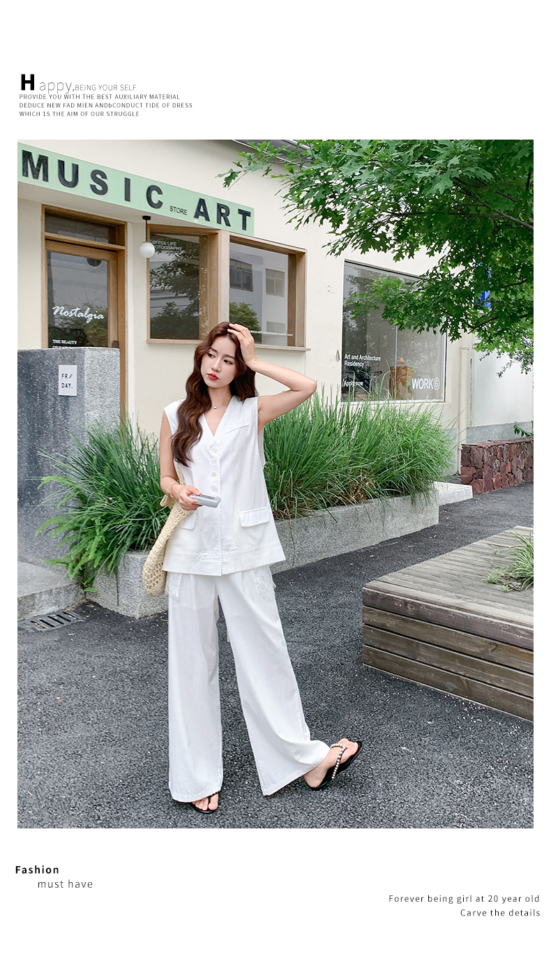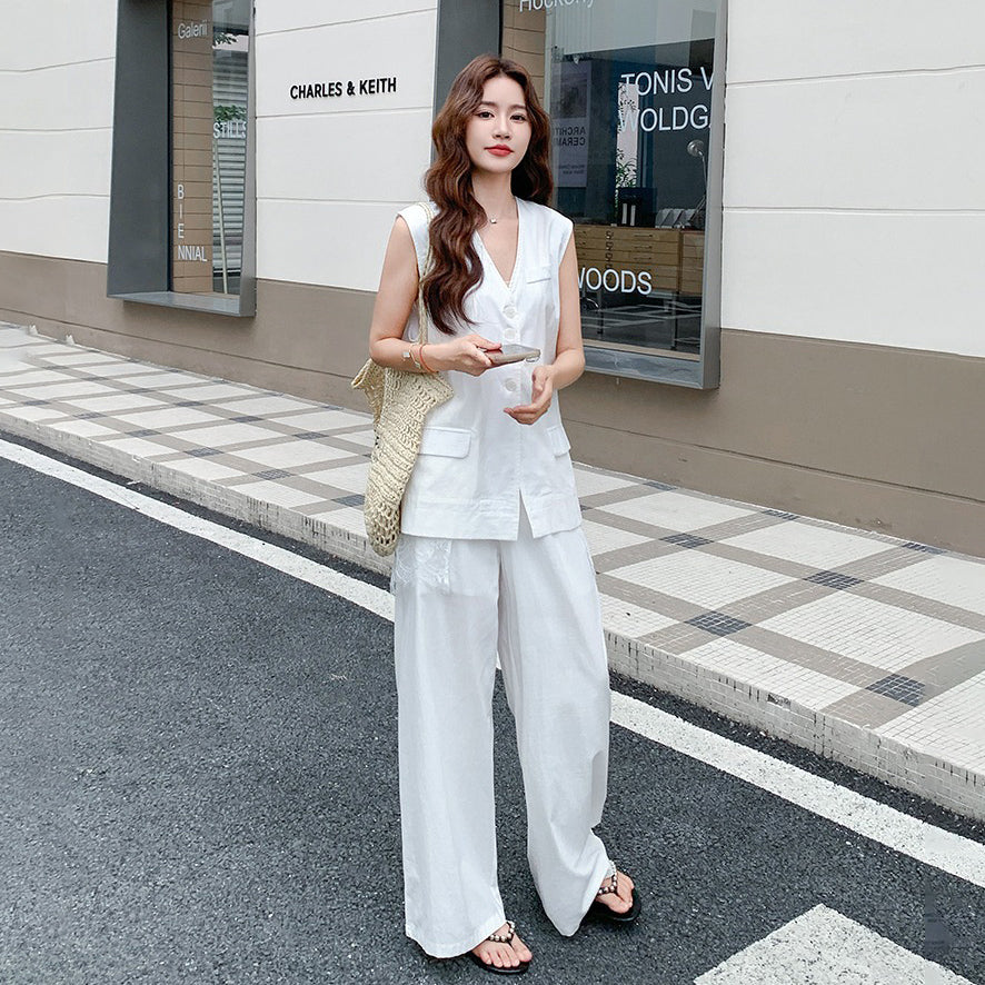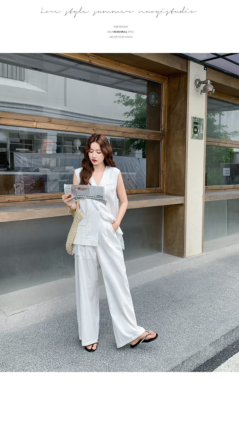 【商品名】2点セット!【ボトムス】夏 通勤 レース切替 バックレス ベスト+ワイドパンツ 上下セット【JZシリーズ】