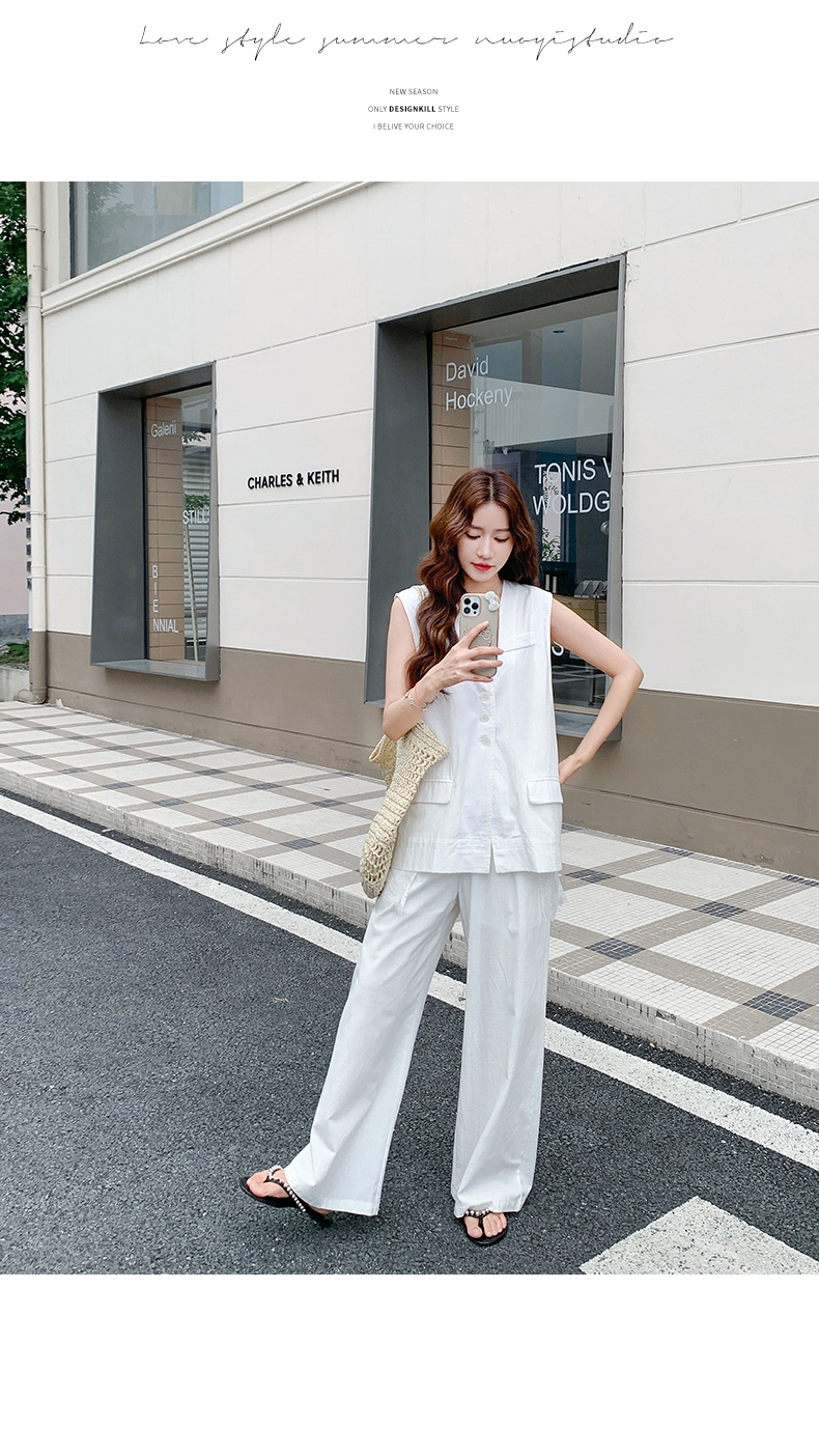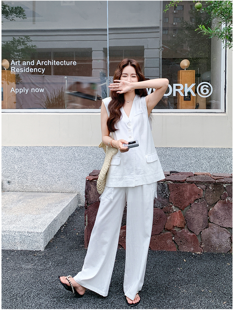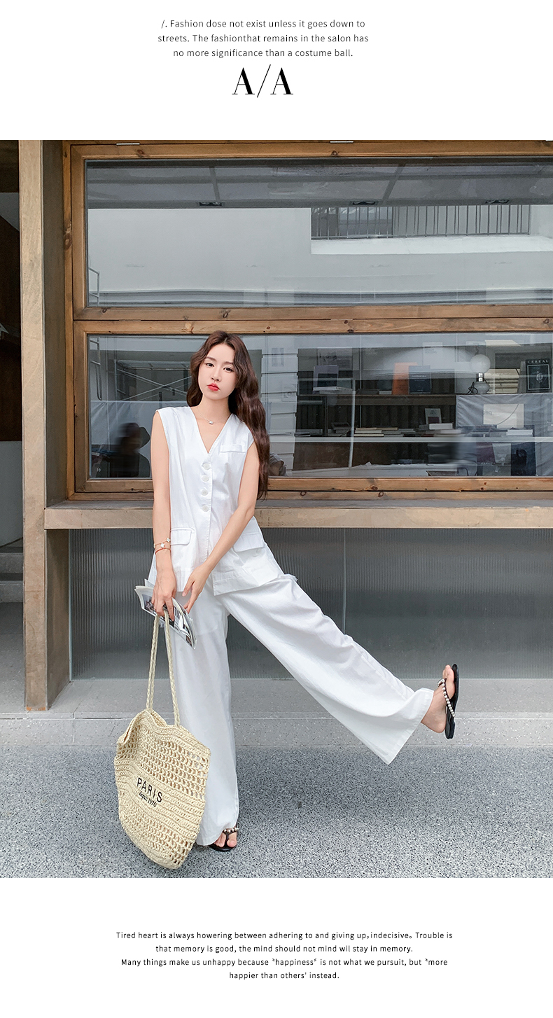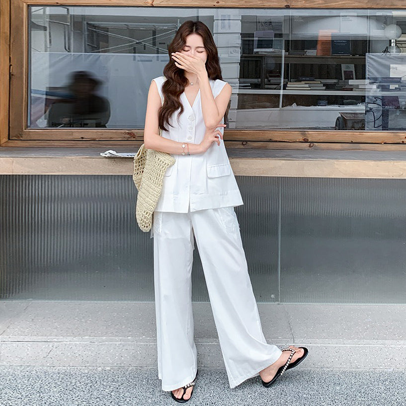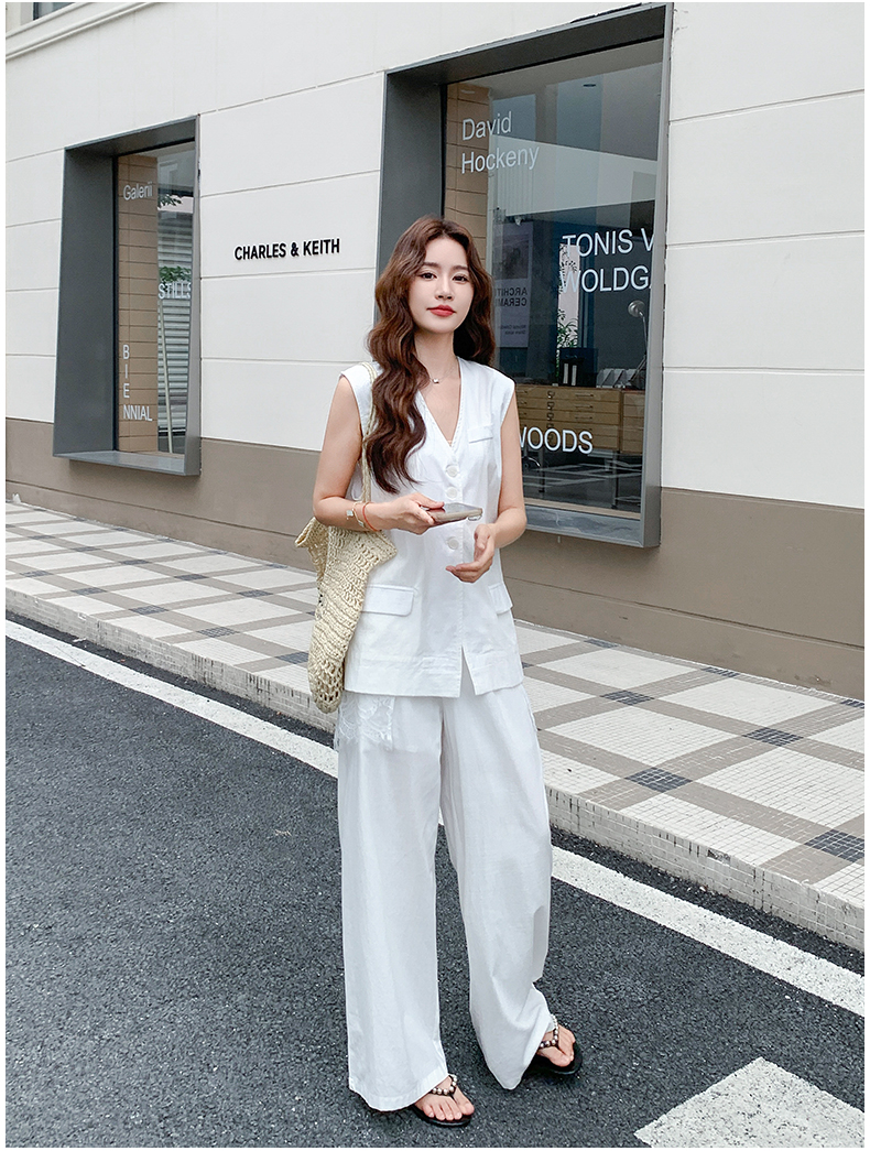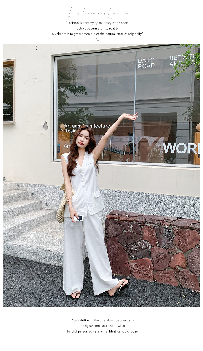 【商品名】2点セット!【ボトムス】夏 通勤 レース切替 バックレス ベスト+ワイドパンツ 上下セット【JZシリーズ】