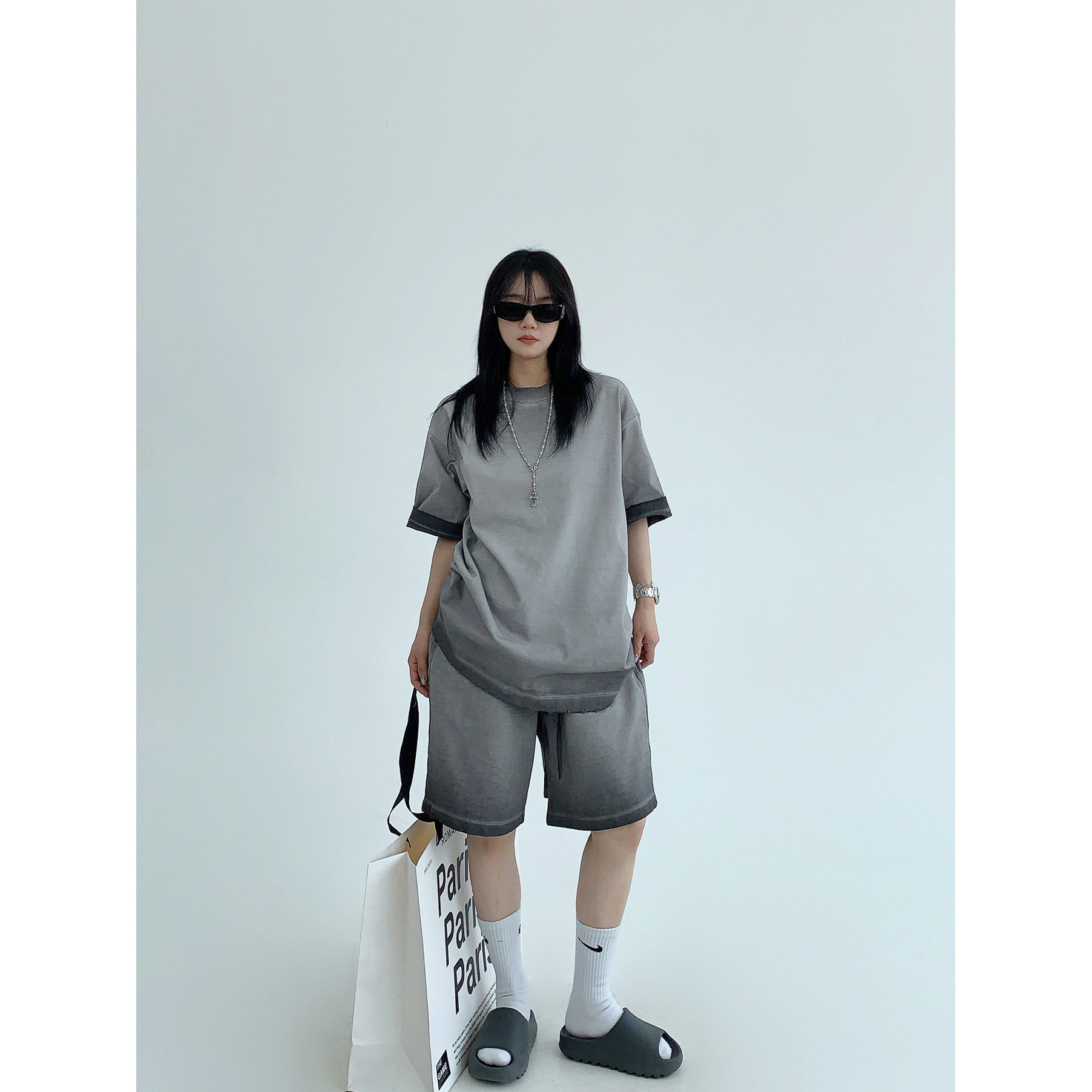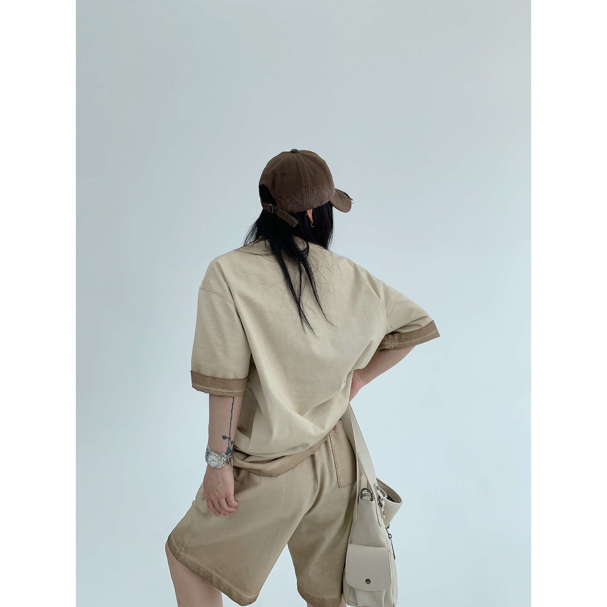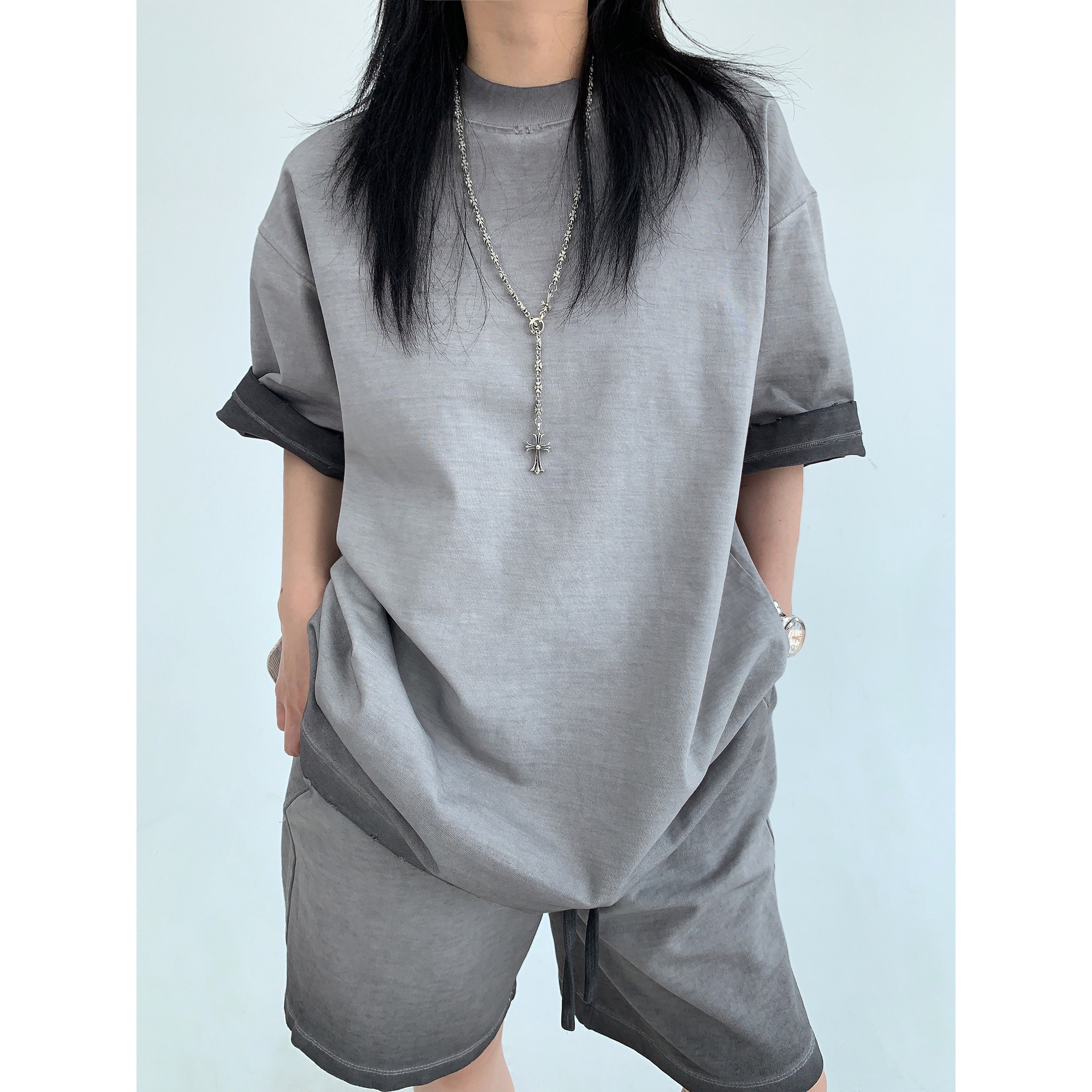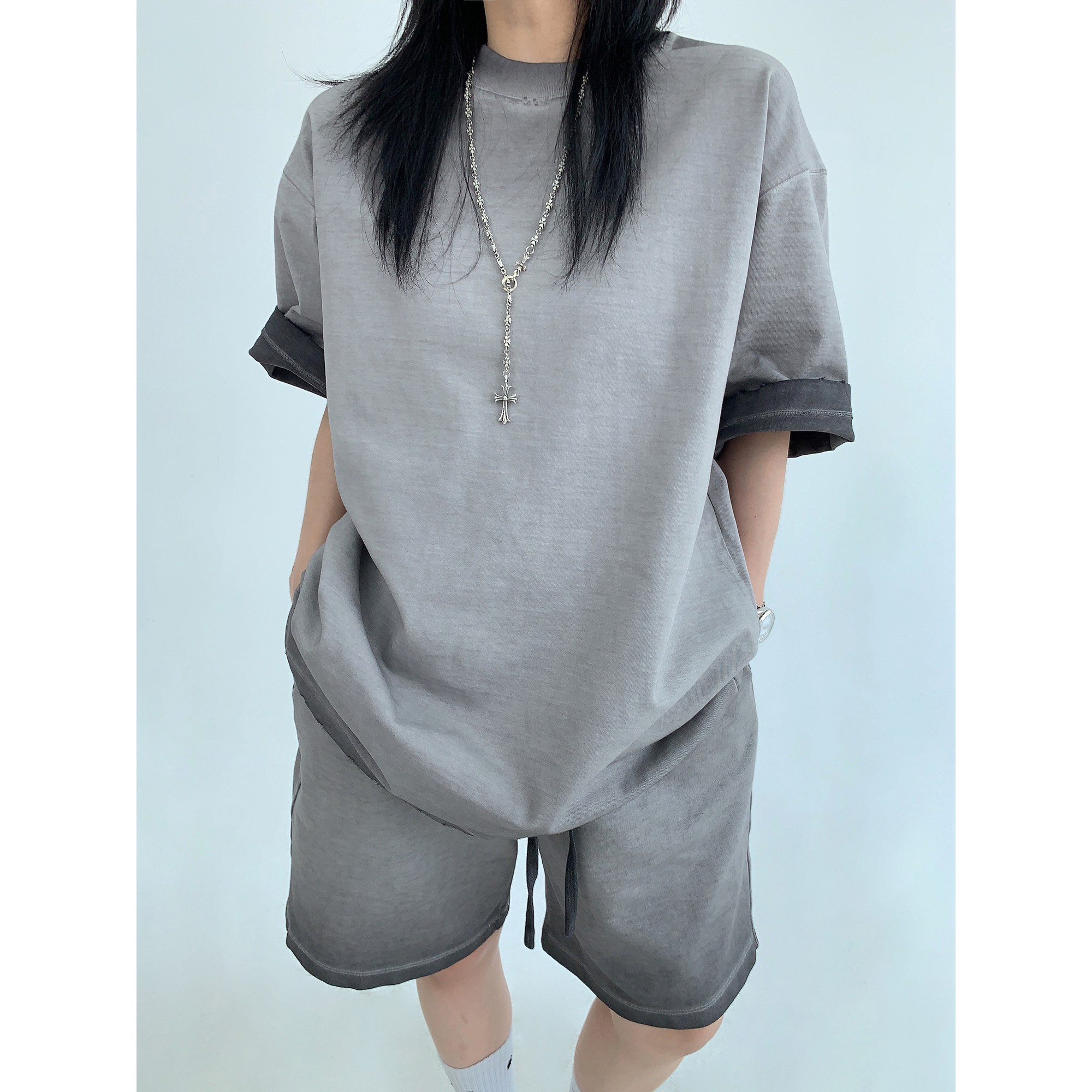 【単品注文】【ボトムス】ルーズ リラックス感 ウォッシュド ダメージ加工 Tシャツ + ショートパンツ 上下セット【FCシリーズ】