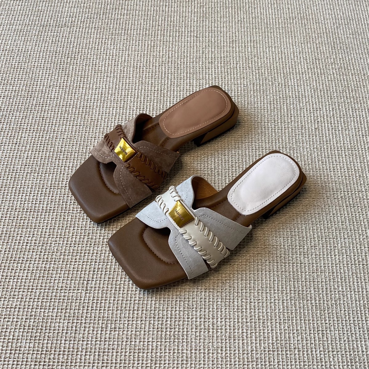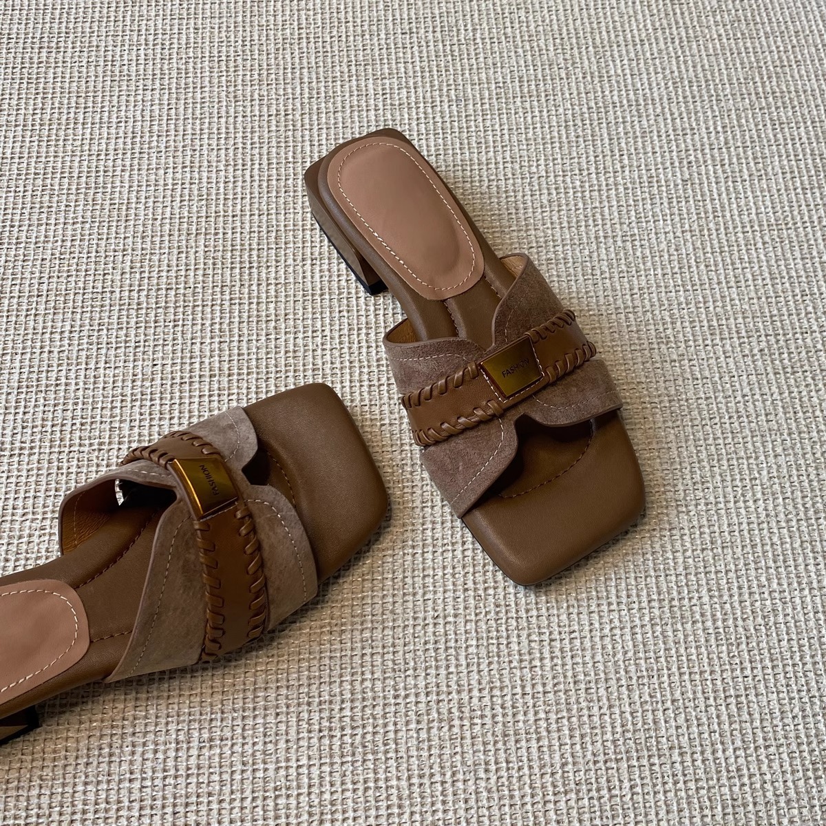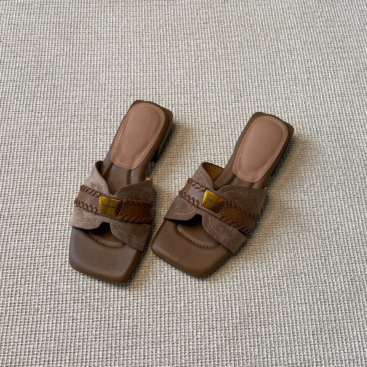 【シューズ】スクエアトゥ フレンチ風 ローヒール 編み込みサンダル