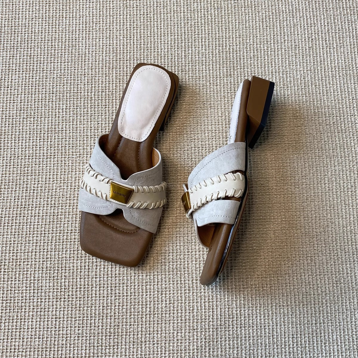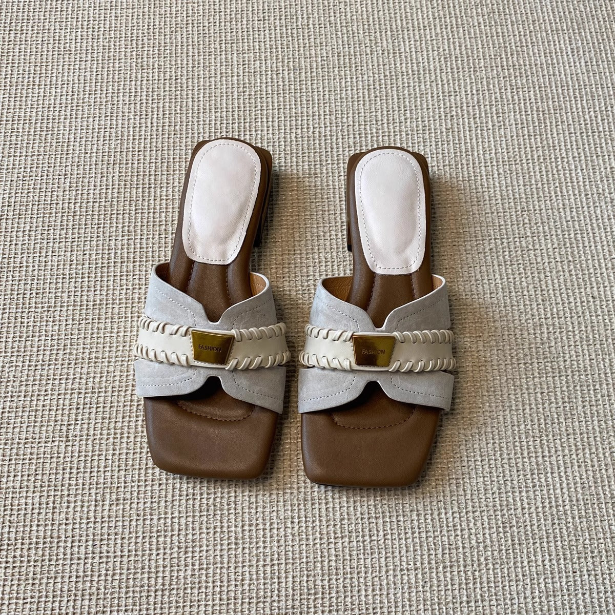 【商品名】【シューズ】スクエアトゥ フレンチ風 ローヒール 編み込みサンダル