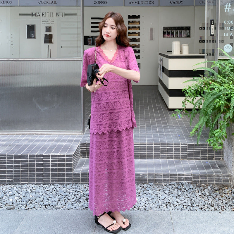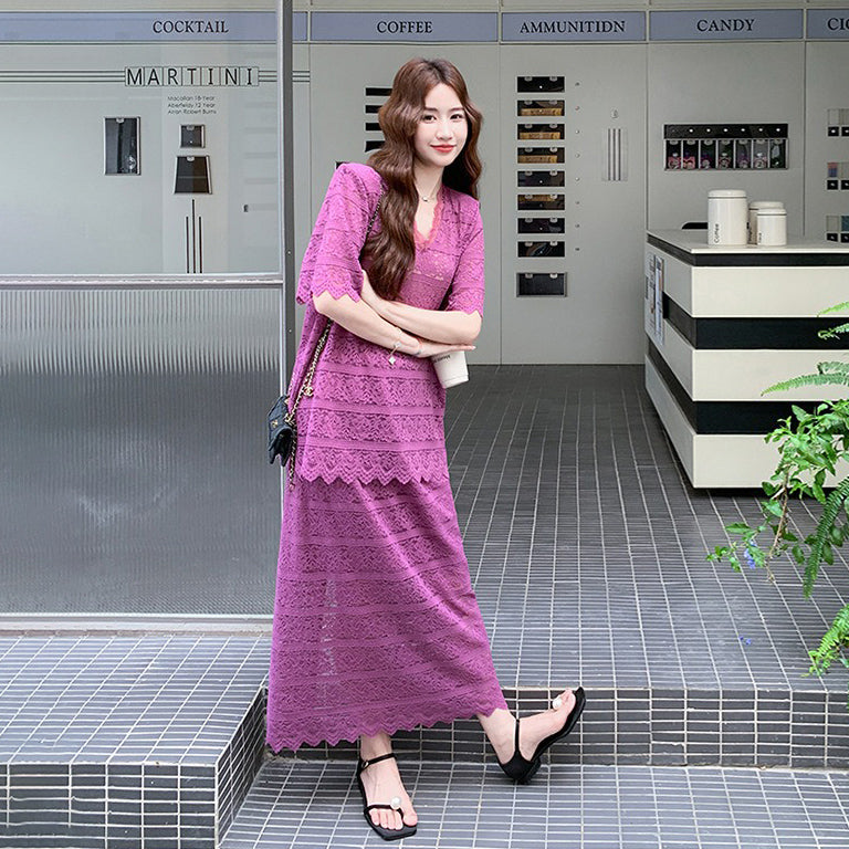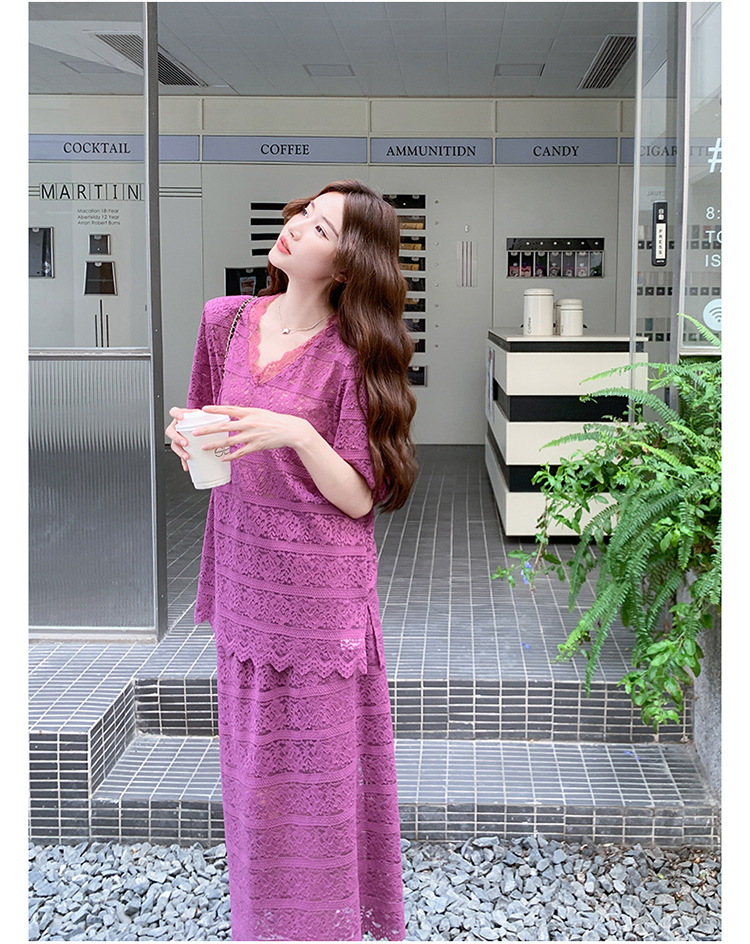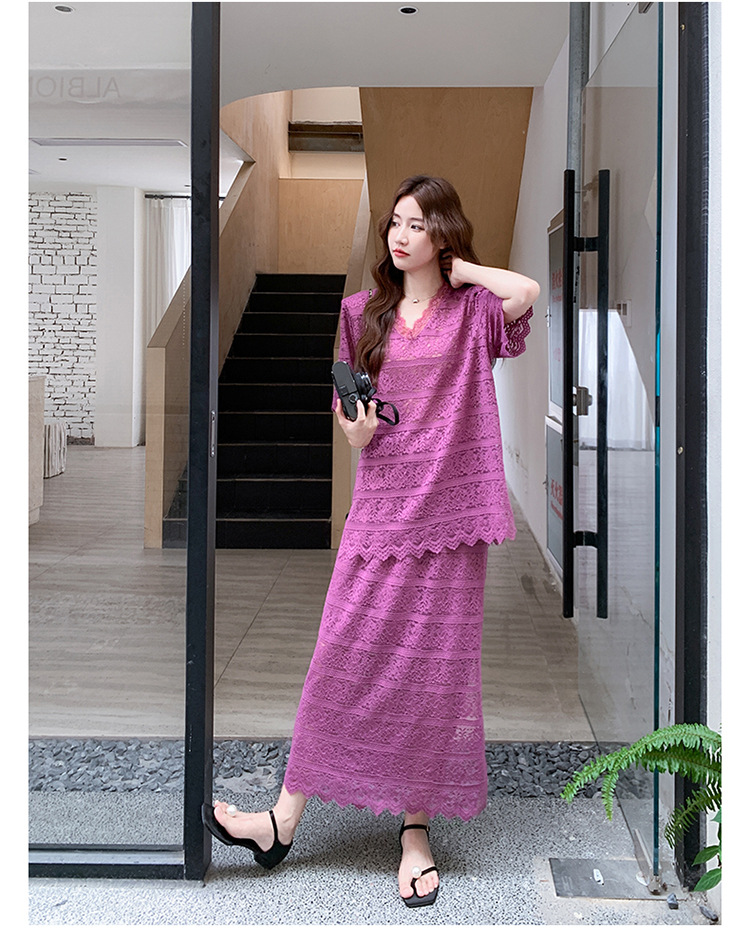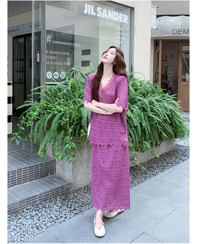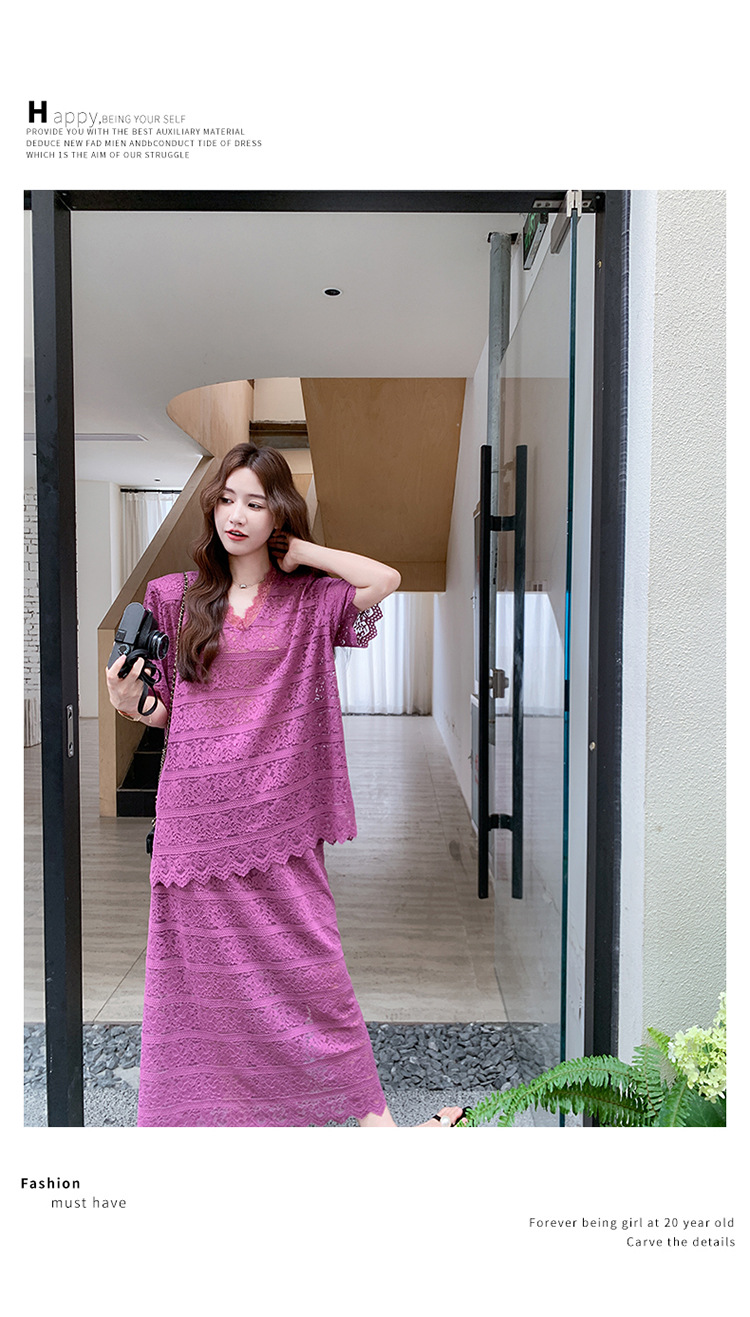 2点セット!【セットアップ】通勤気質 Vネックレース透かし彫りトップス+万能ハイウエストスカート上下セット【SNシリーズ】