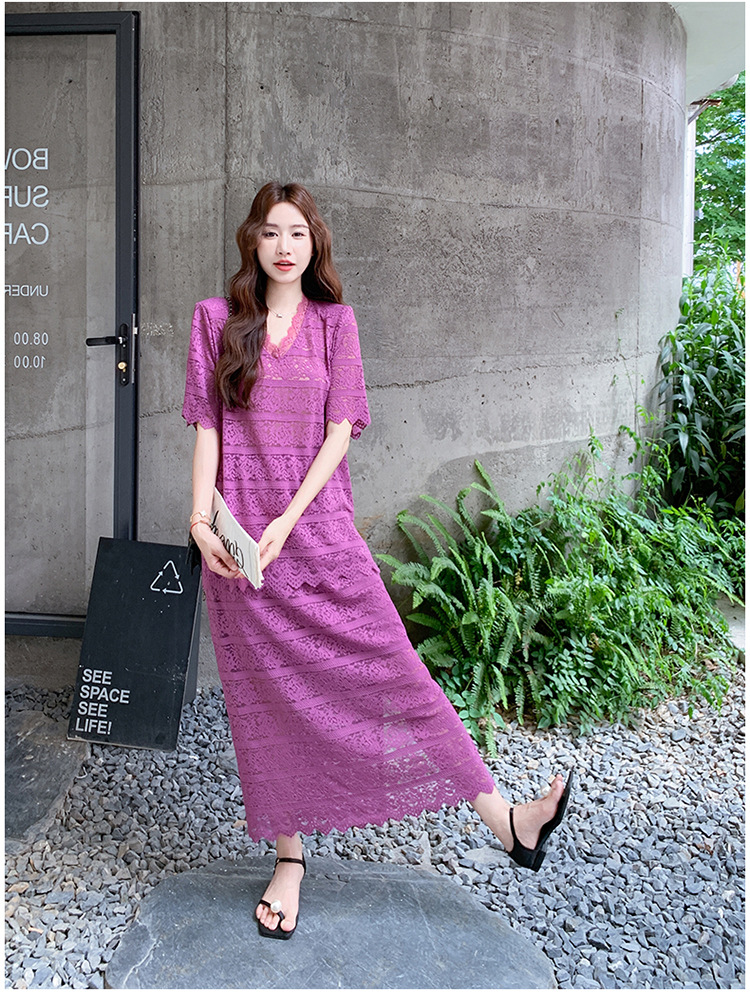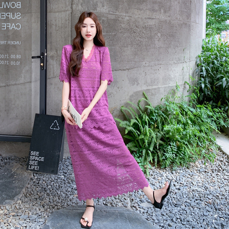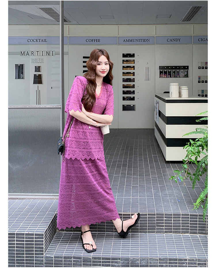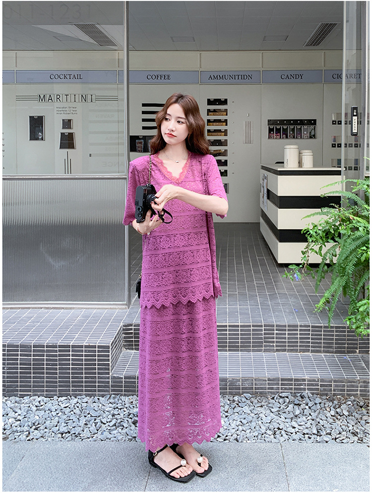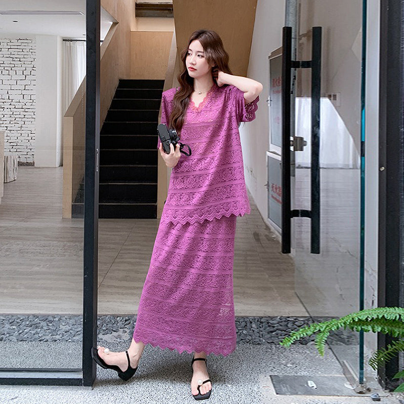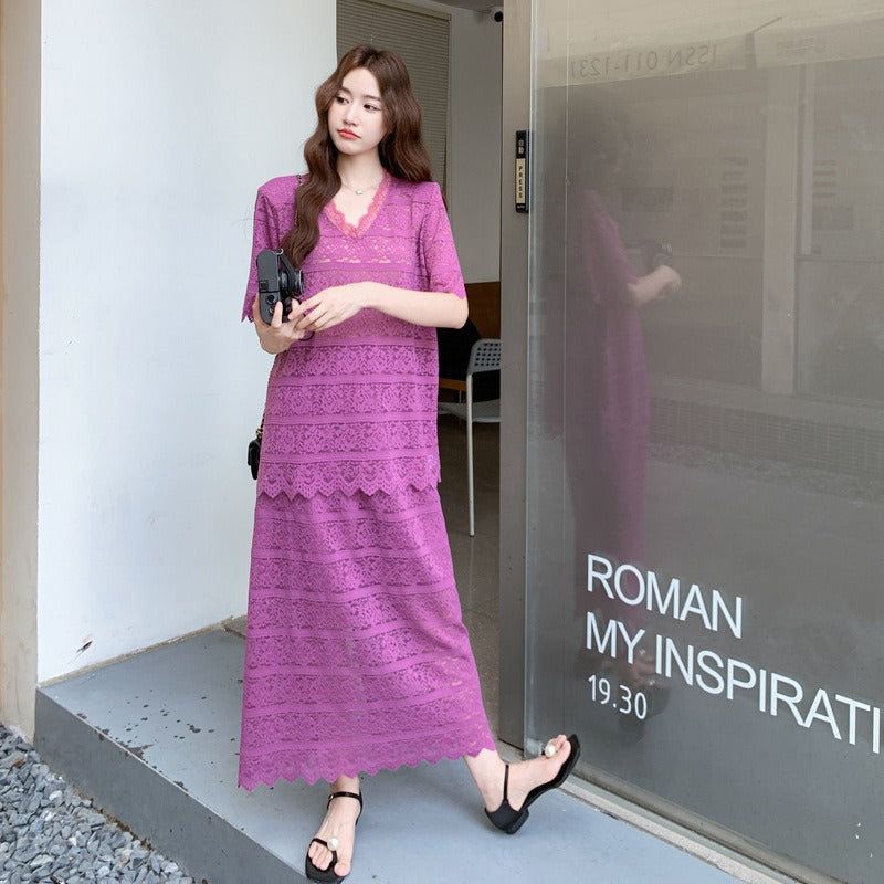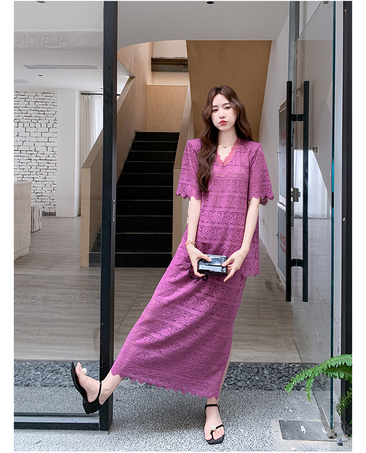 2点セット!【セットアップ】通勤気質 Vネックレース透かし彫りトップス+万能ハイウエストスカート上下セット【SNシリーズ】