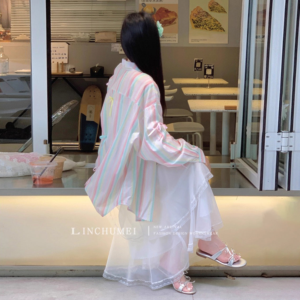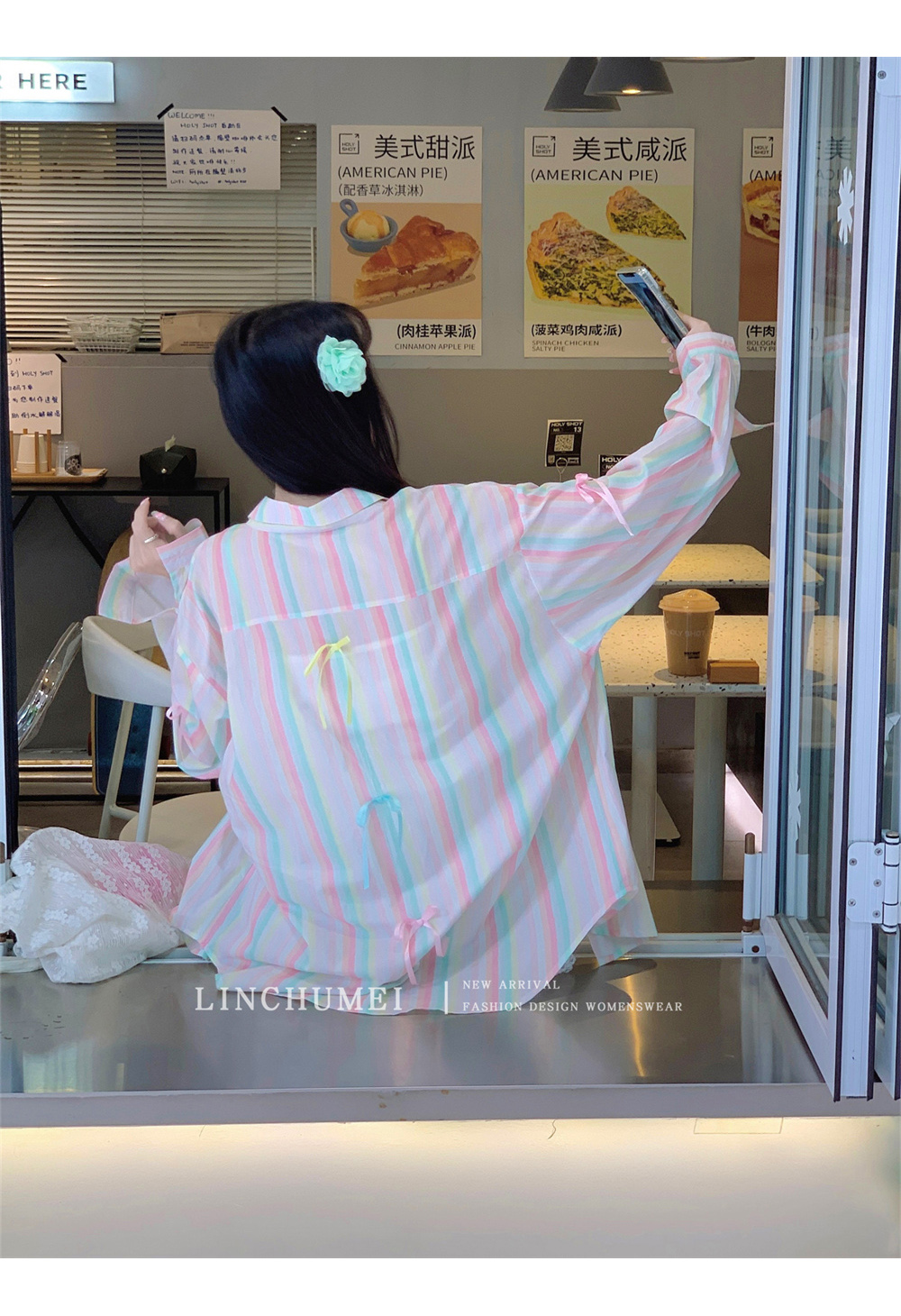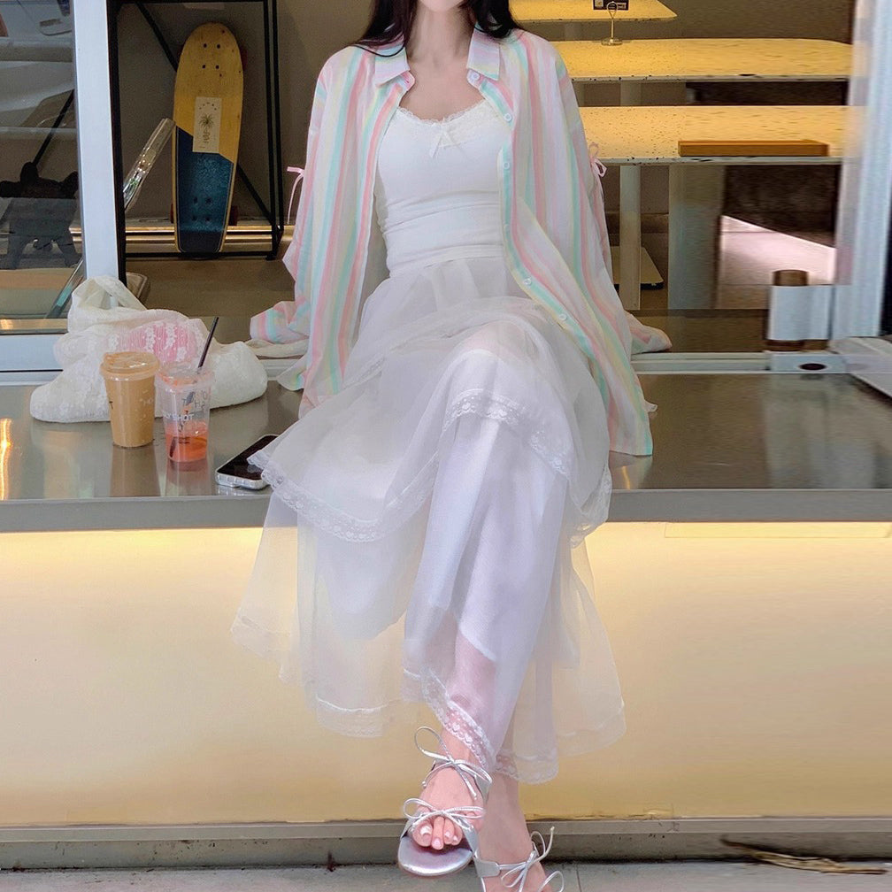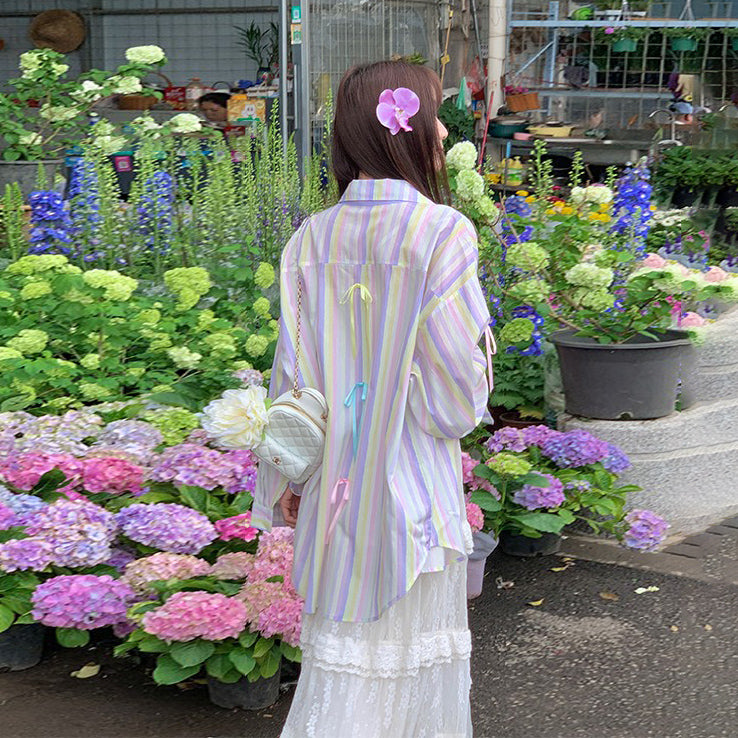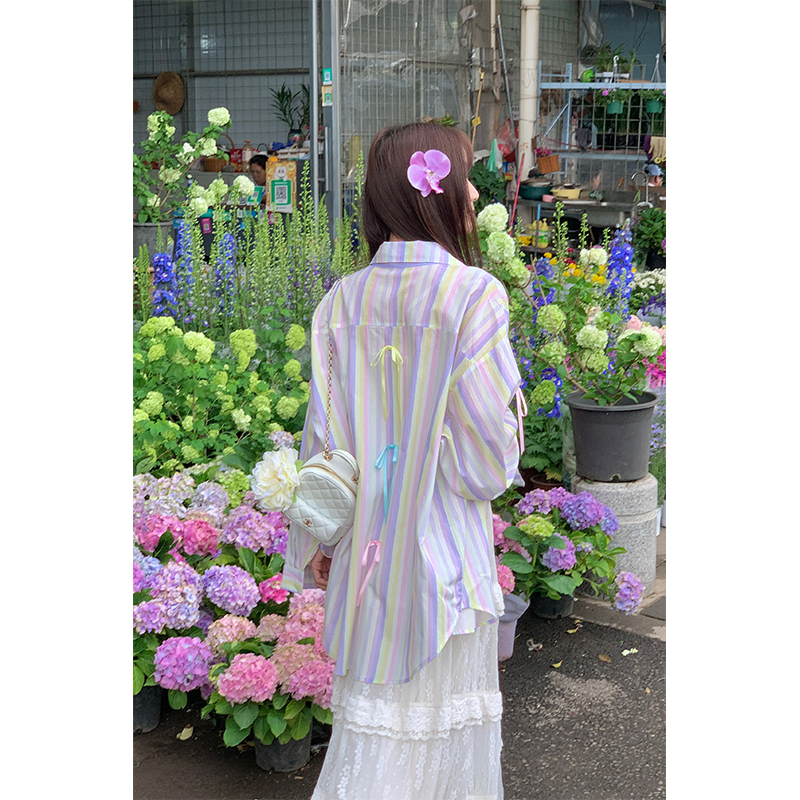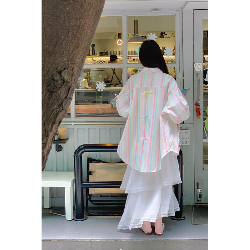 【アウター】リボンストライプ UVカットシャツ 春夏 韓国風 ゆったり スイート【SHシリーズ】
