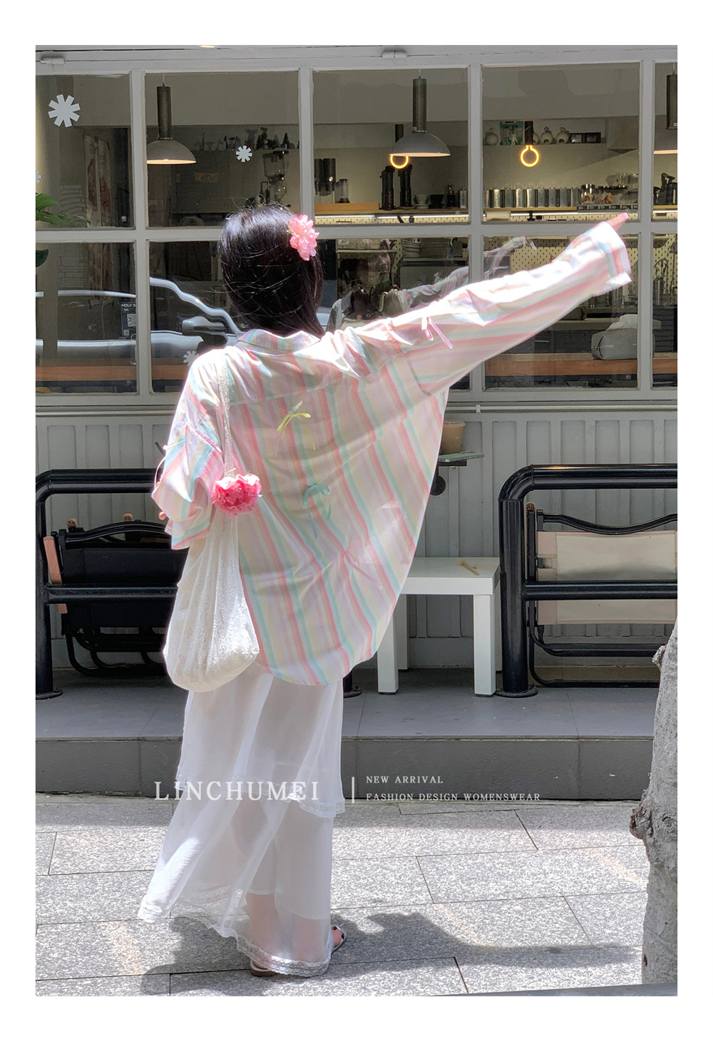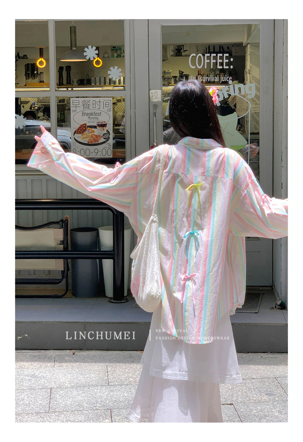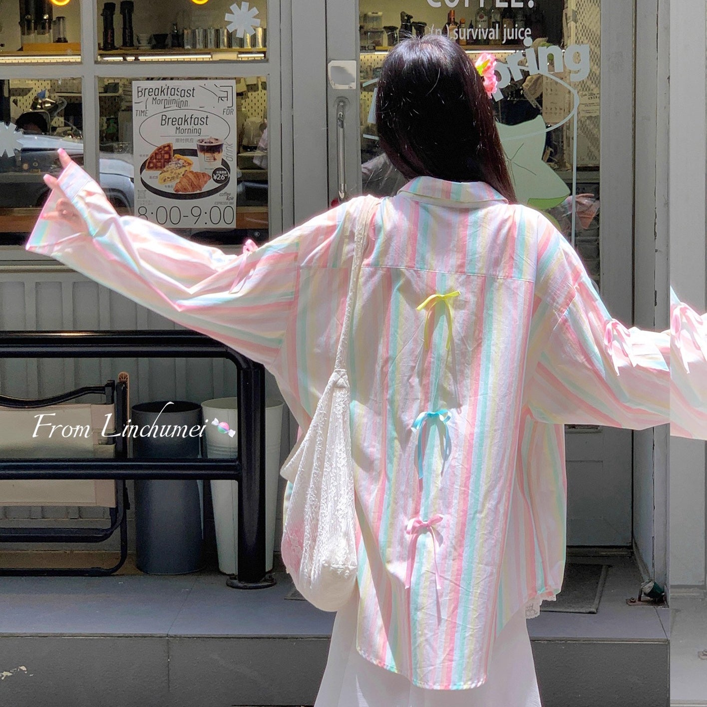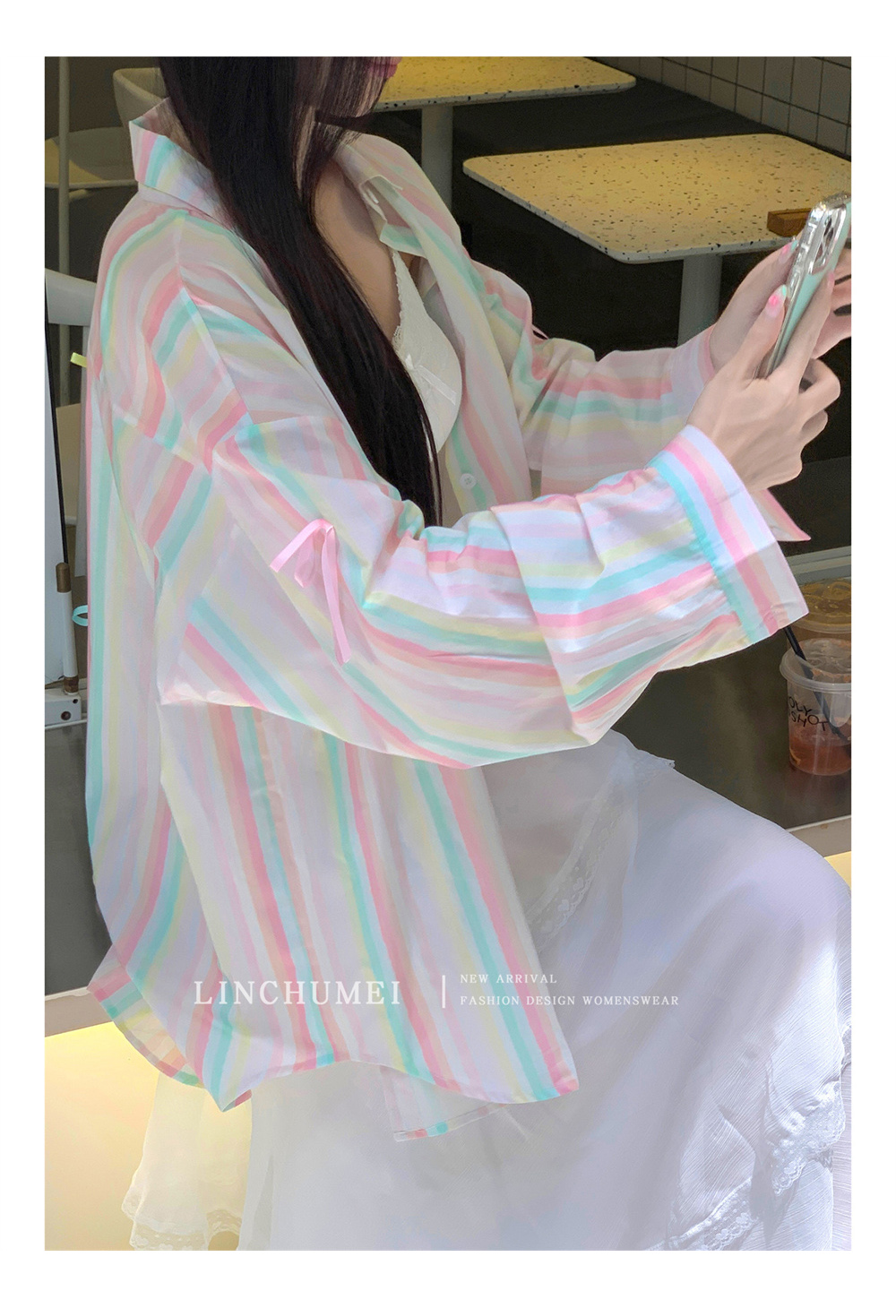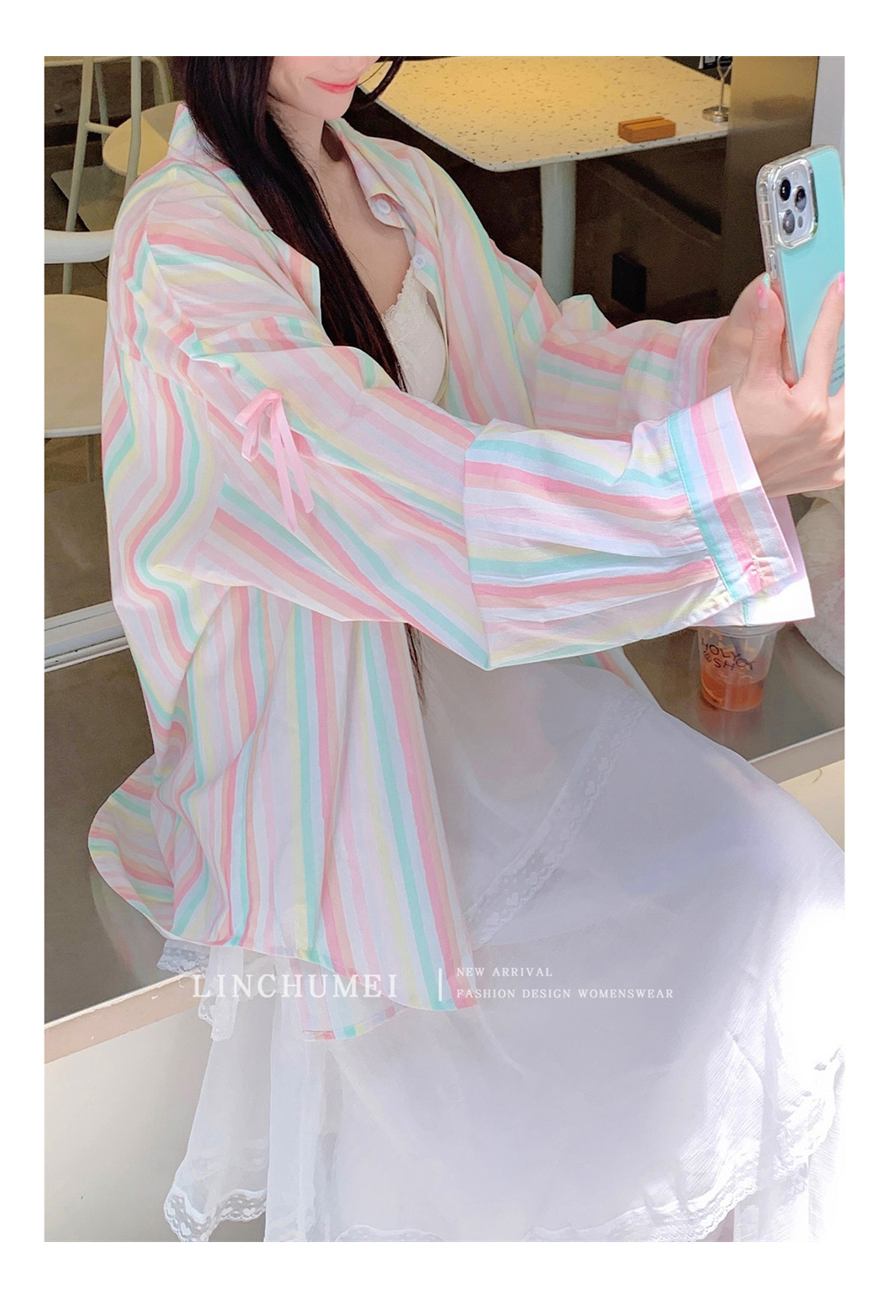 【商品名】【アウター】リボンストライプ UVカットシャツ 春夏 韓国風 ゆったり スイート【SHシリーズ】