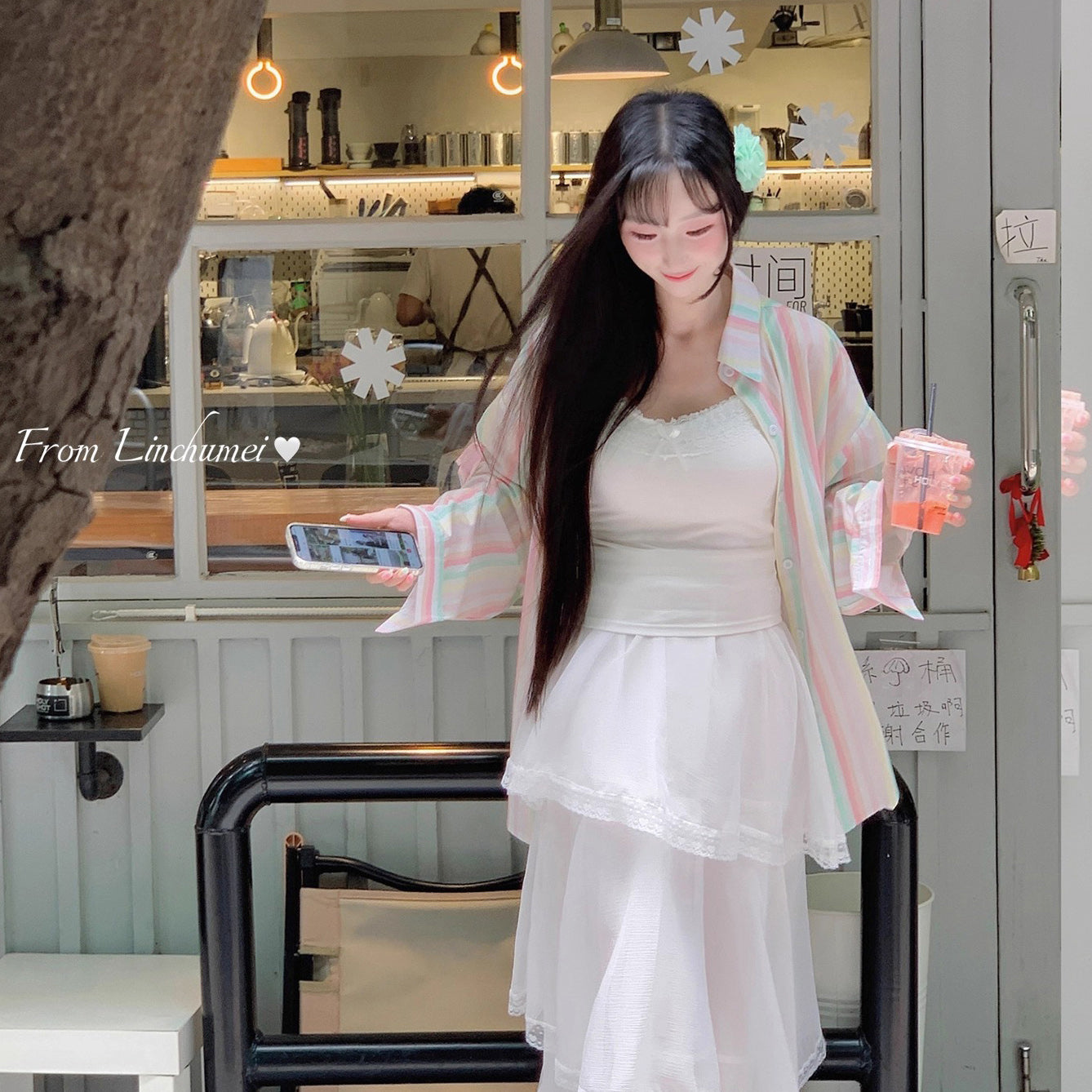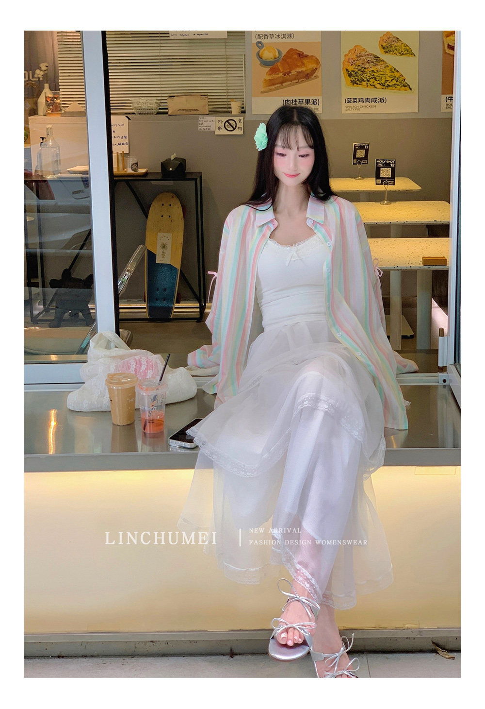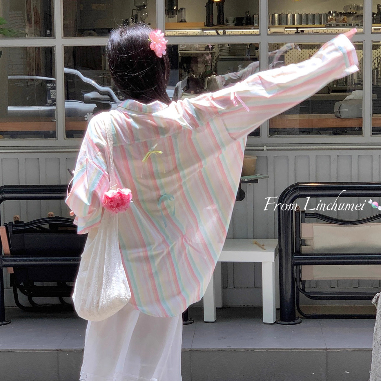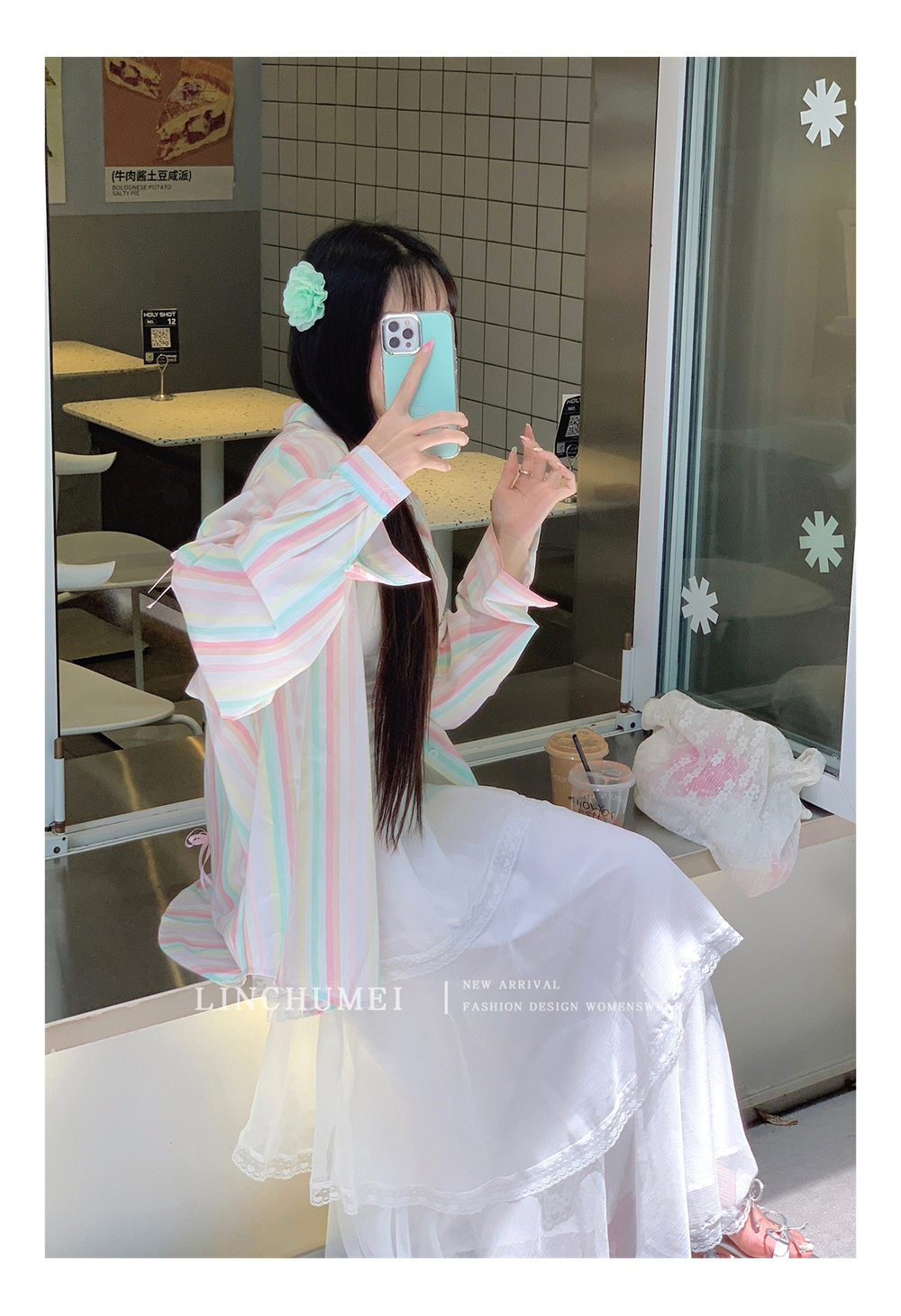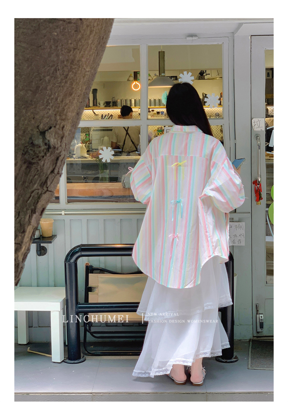 【商品名】【アウター】リボンストライプ UVカットシャツ 春夏 韓国風 ゆったり スイート【SHシリーズ】