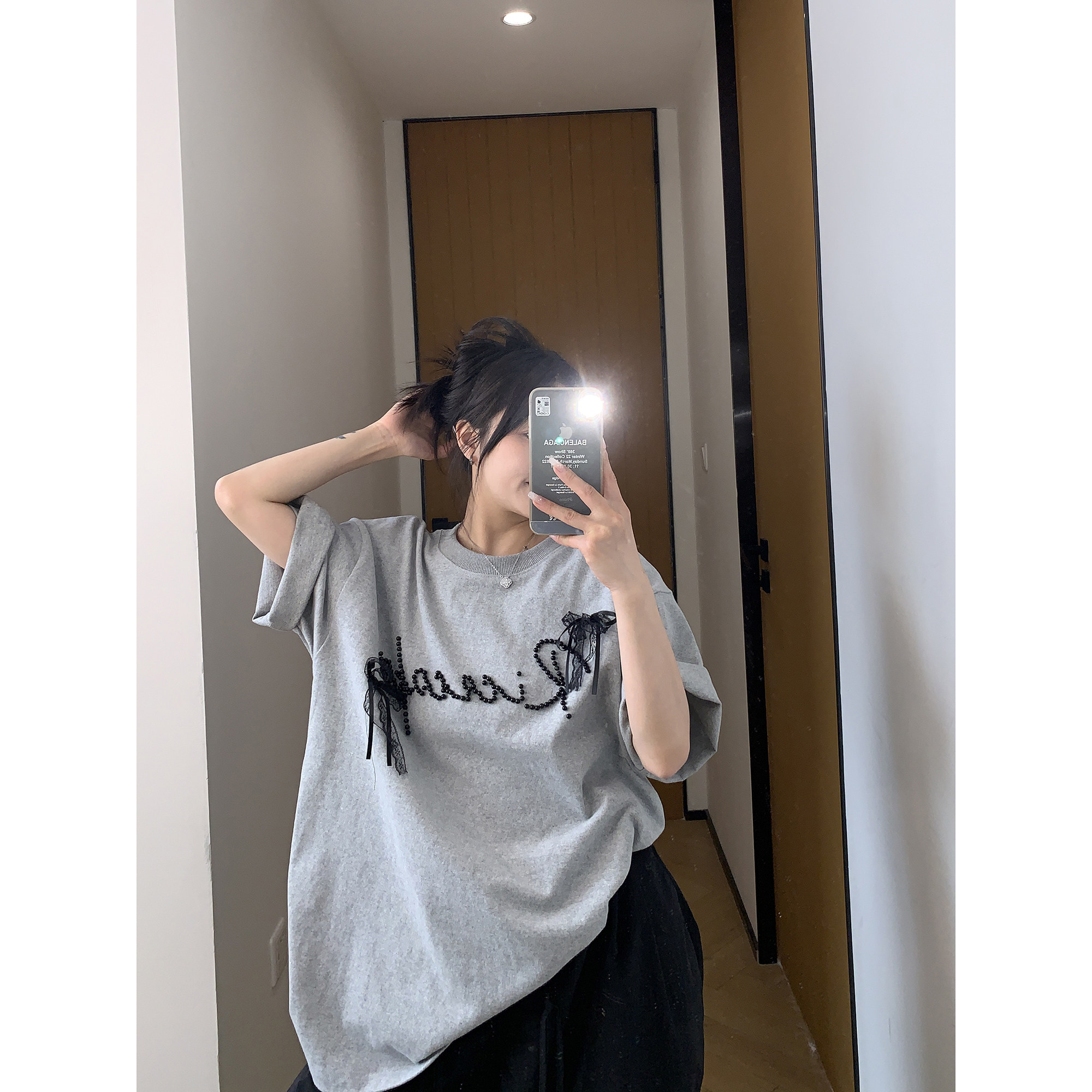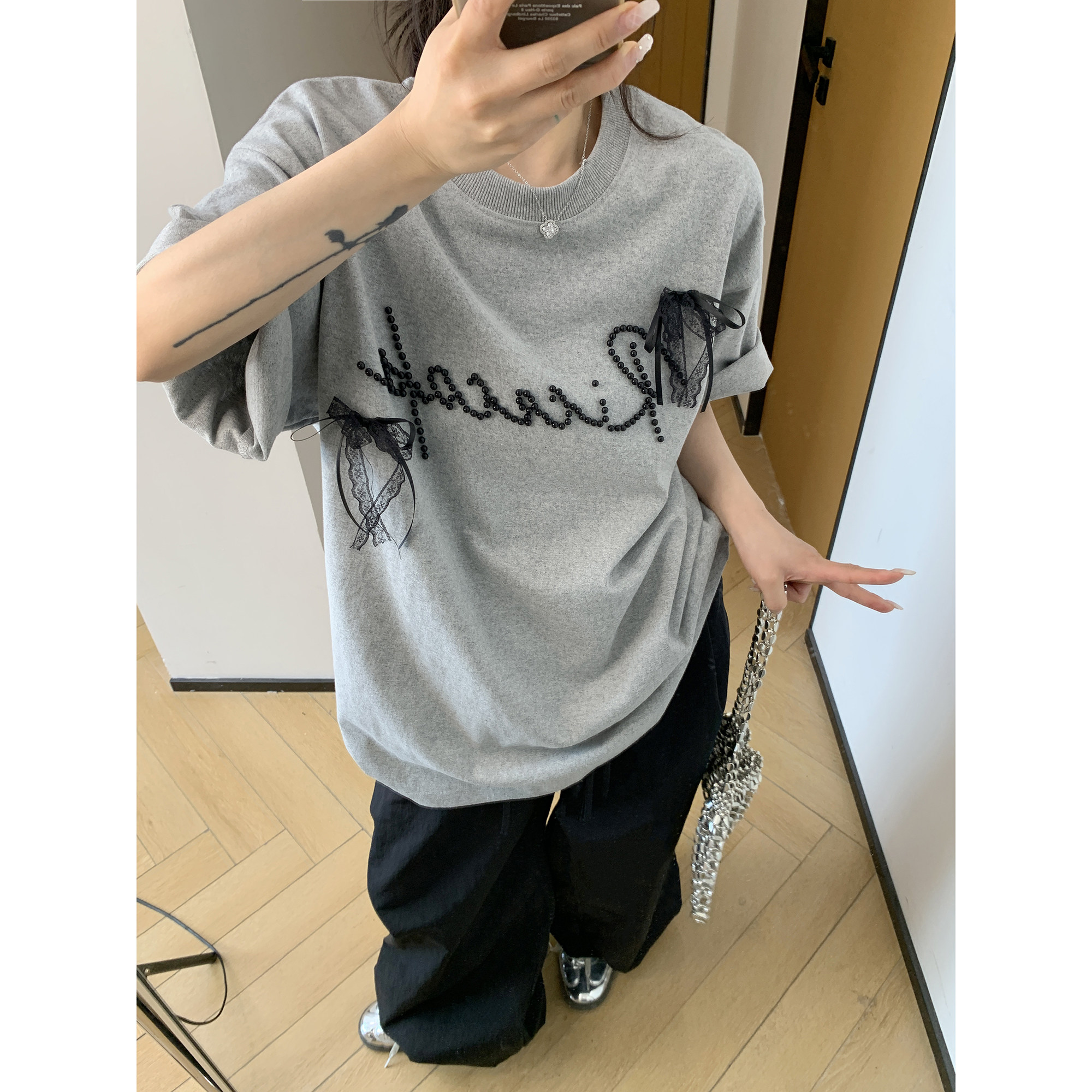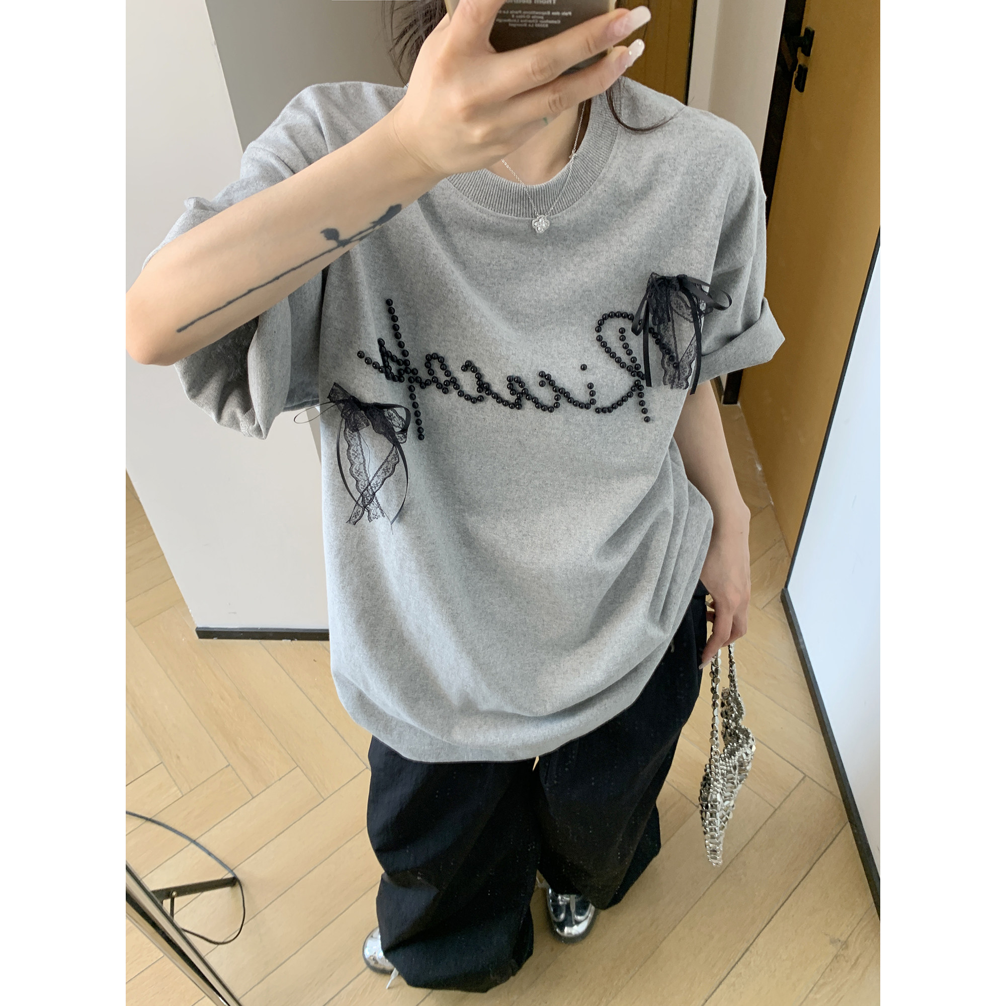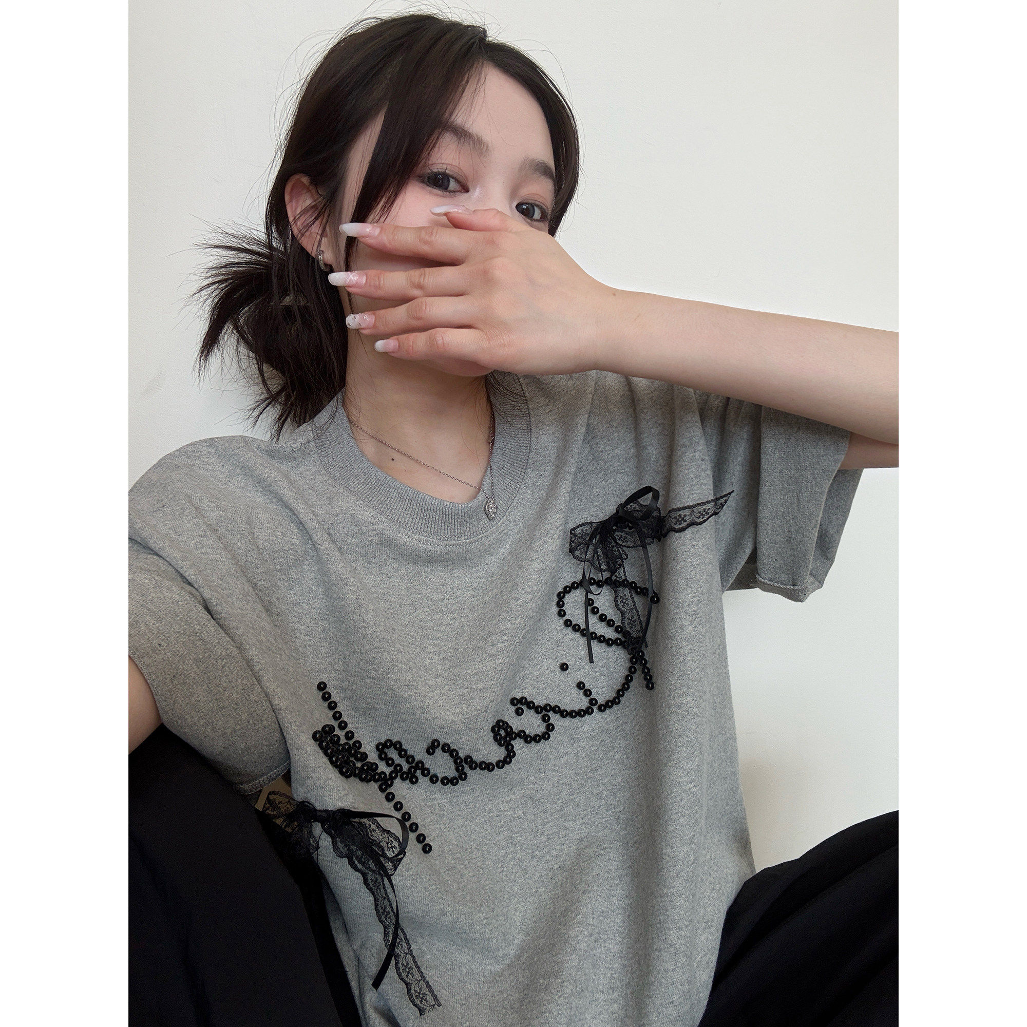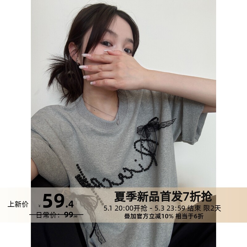 【トップス】夏 リボン ビジュー レース ルーズ 半袖 Tシャツ 【FCシリーズ】
