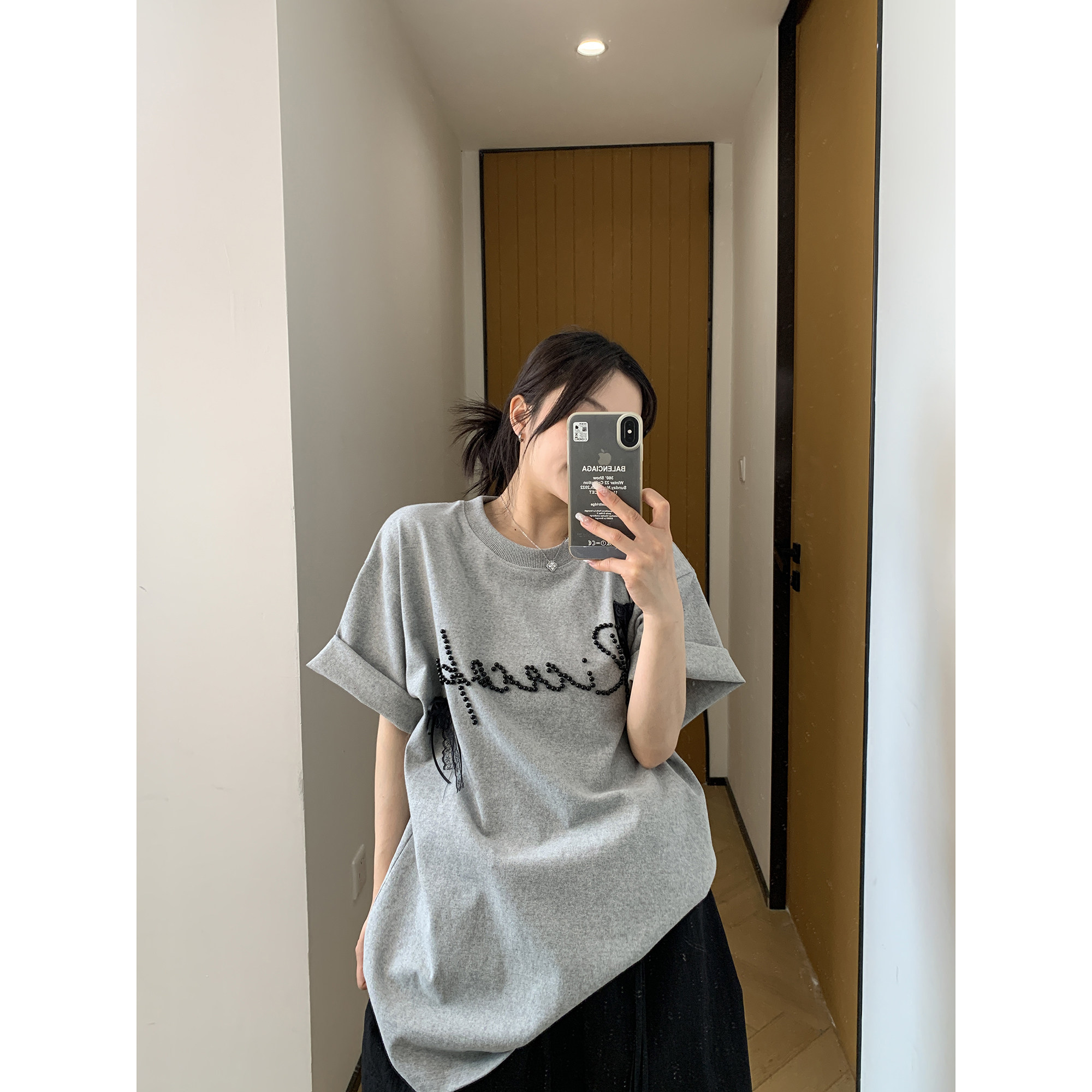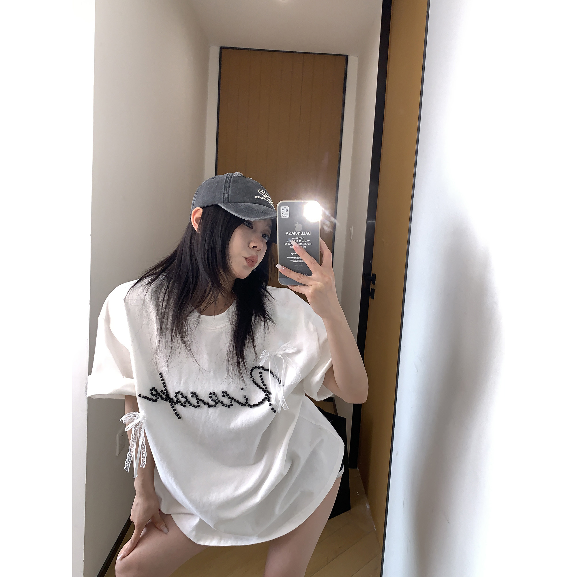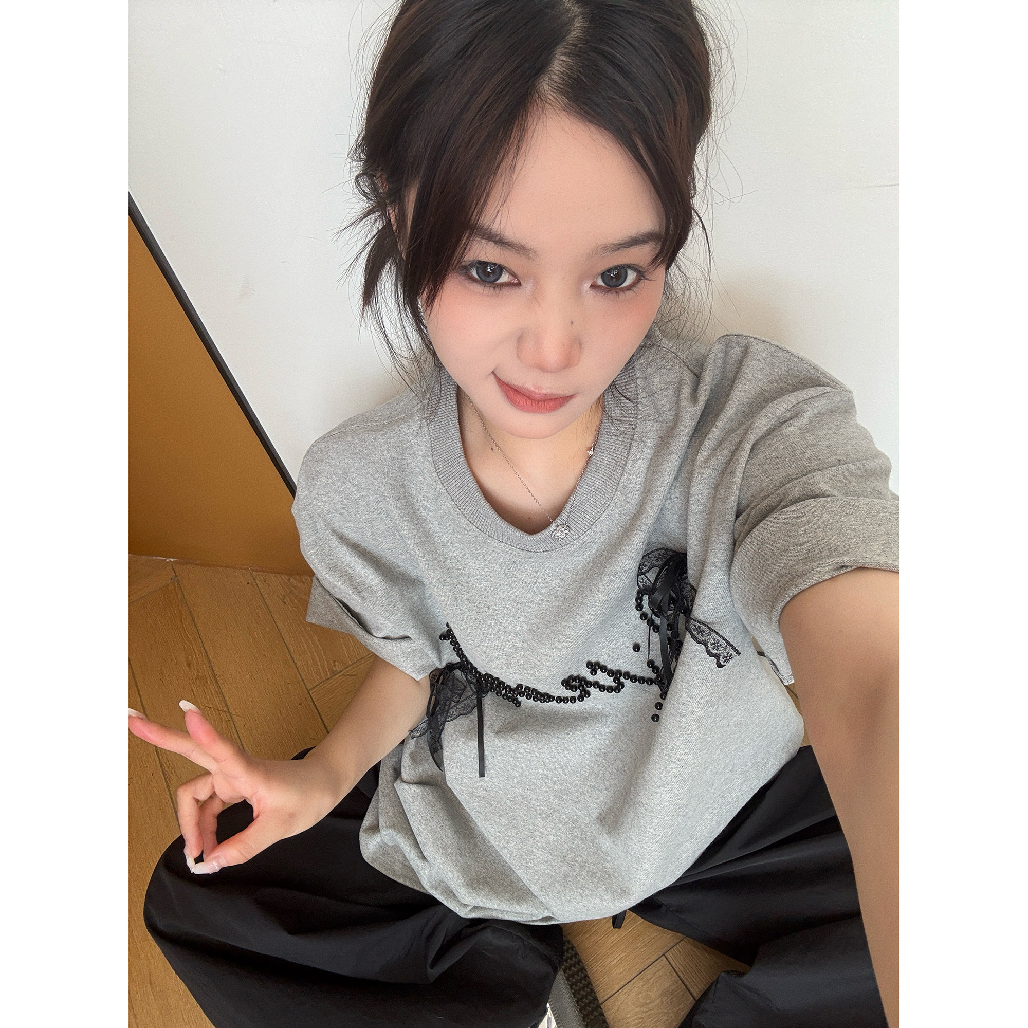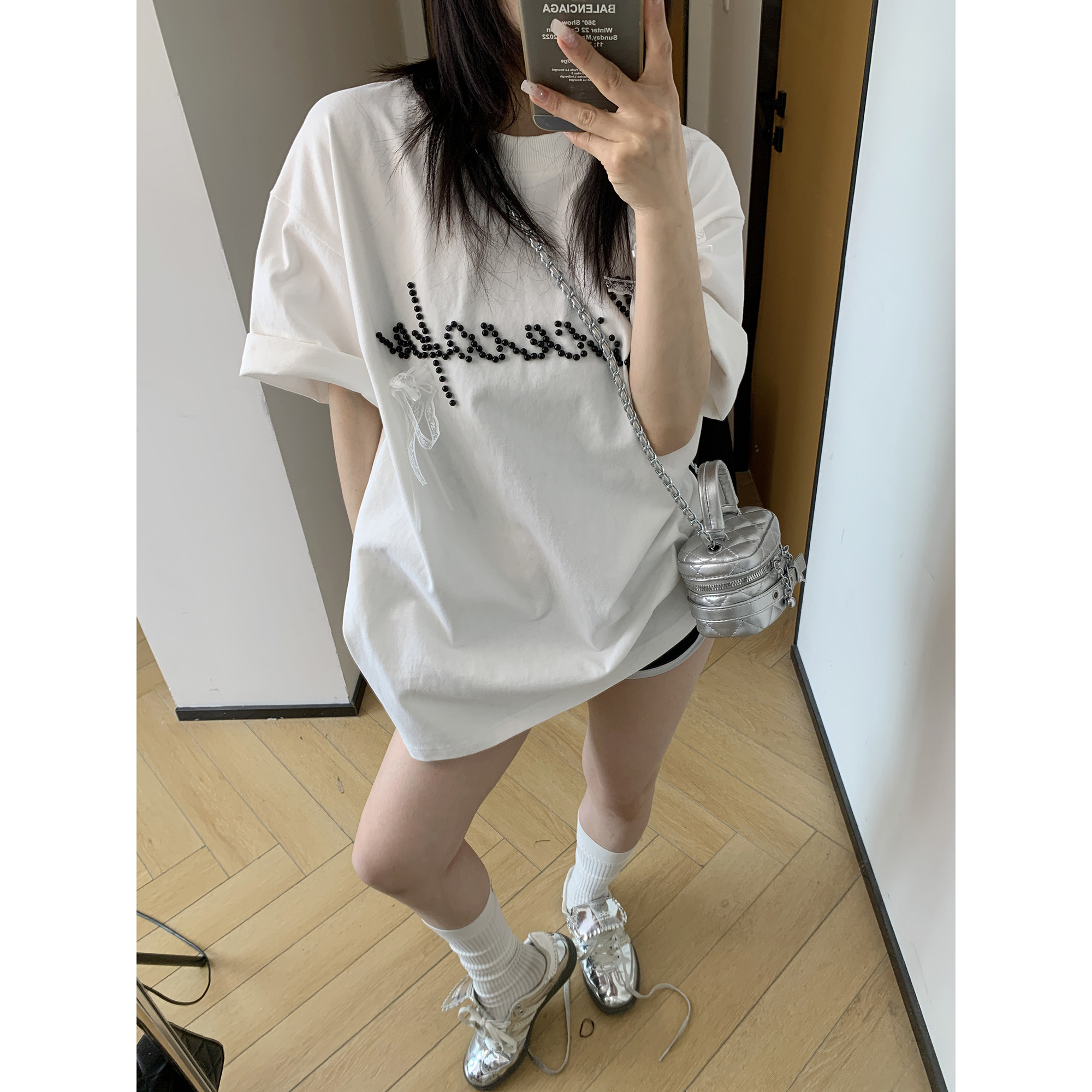 【トップス】夏 リボン ビジュー レース ルーズ 半袖 Tシャツ 【FCシリーズ】