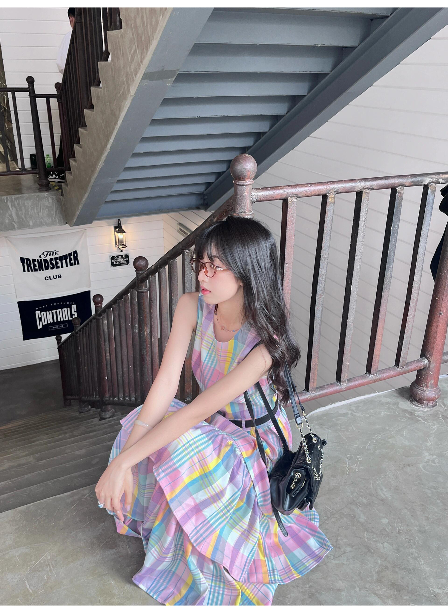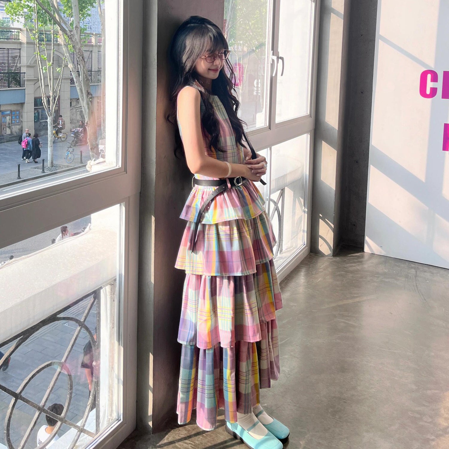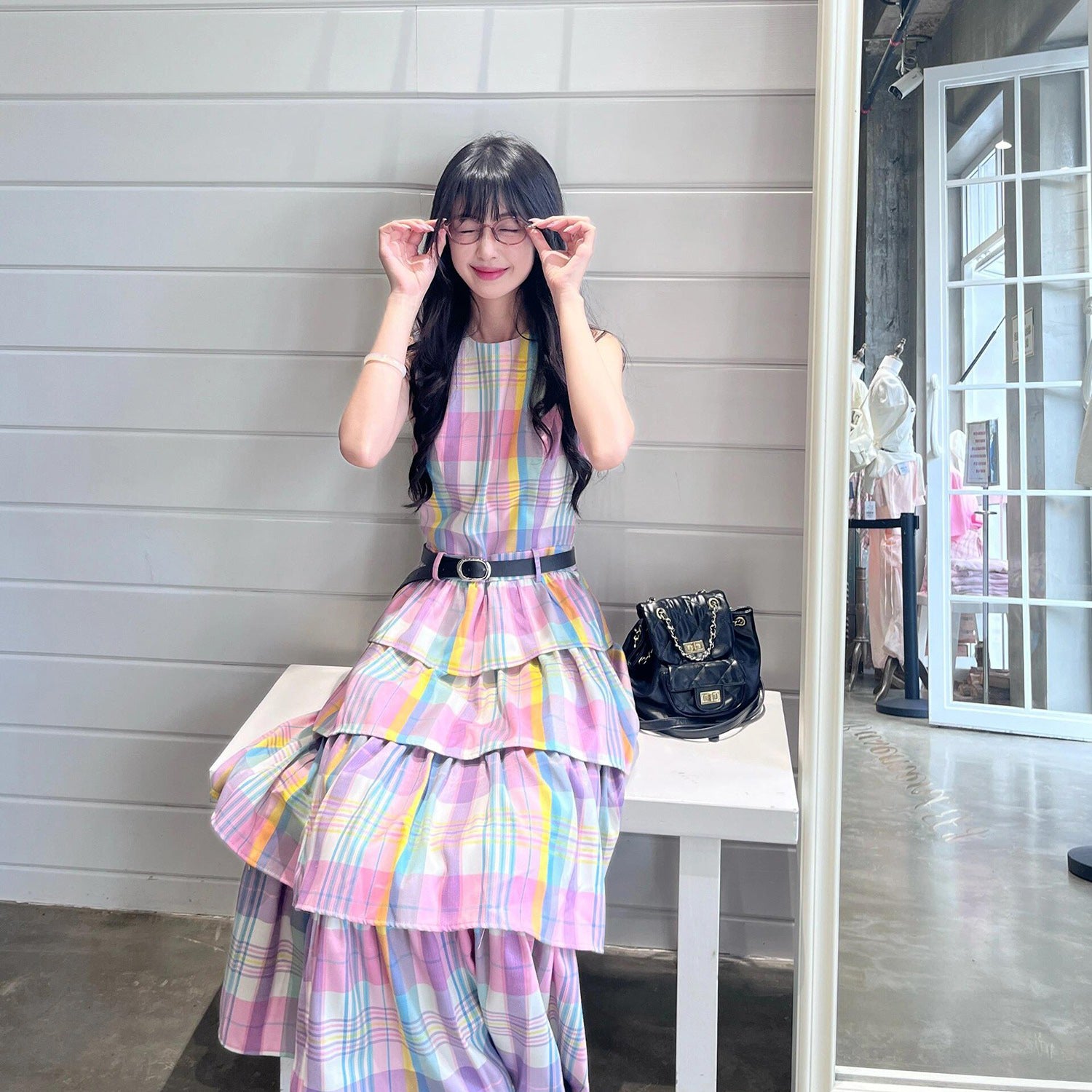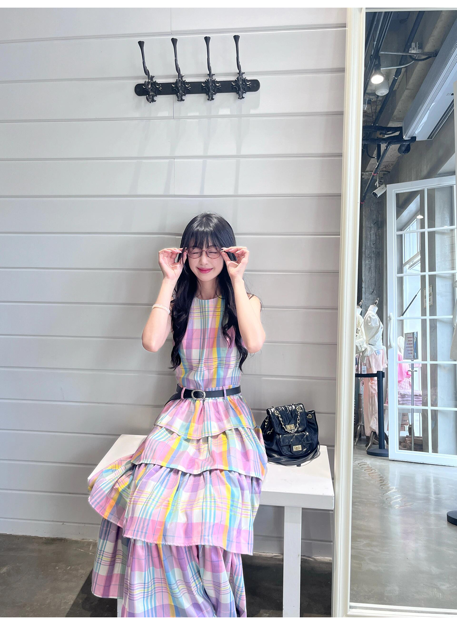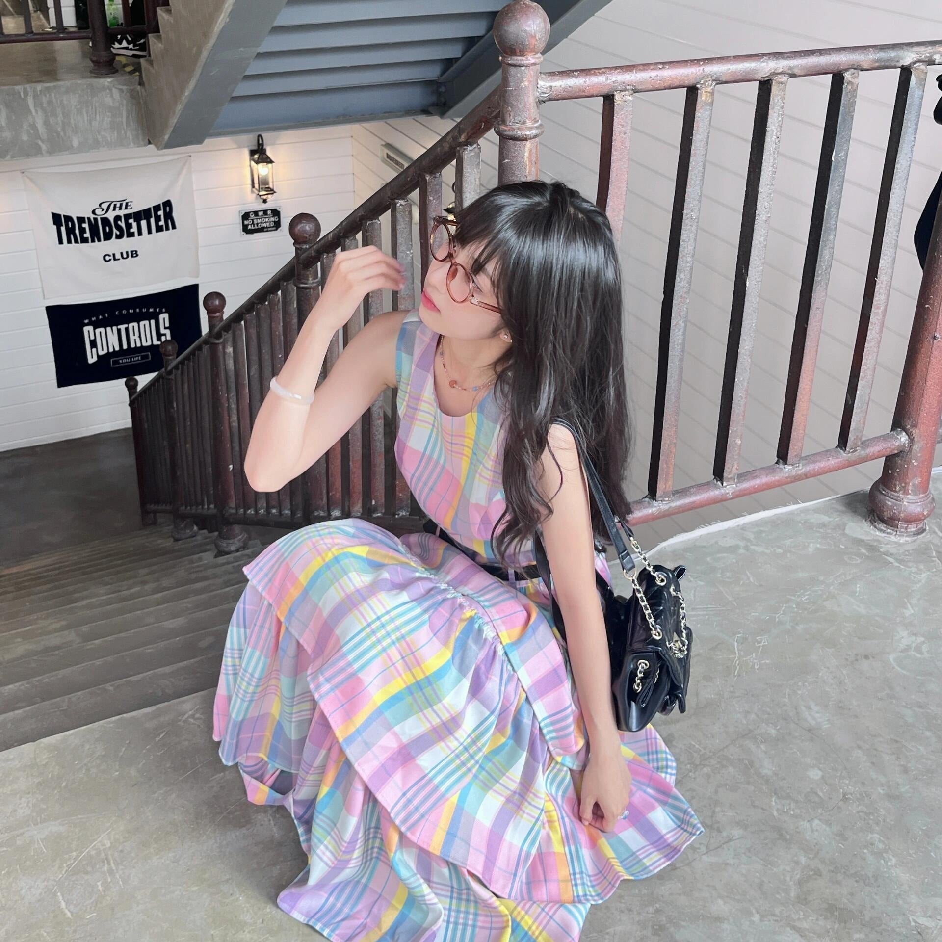 【商品名】【ワンピース】 レインボーチェック ノースリーブ ティアードワンピース 夏 レディース フェミニン 体型カバー リゾート風 着痩せ ゆったり Aライン 大人可愛い バカンス 海辺旅行【SHシリーズ】