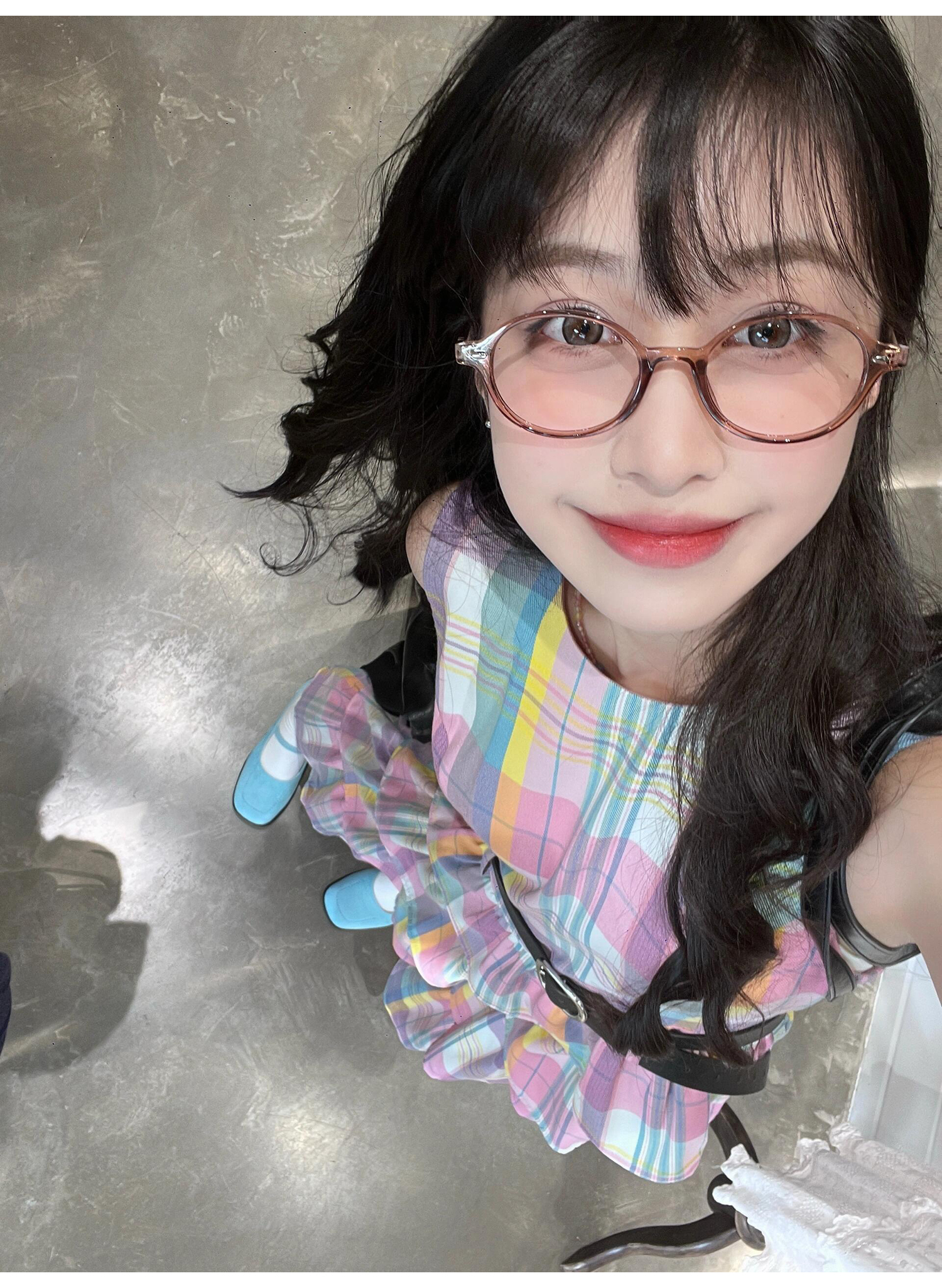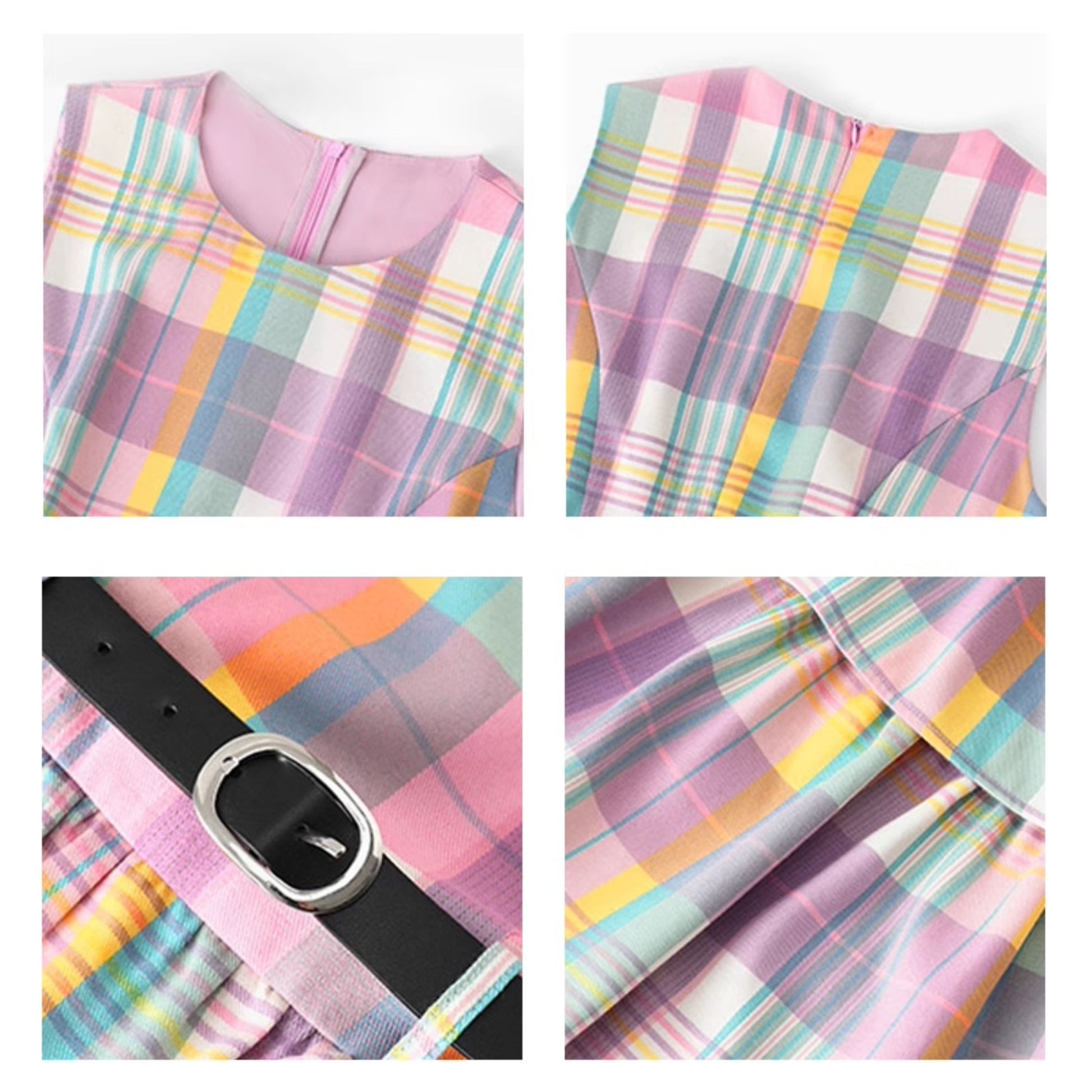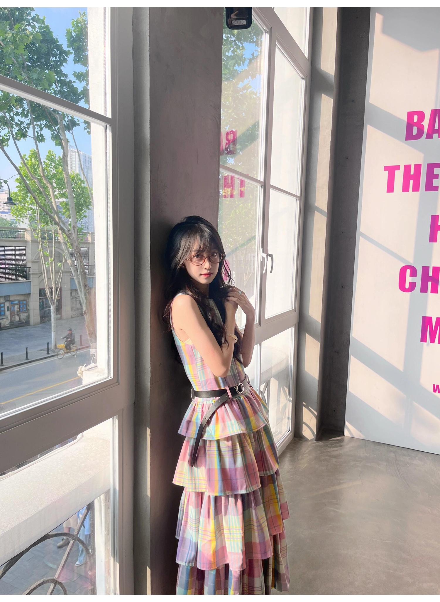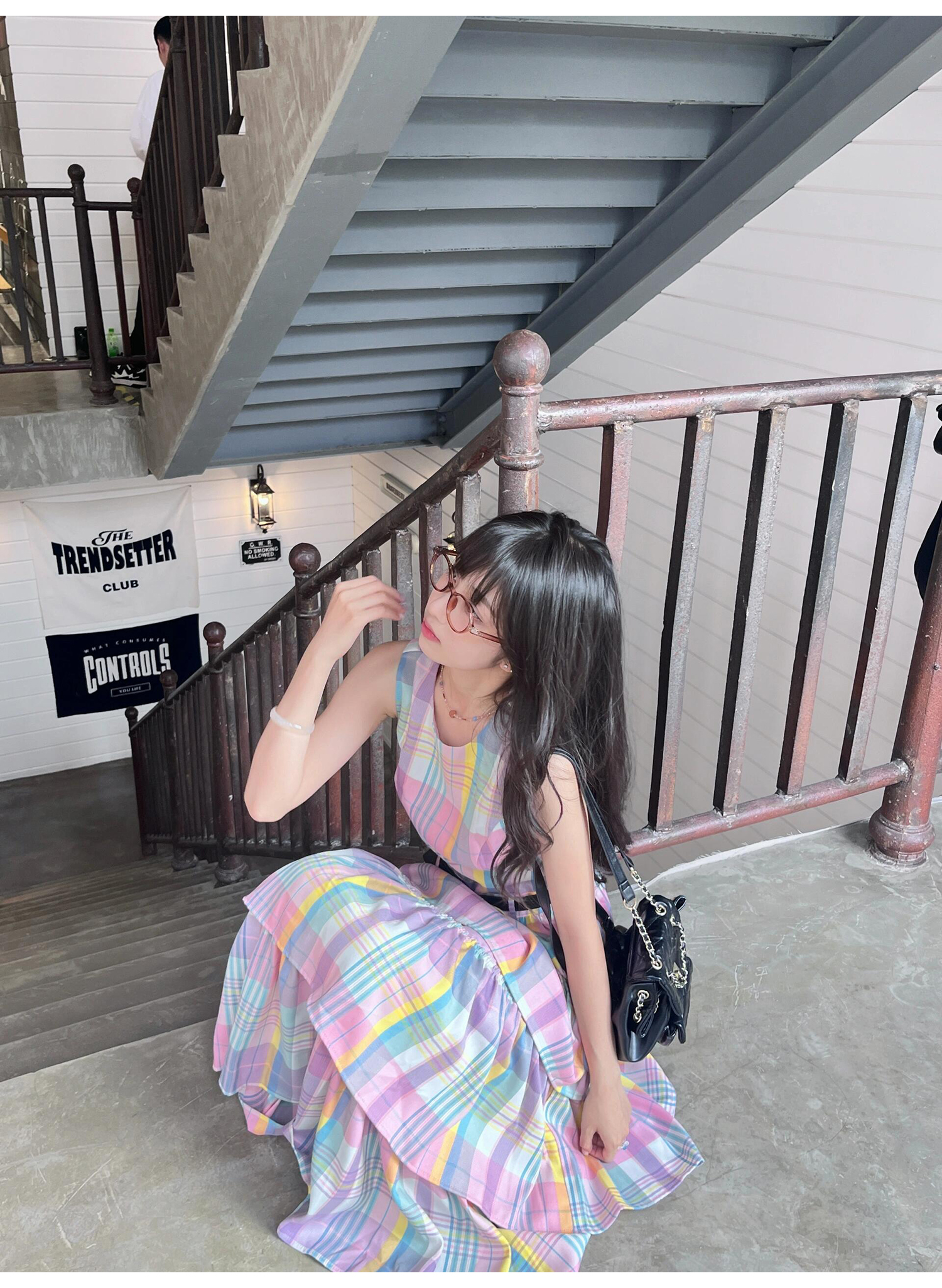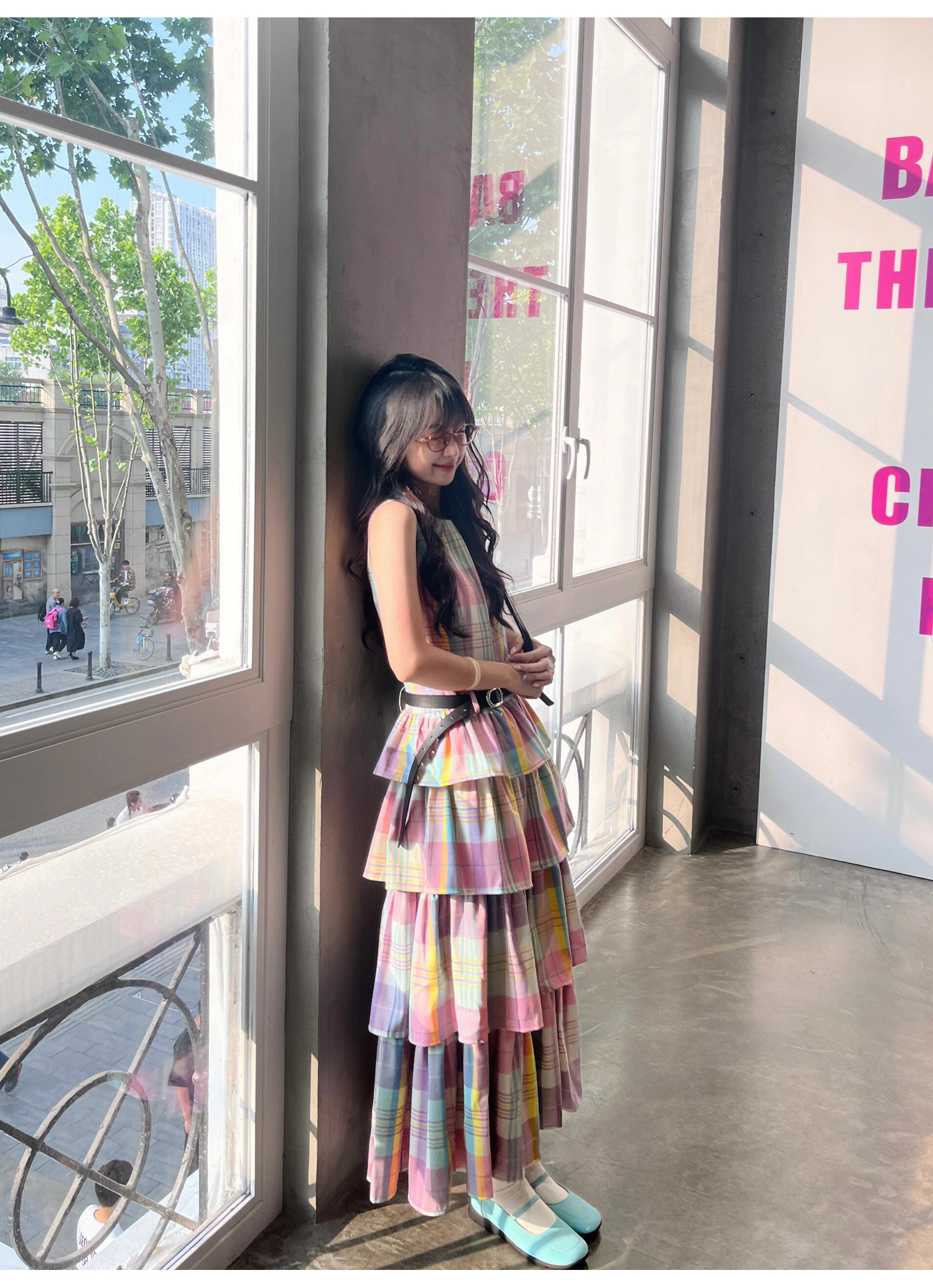 【商品名】【ワンピース】 レインボーチェック ノースリーブ ティアードワンピース 夏 レディース フェミニン 体型カバー リゾート風 着痩せ ゆったり Aライン 大人可愛い バカンス 海辺旅行【SHシリーズ】