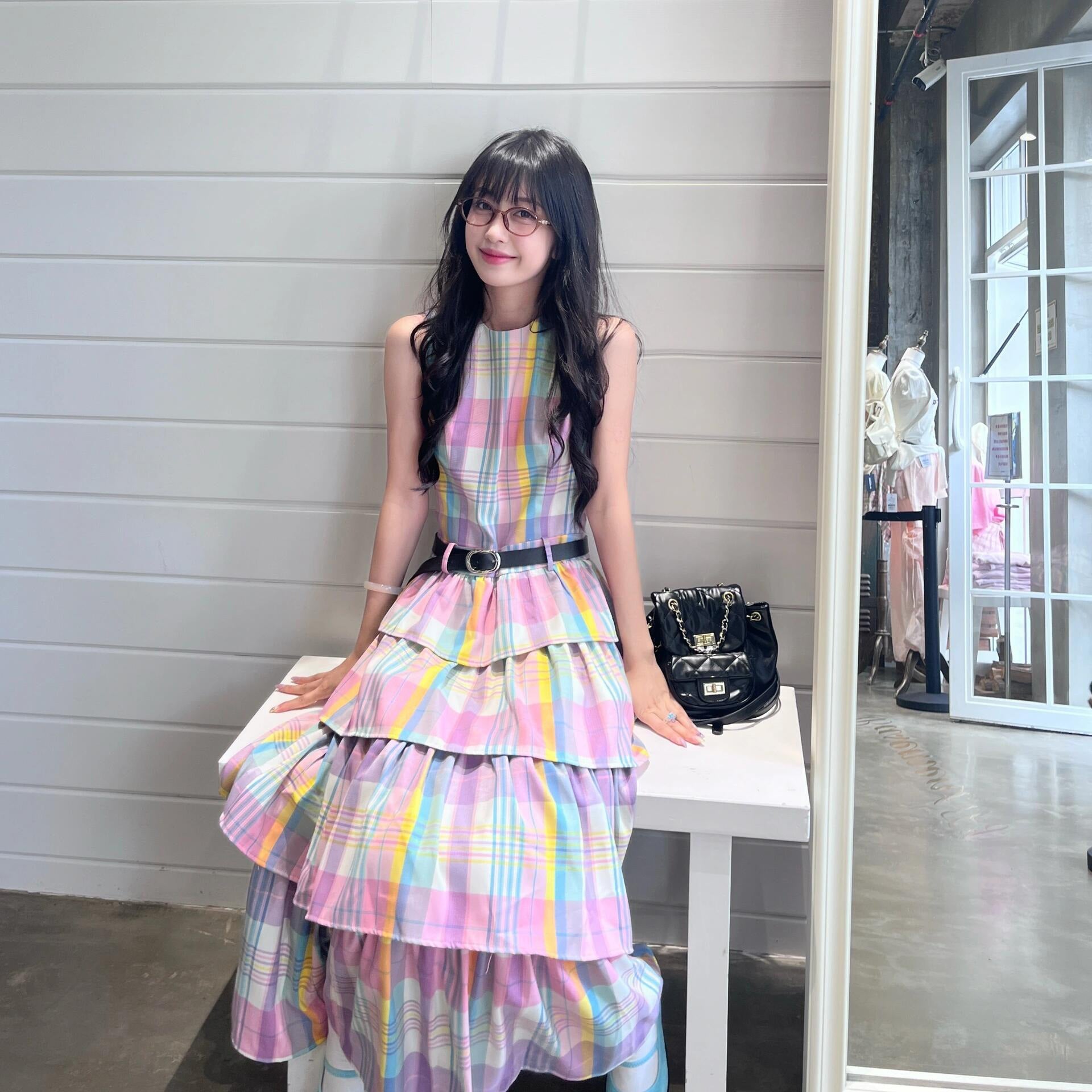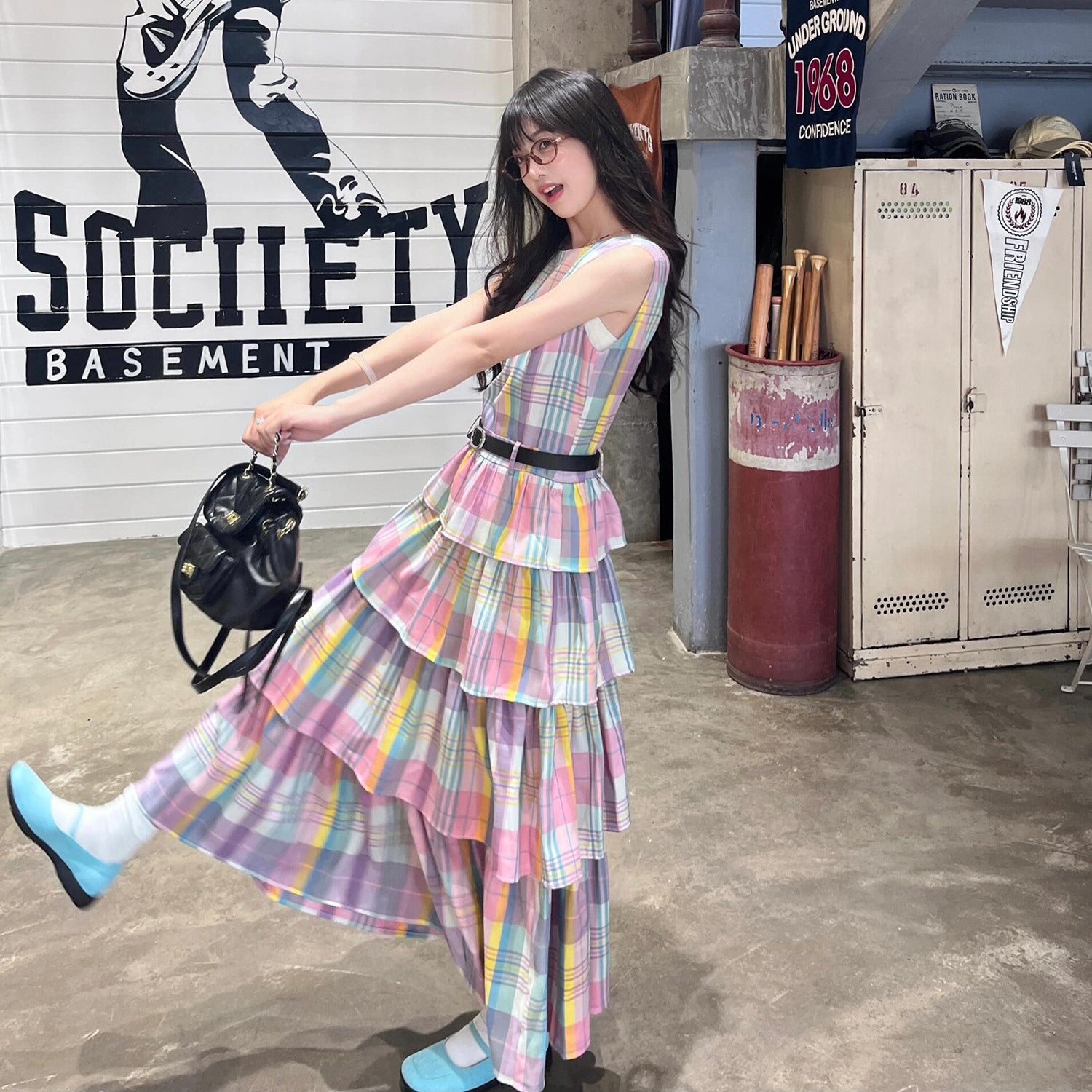【ワンピース】 レインボーチェック ノースリーブ ティアードワンピース 夏 レディース フェミニン 体型カバー リゾート風 着痩せ ゆったり Aライン 大人可愛い バカンス 海辺旅行【SHシリーズ】