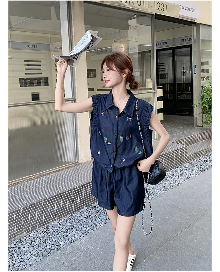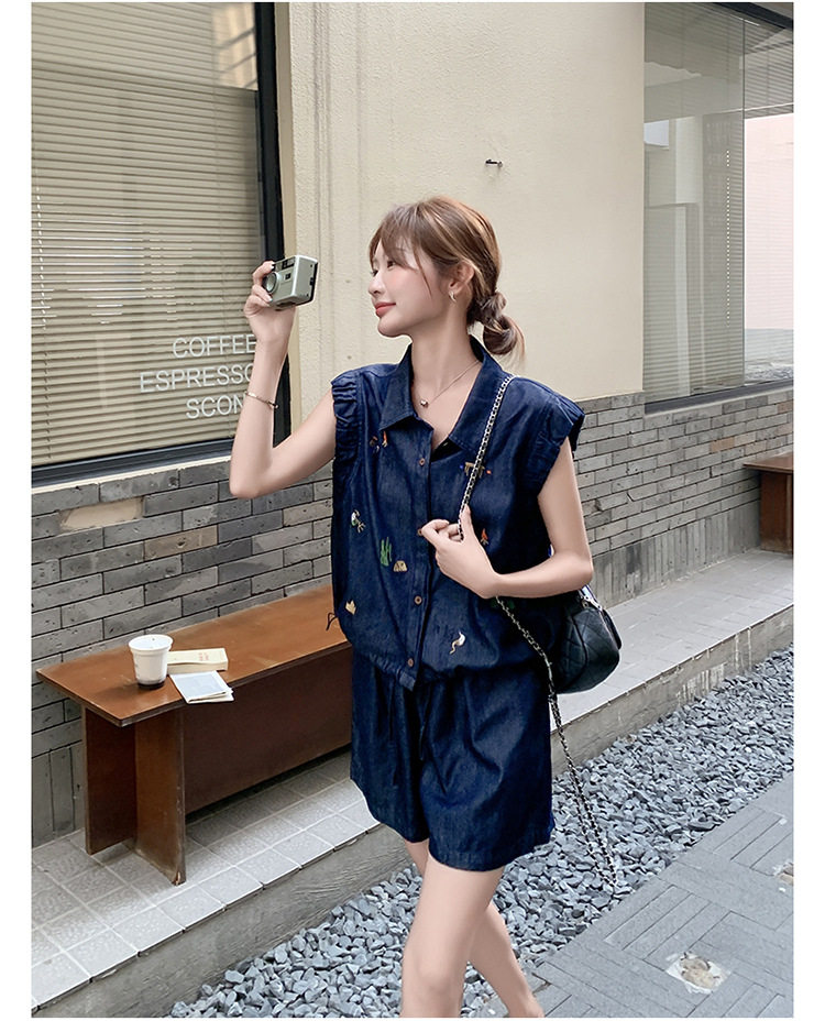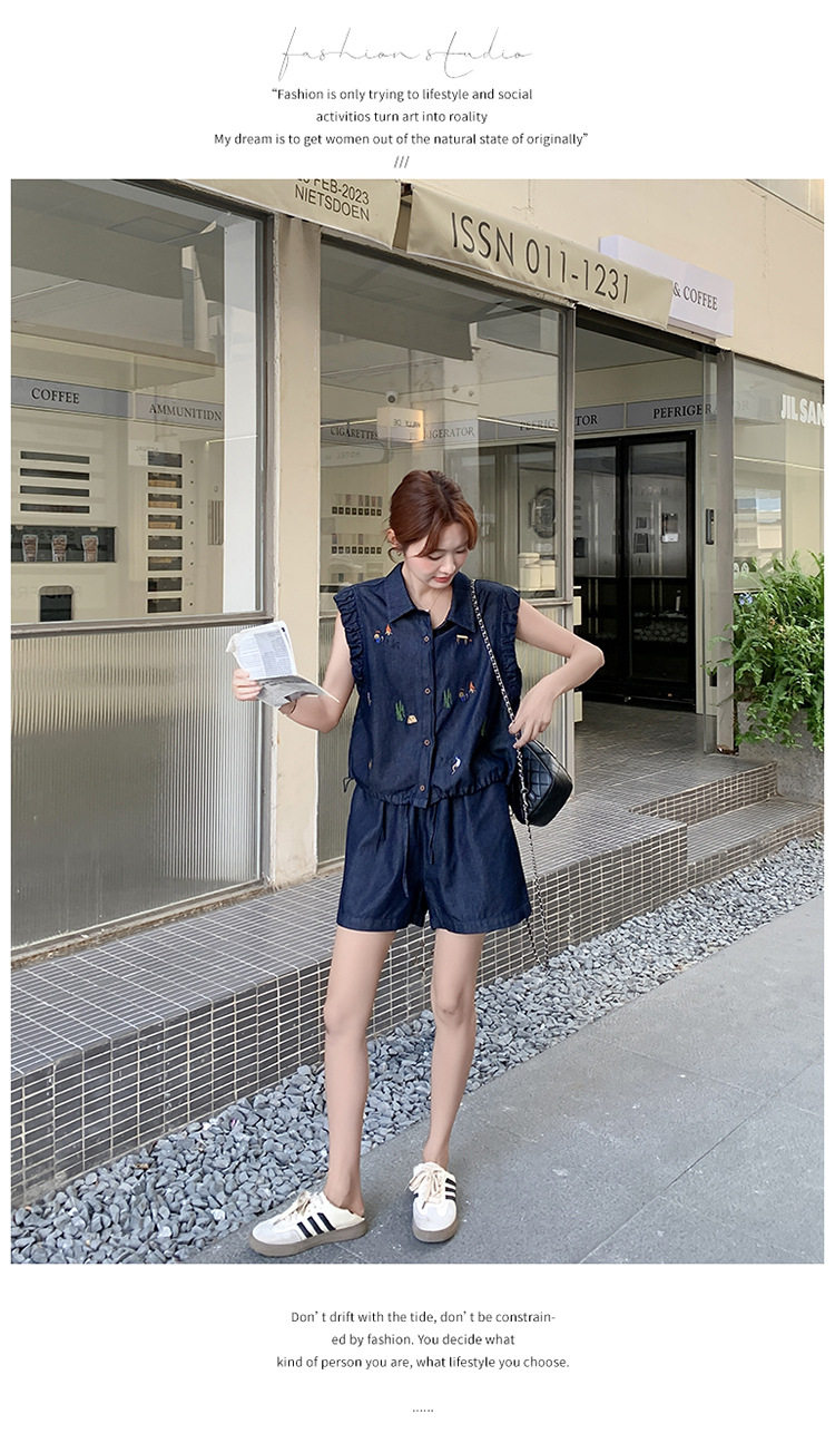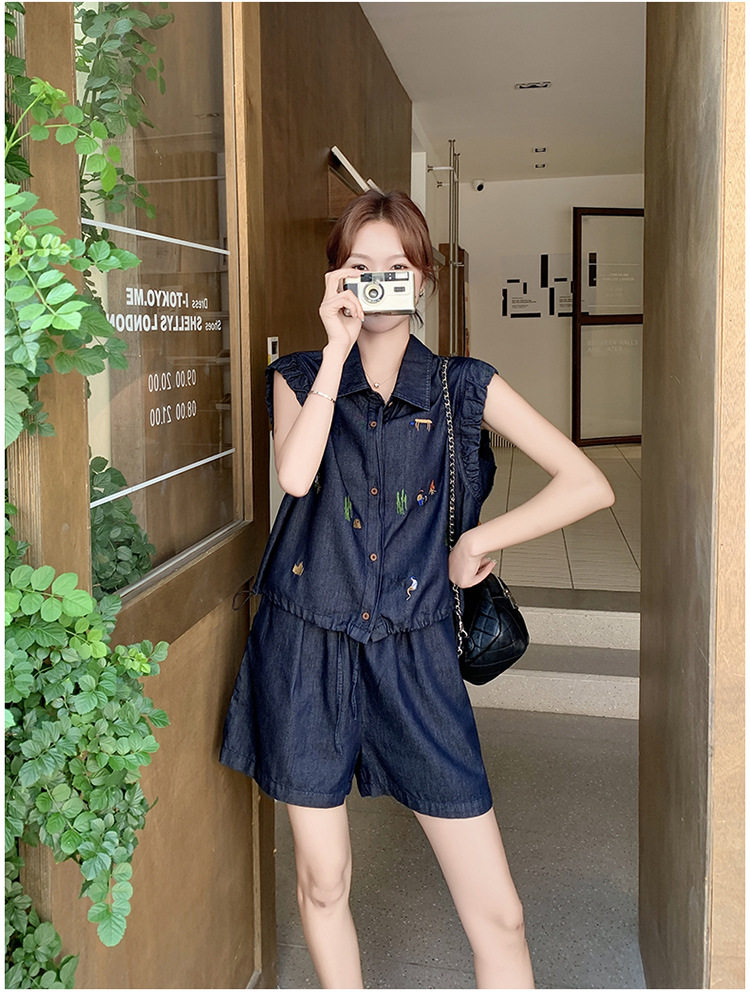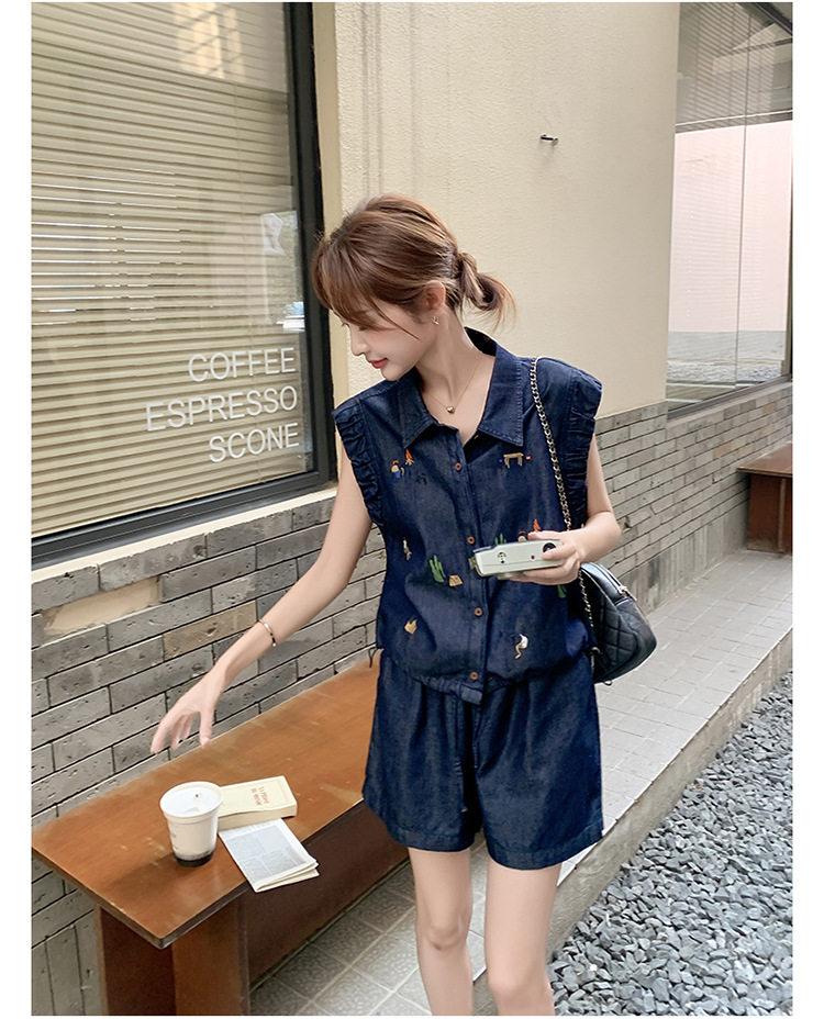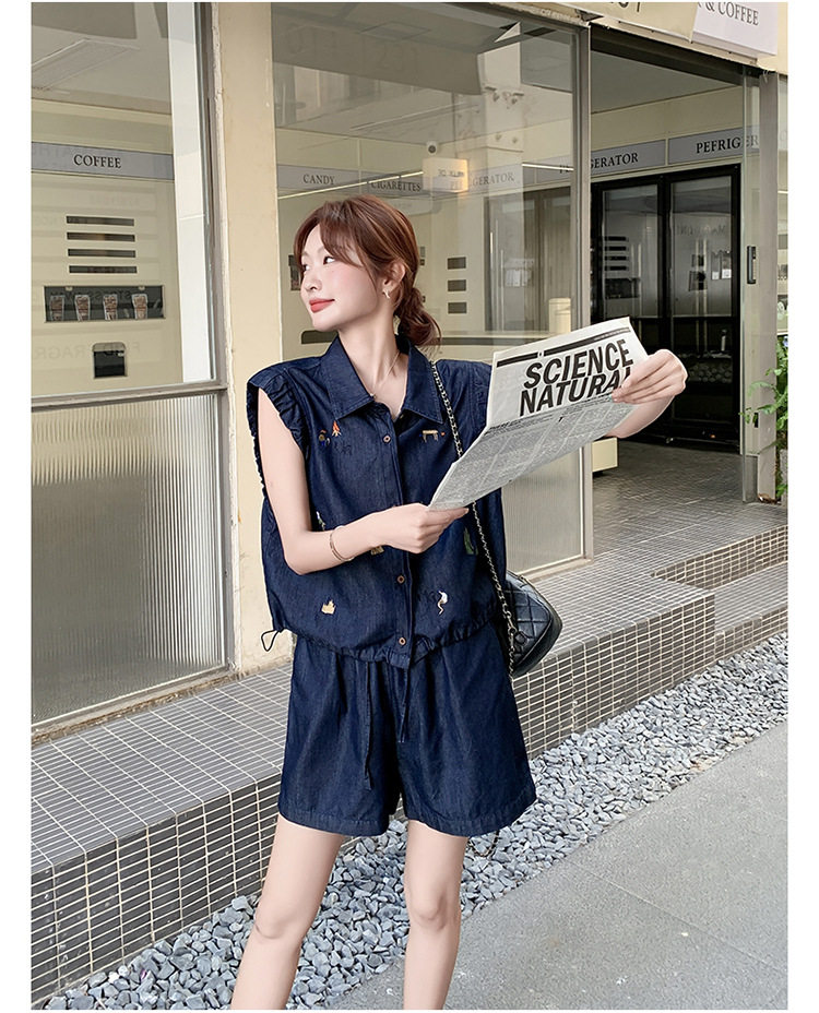 2点セット!【セットアップ】デニムブルー ベスト+ワイドショートパンツ 夏 レディース 高見え 着痩せ 上下セットアップ【JZシリーズ】