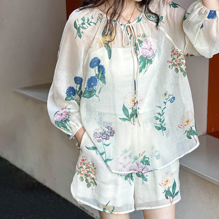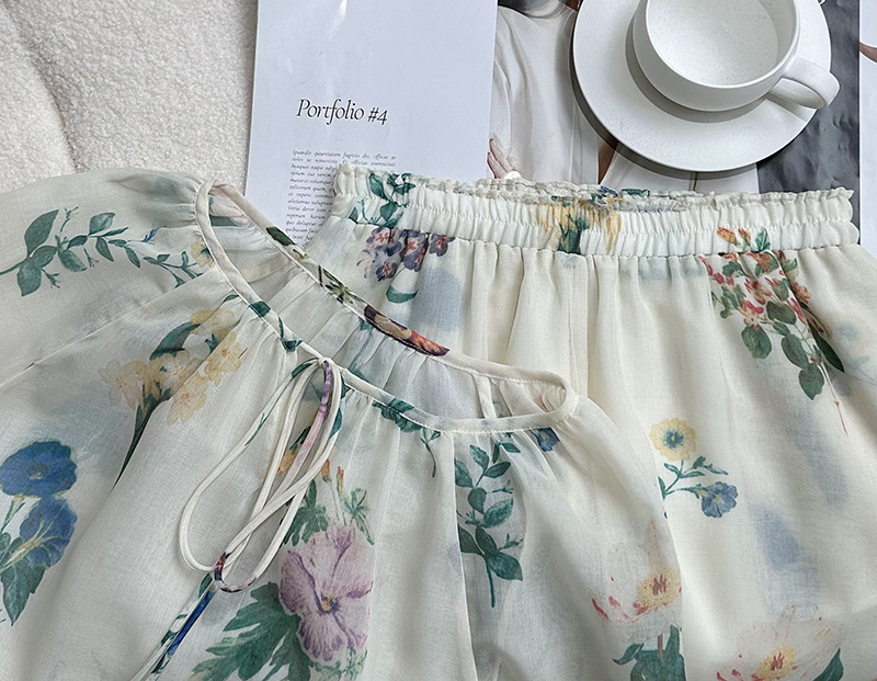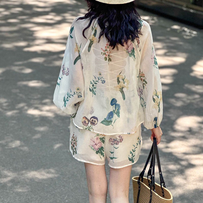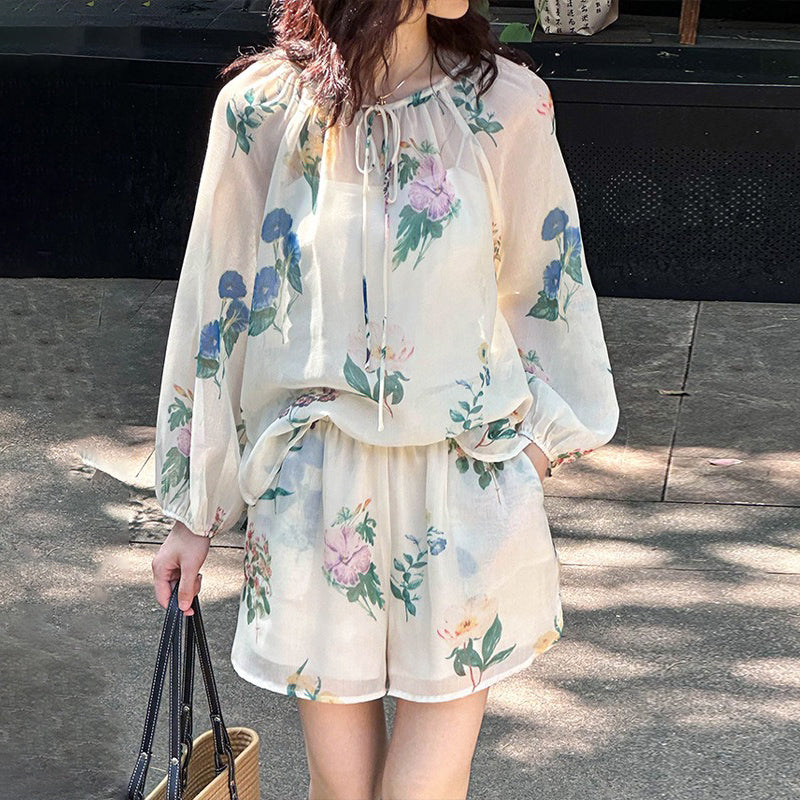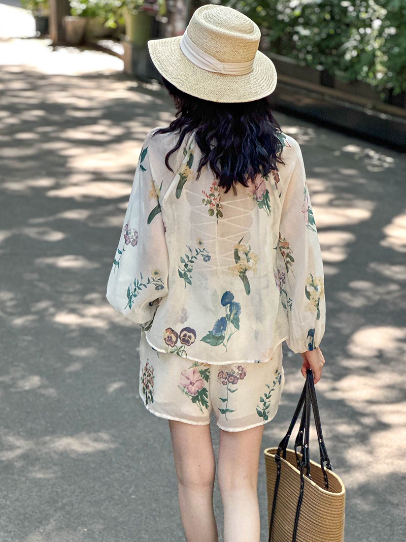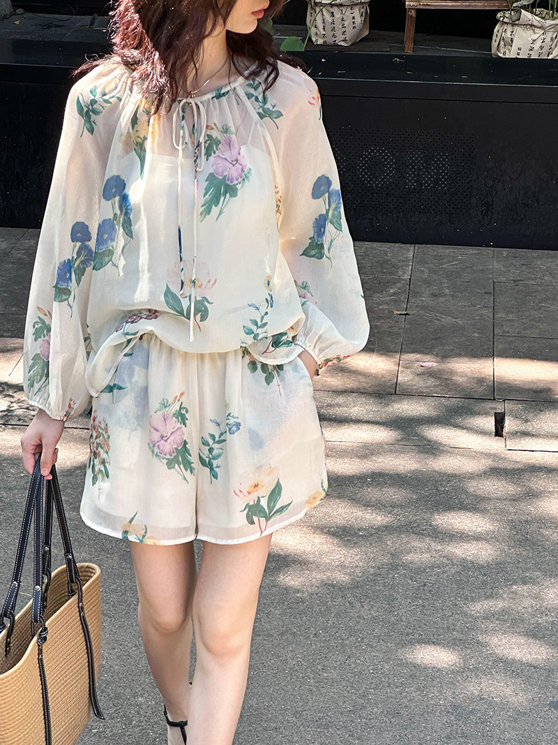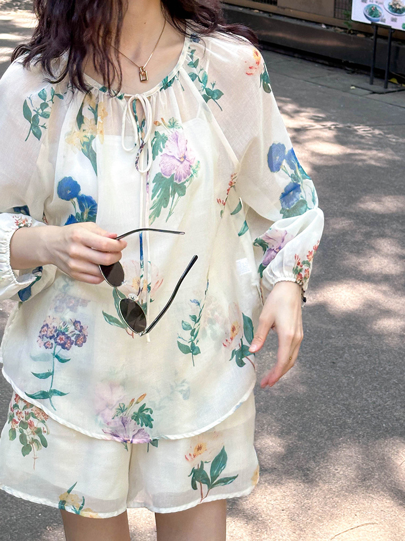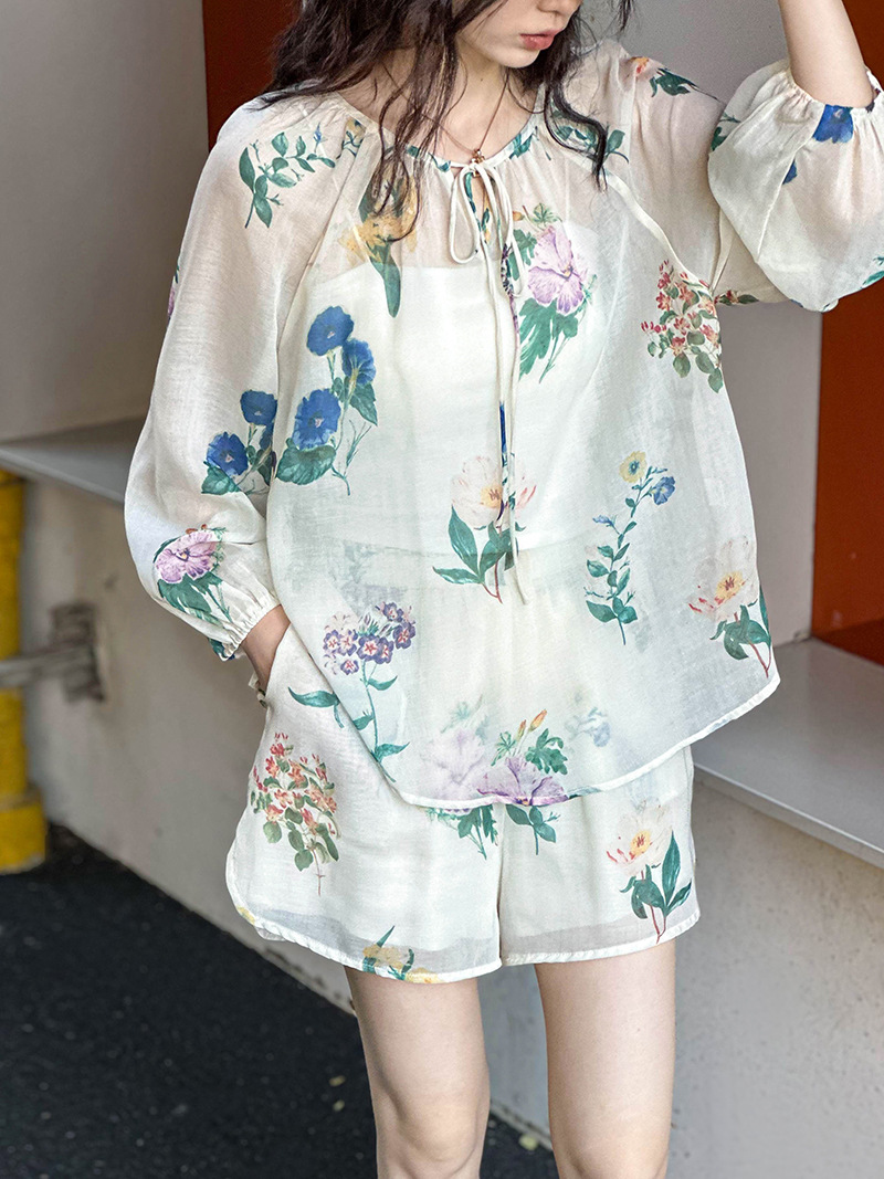 2点セット!【セットアップ】韓国風 ゆったりプリントUVカットシャツ+ハイウエストショートパンツ 上下セットアップ【SHシリーズ】【JZシリーズ】