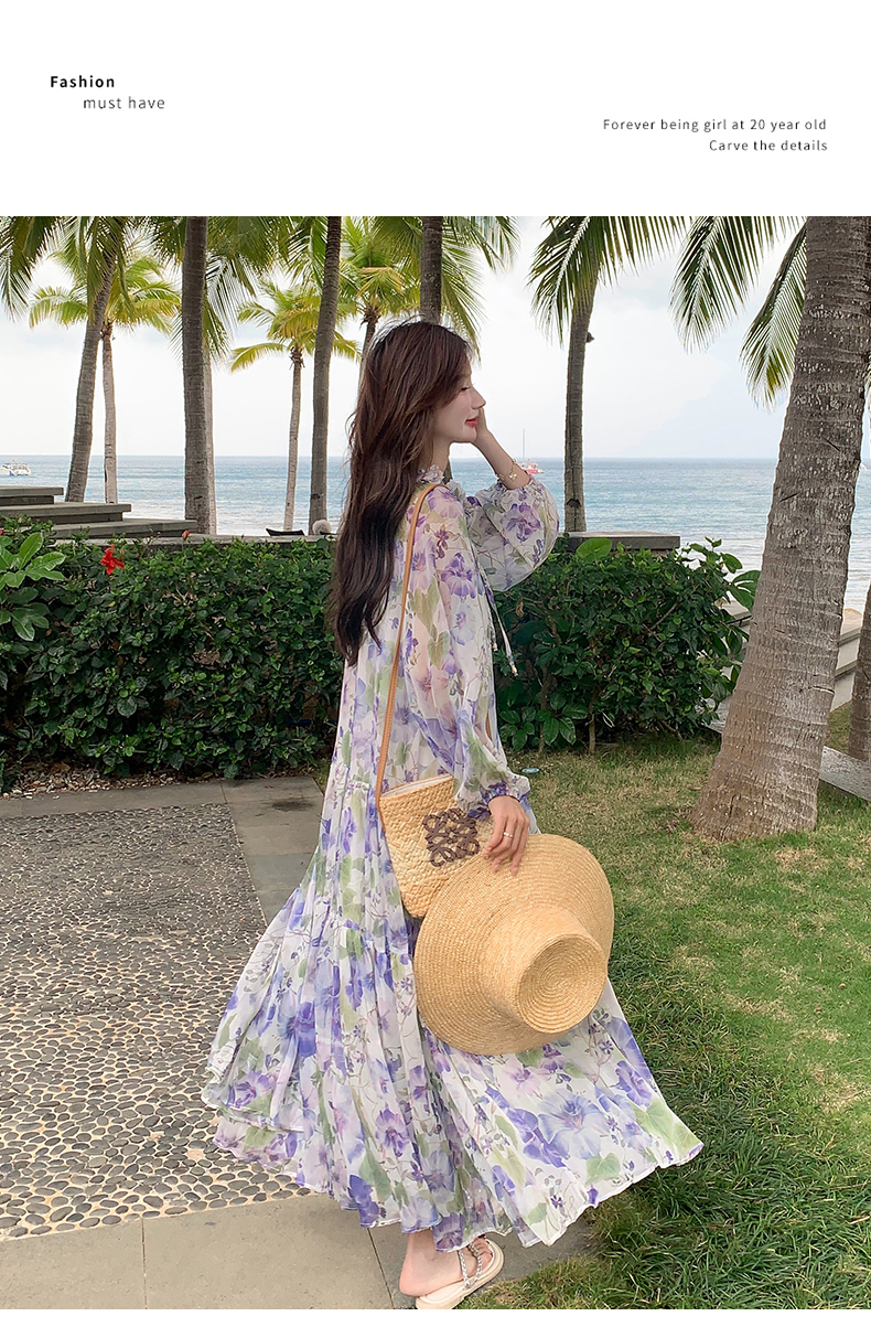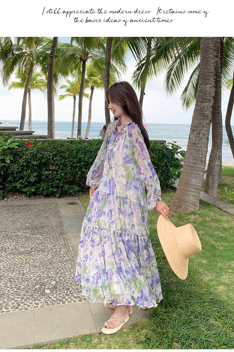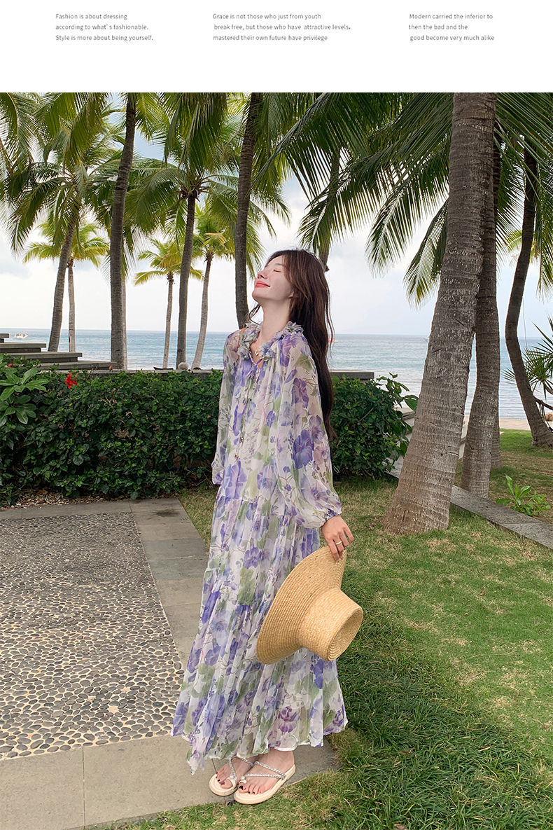 【商品名】【ワンピース】ビーチ バカンス風 風油絵 小花柄 ワンピース 春夏 フレンチ 柔らかい雰囲気 長袖 日焼け防止 ドレス【SHシリーズ】