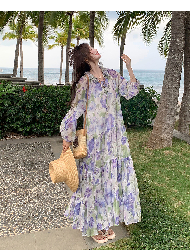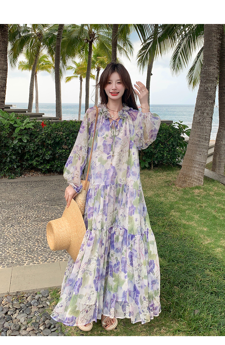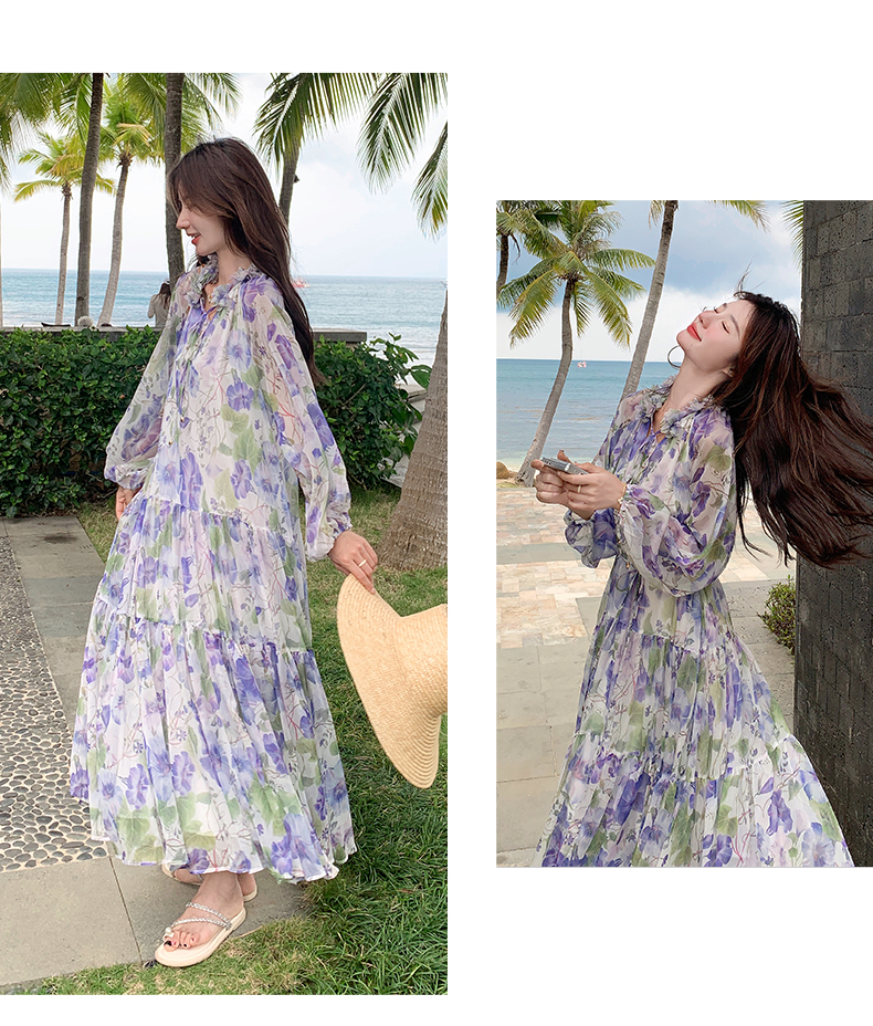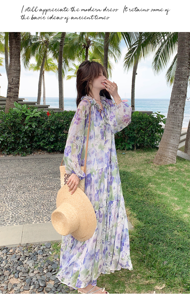 【商品名】【ワンピース】ビーチ バカンス風 風油絵 小花柄 ワンピース 春夏 フレンチ 柔らかい雰囲気 長袖 日焼け防止 ドレス【SHシリーズ】