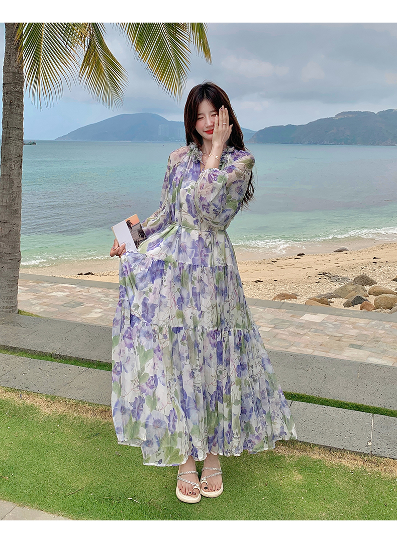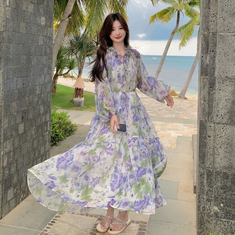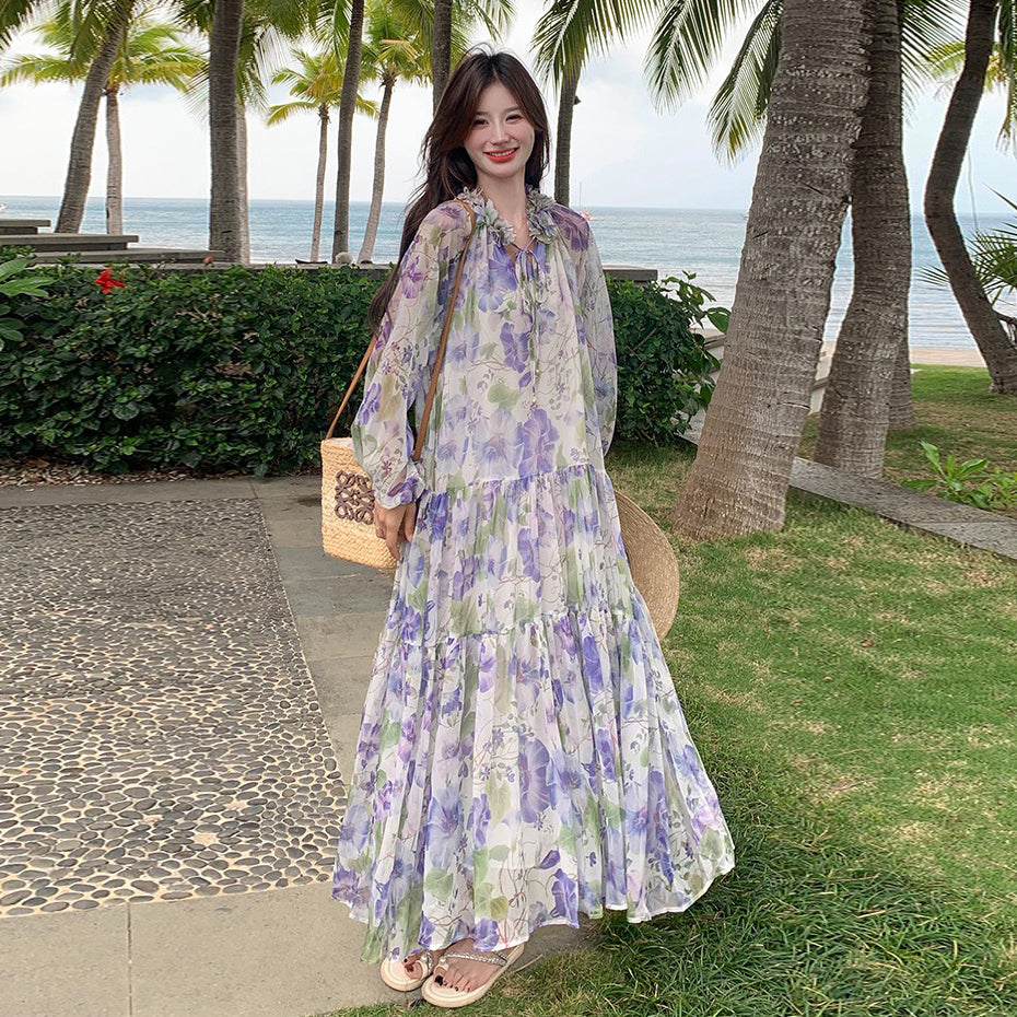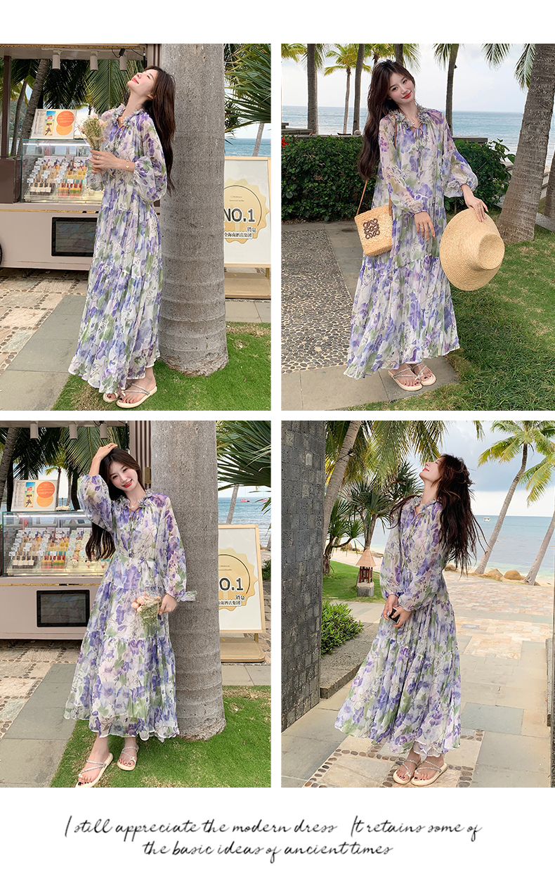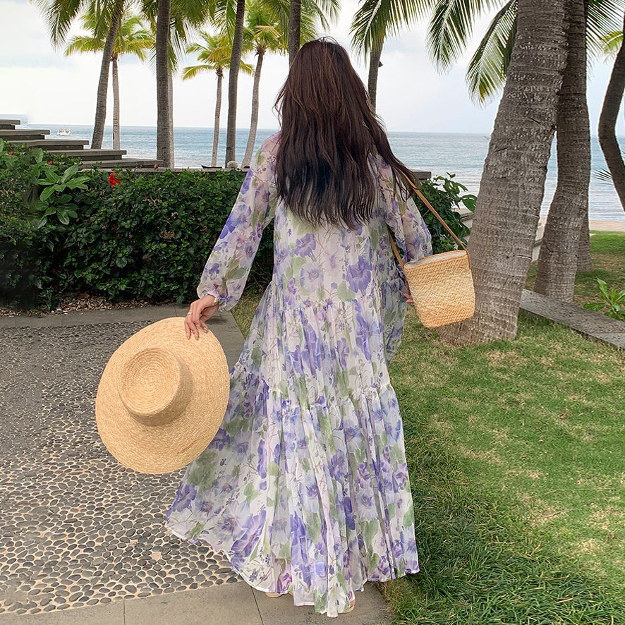 【ワンピース】ビーチ バカンス風 風油絵 小花柄 ワンピース 春夏 フレンチ 柔らかい雰囲気 長袖 日焼け防止 ドレス【SHシリーズ】