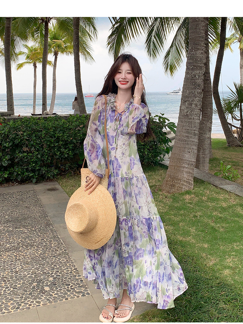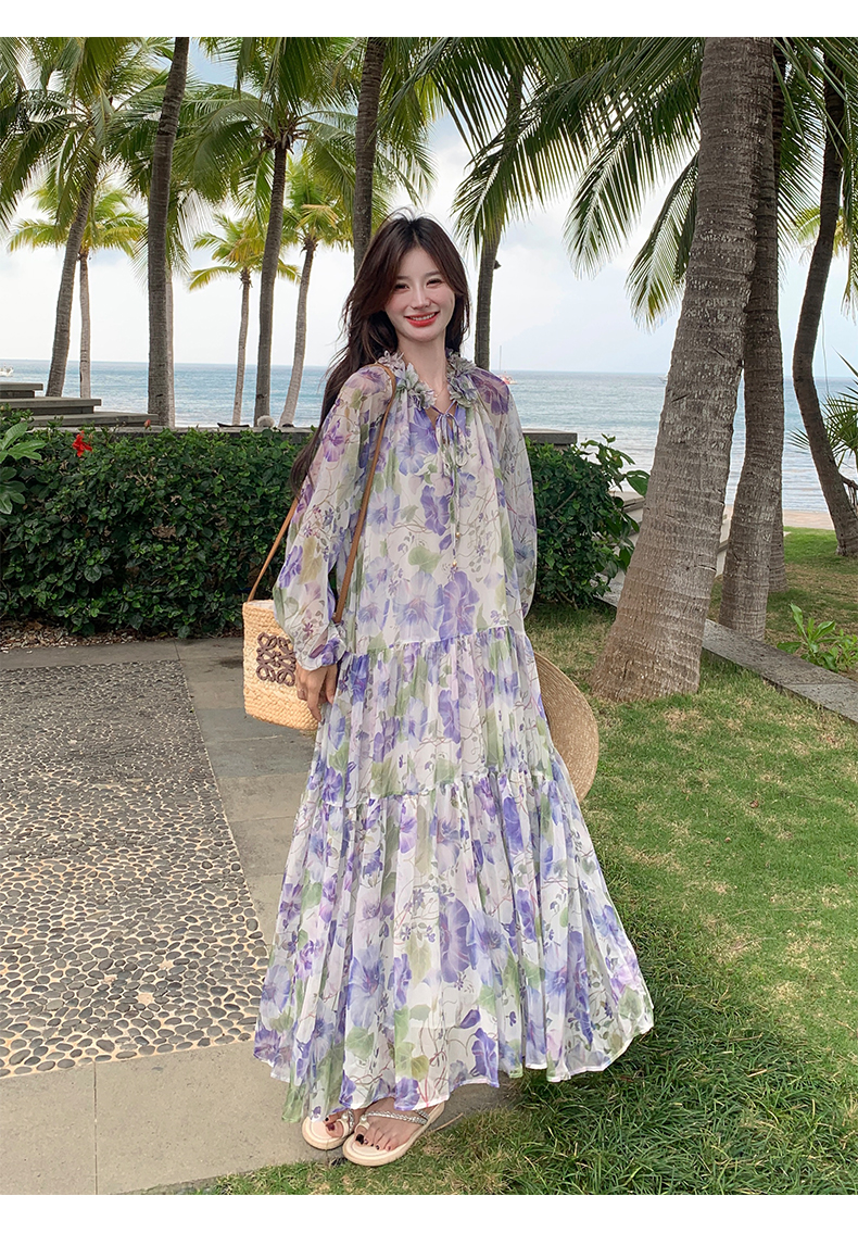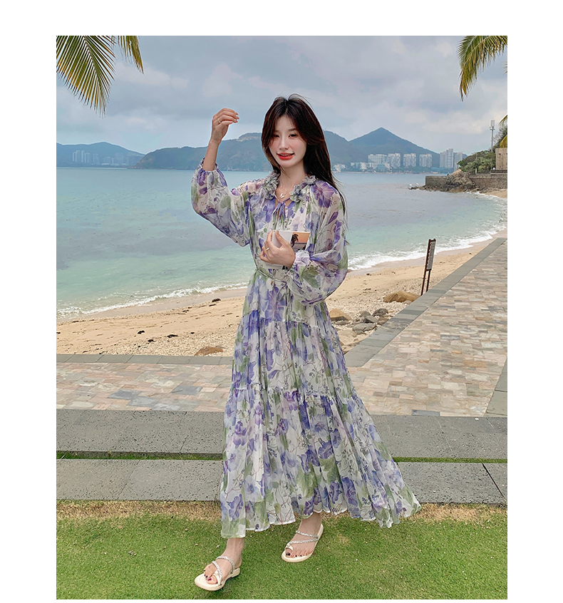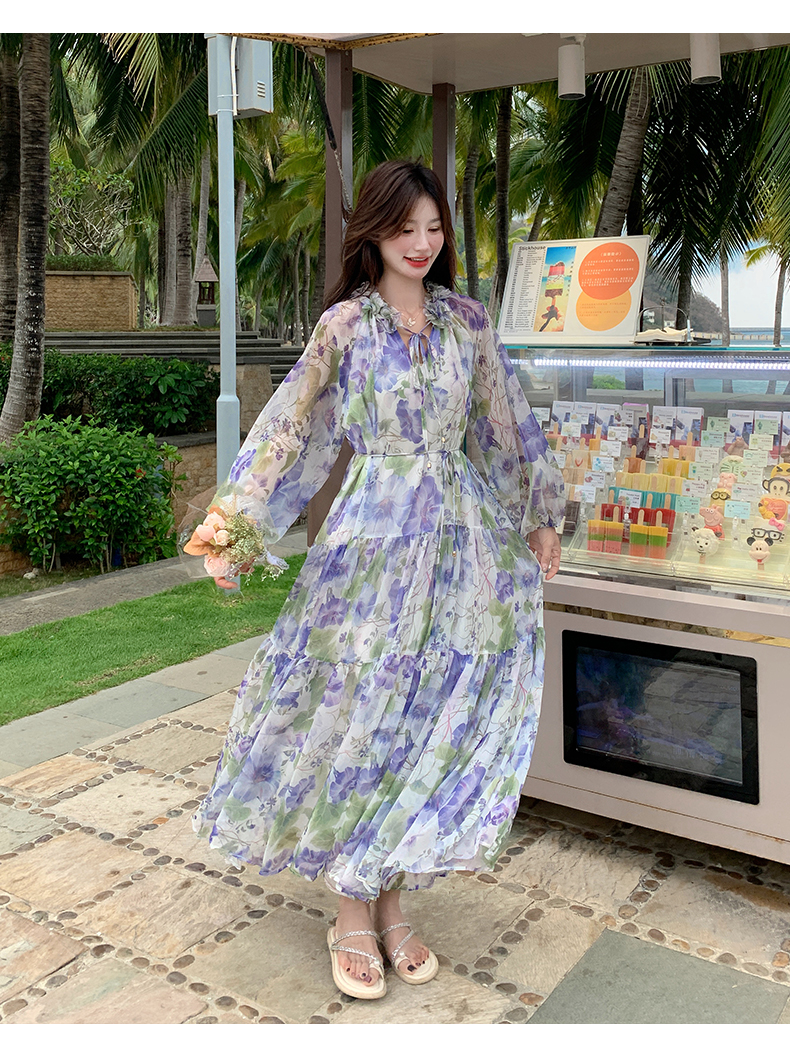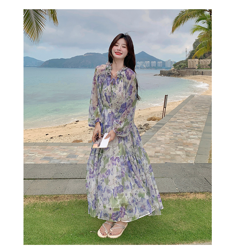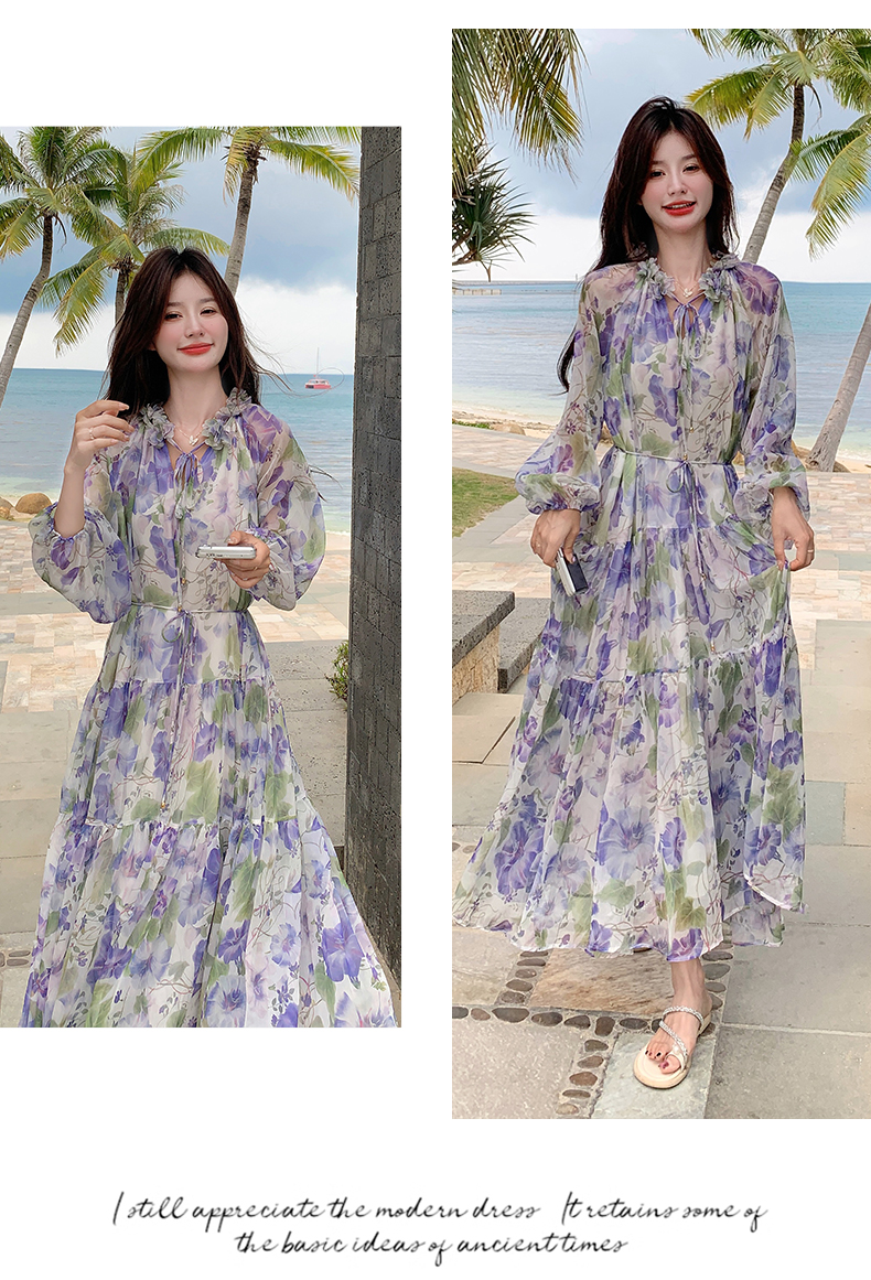 【ワンピース】ビーチ バカンス風 風油絵 小花柄 ワンピース 春夏 フレンチ 柔らかい雰囲気 長袖 日焼け防止 ドレス【SHシリーズ】