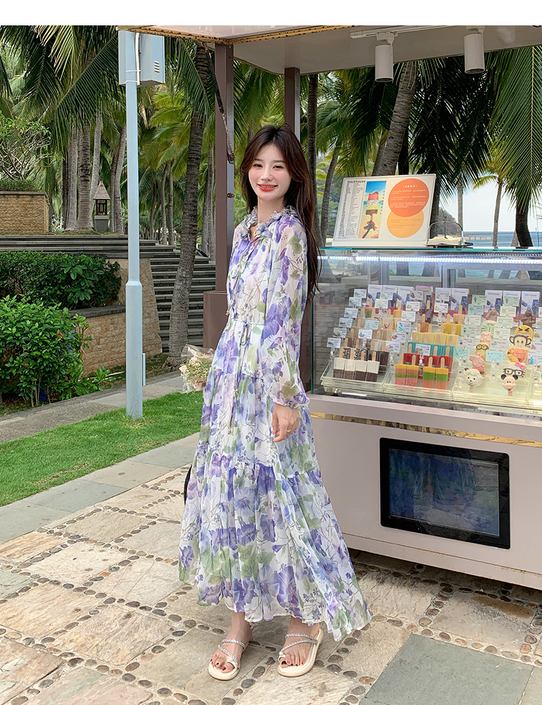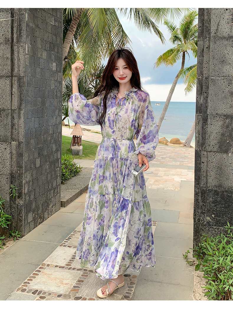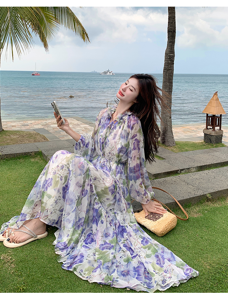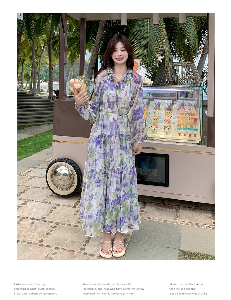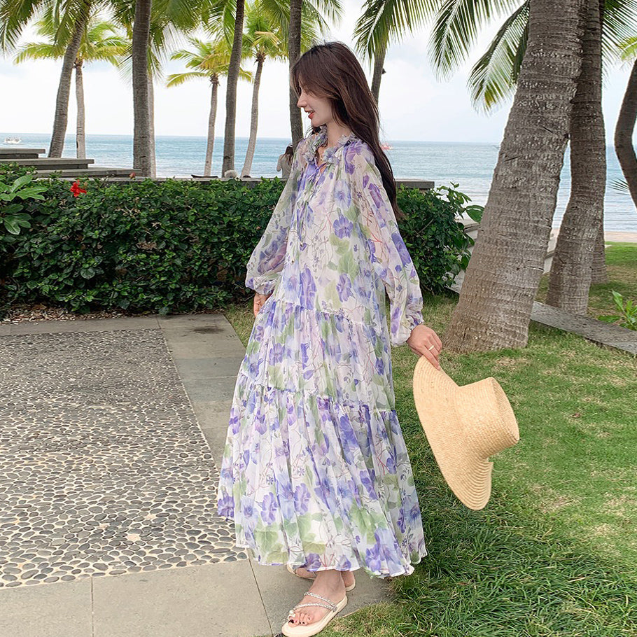 【ワンピース】ビーチ バカンス風 風油絵 小花柄 ワンピース 春夏 フレンチ 柔らかい雰囲気 長袖 日焼け防止 ドレス【SHシリーズ】