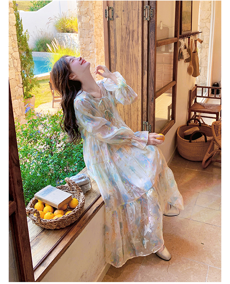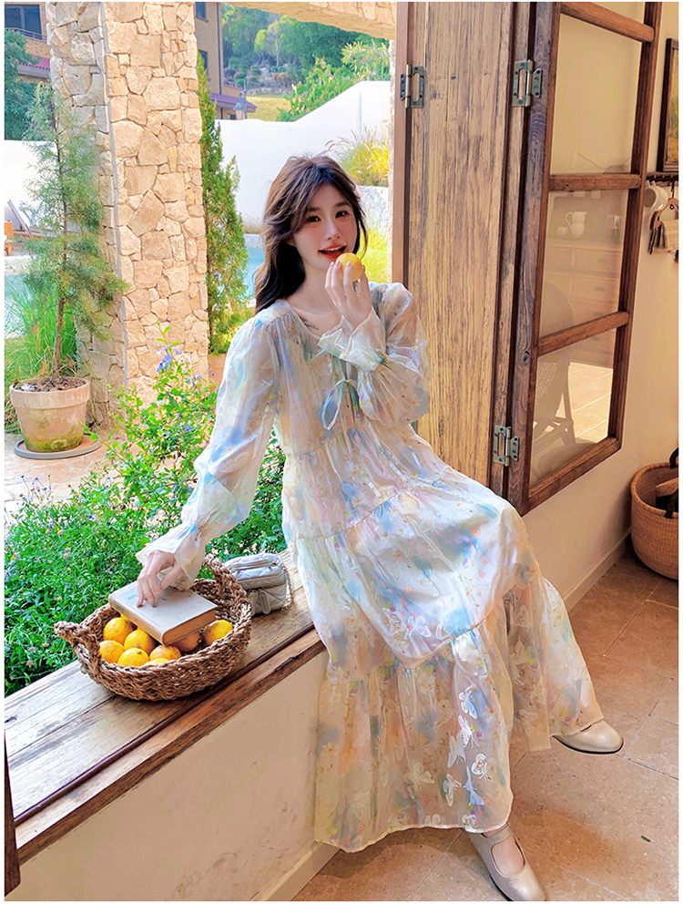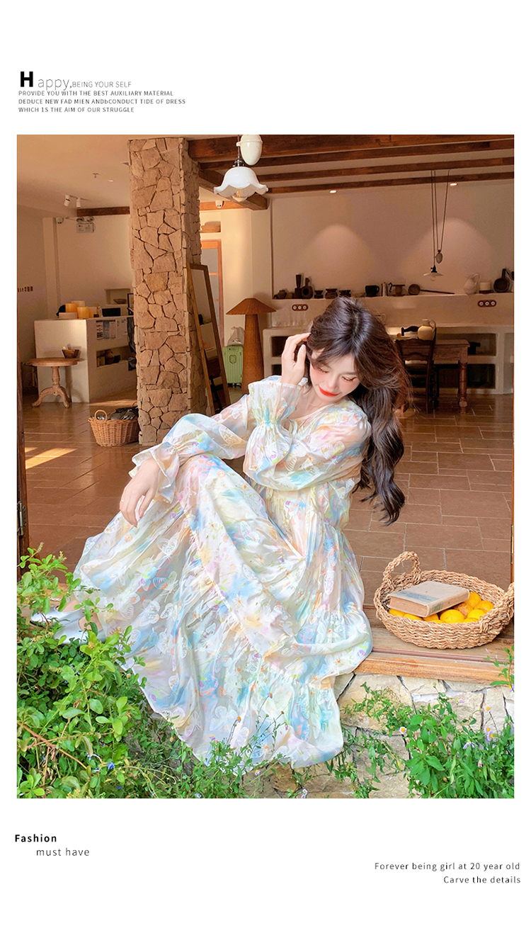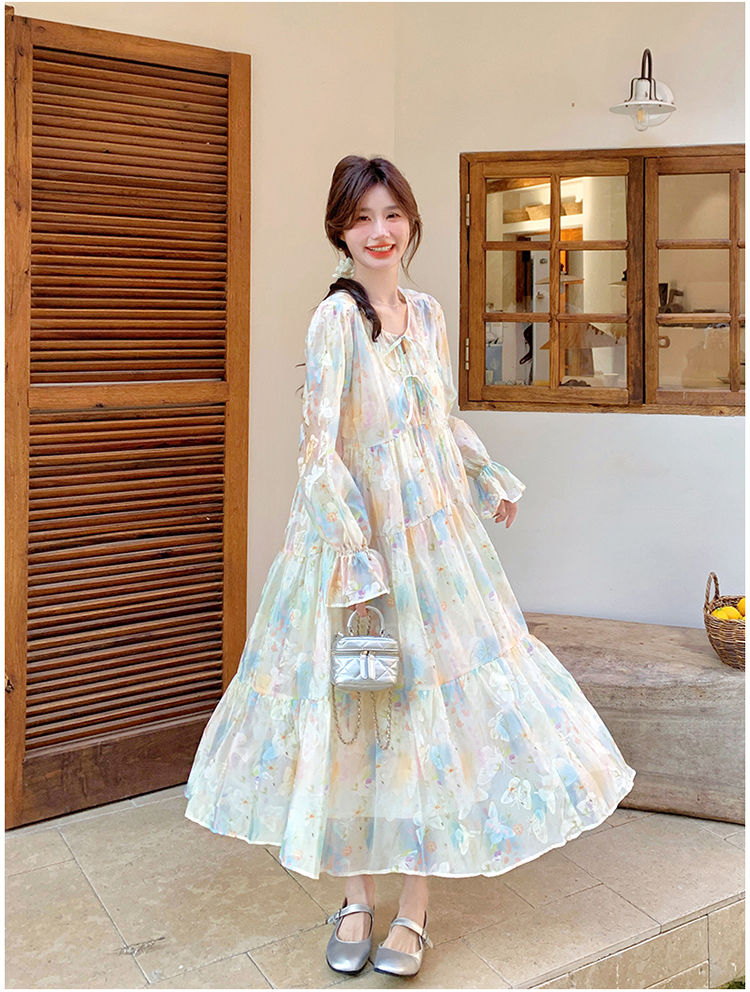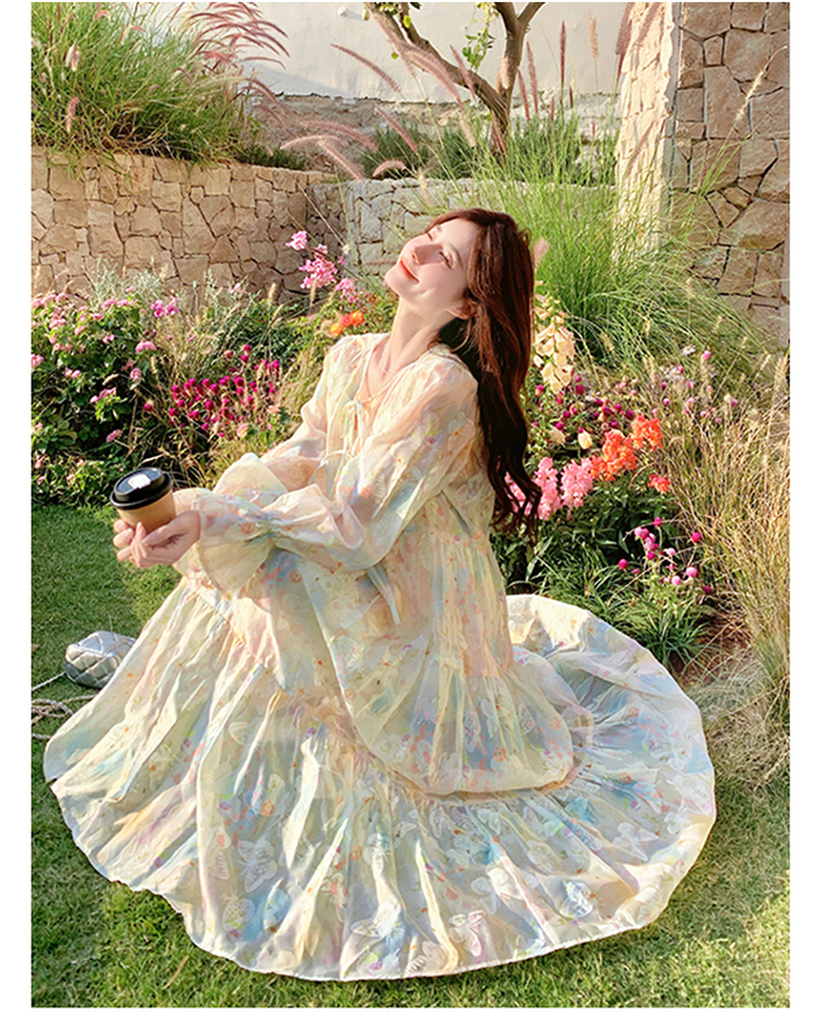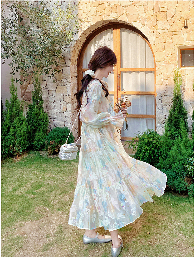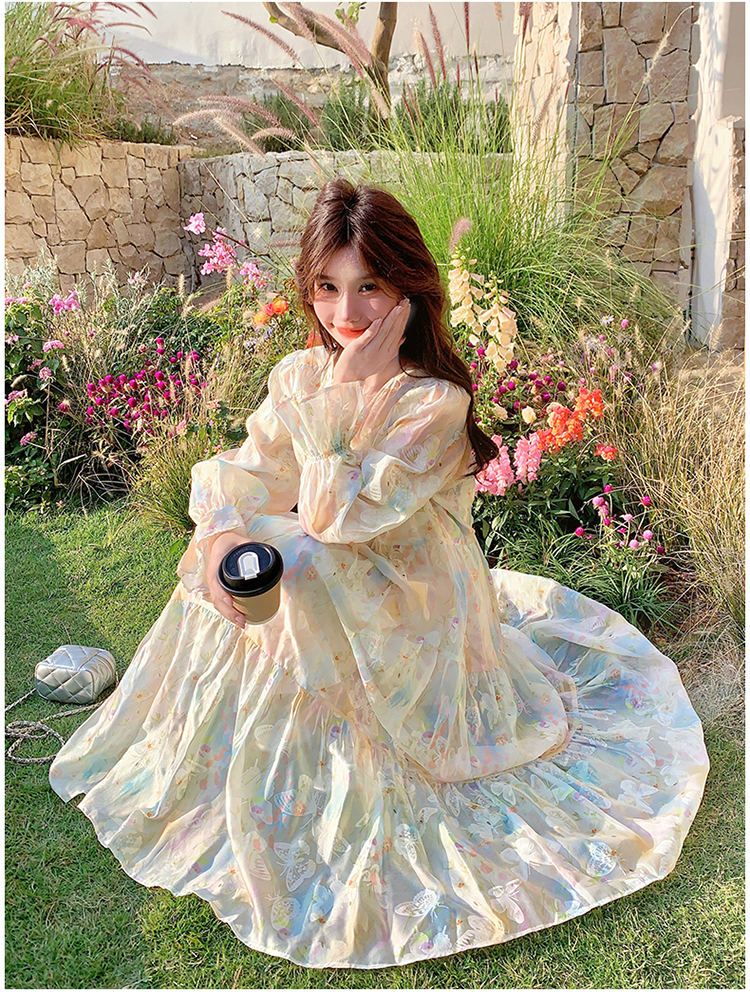 【ワンピース】超かわいい バタフライプリント ワンピース 春夏 ムード感たっぷり ハイウエスト 日焼け防止 ロングドレス【SHシリーズ】