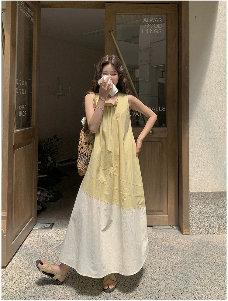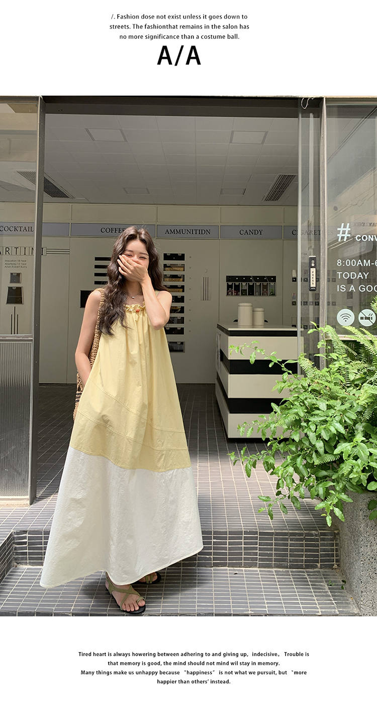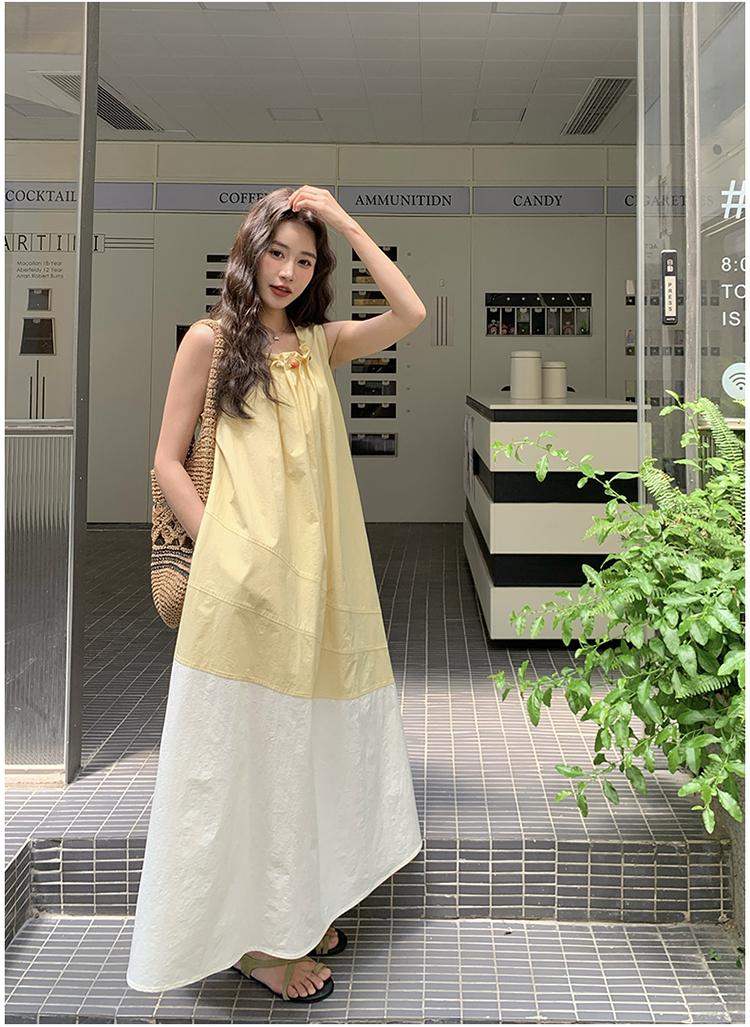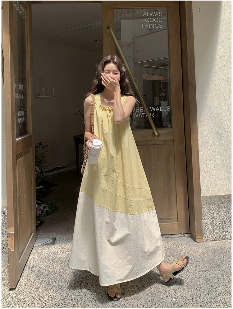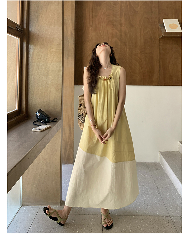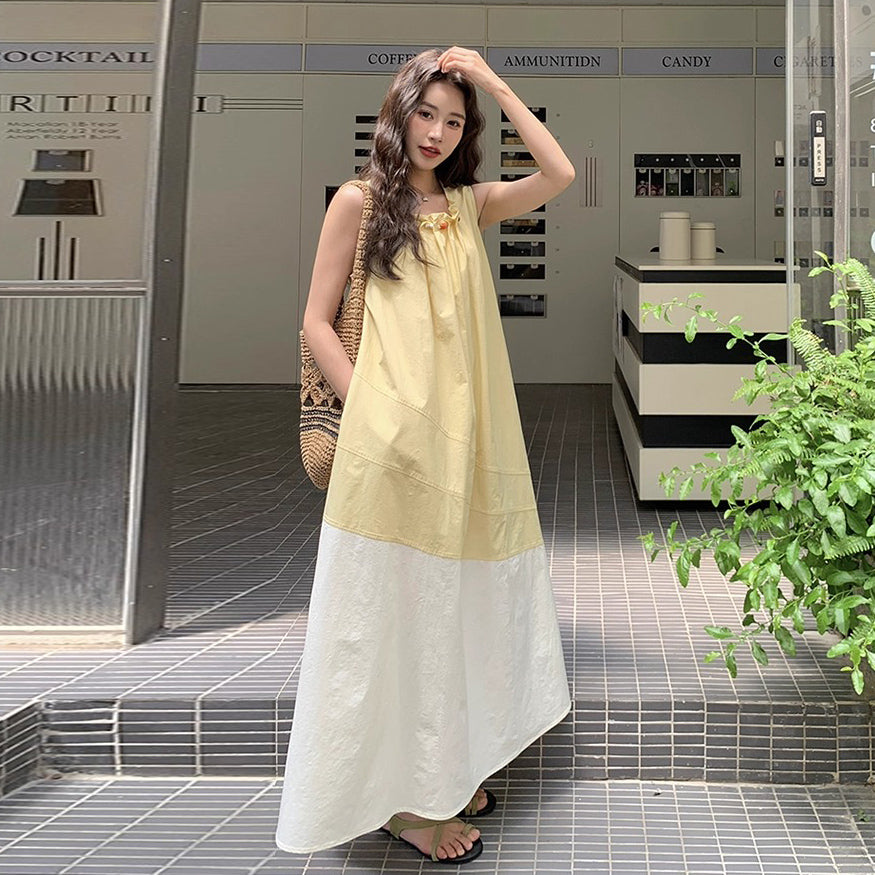 【ワンピース】切り替え ライトイエロー ノースリーブ タンクワンピース レディース 夏 ゆったり スタイルアップ ロング丈【JZシリーズ】