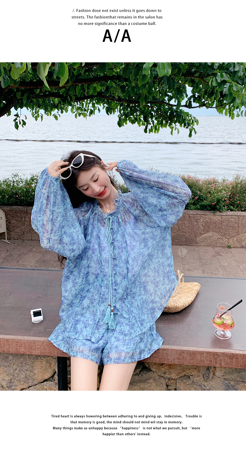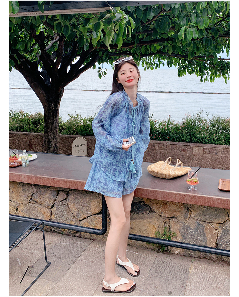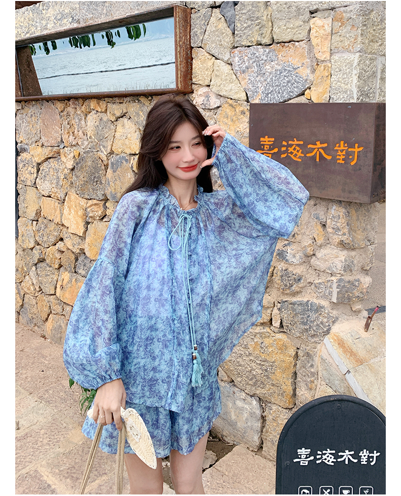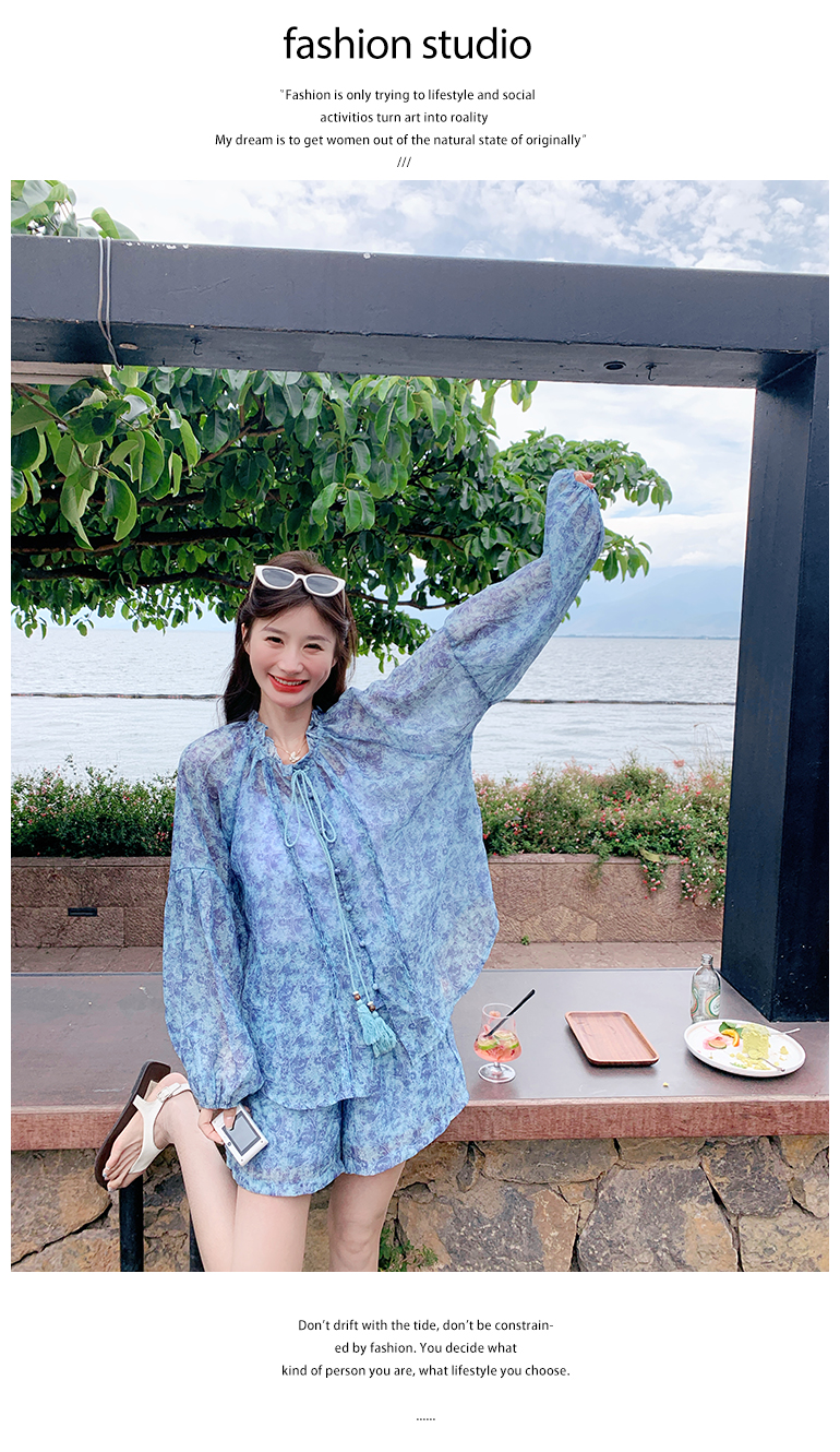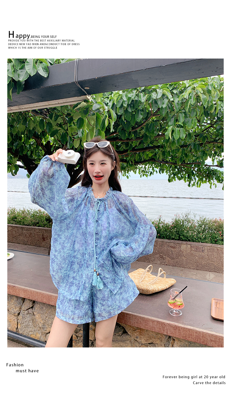 【商品名】2点セット!【ボトムス】紫外線対策◎ ブルー系ぼかし花柄薄手長袖+ショートパンツ 上下セット 夏のリゾートコーデにおすすめ【SHシリーズ】