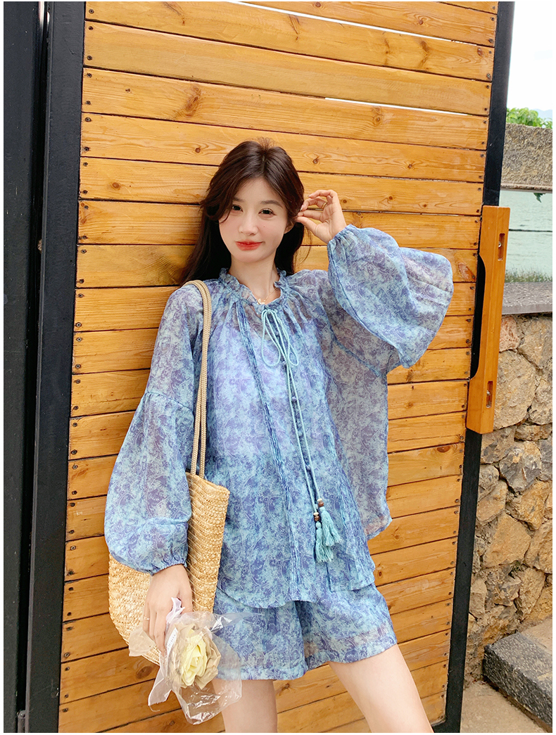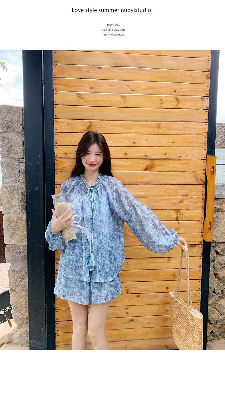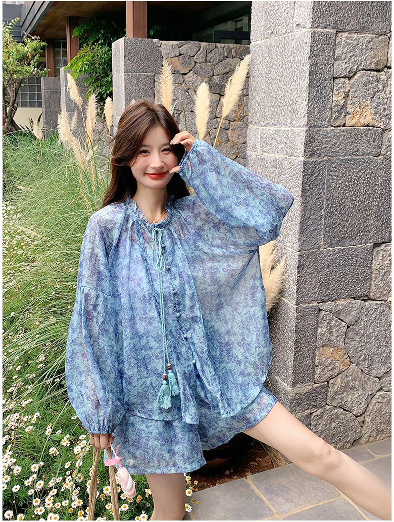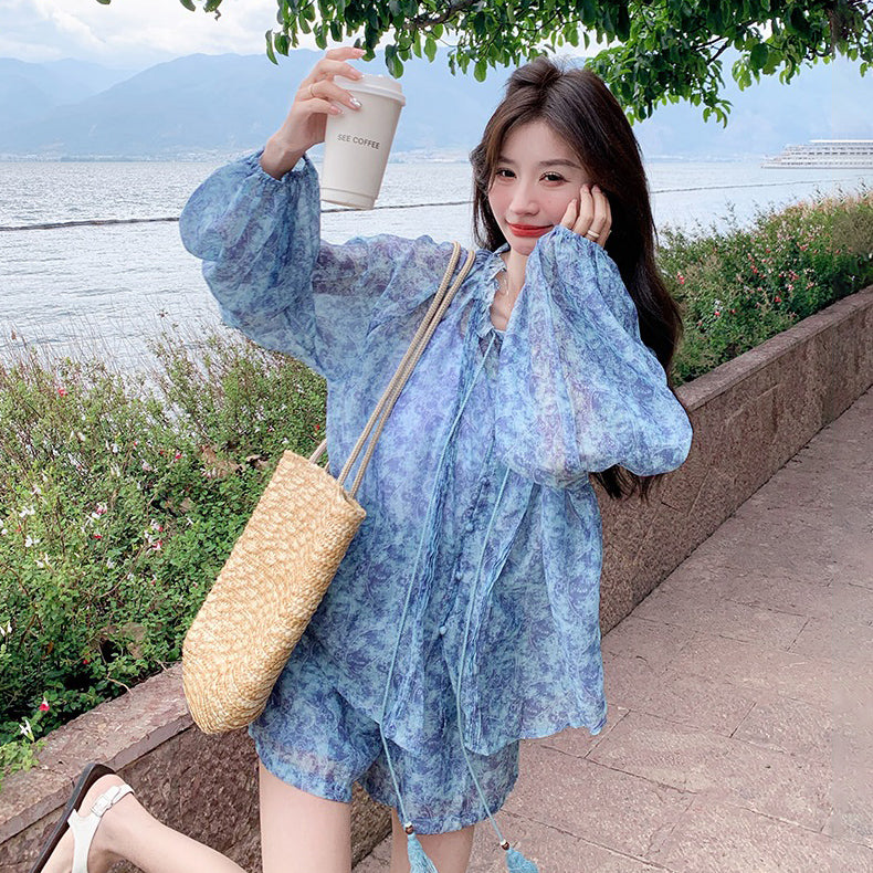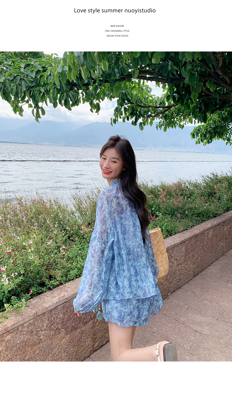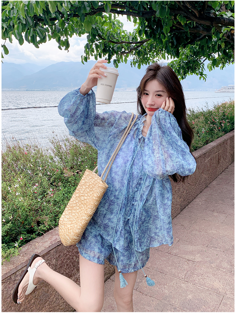 【商品名】2点セット!【ボトムス】紫外線対策◎ ブルー系ぼかし花柄薄手長袖+ショートパンツ 上下セット 夏のリゾートコーデにおすすめ【SHシリーズ】