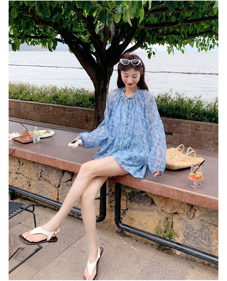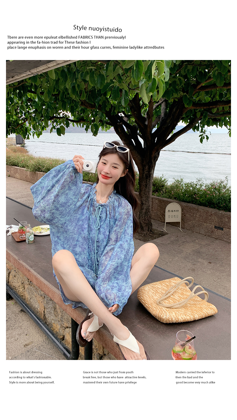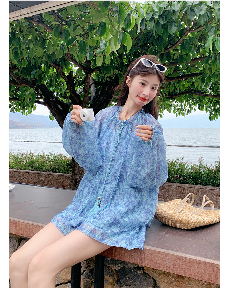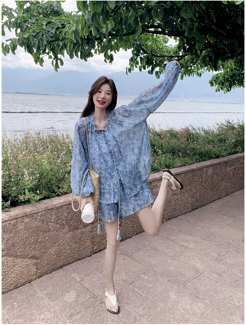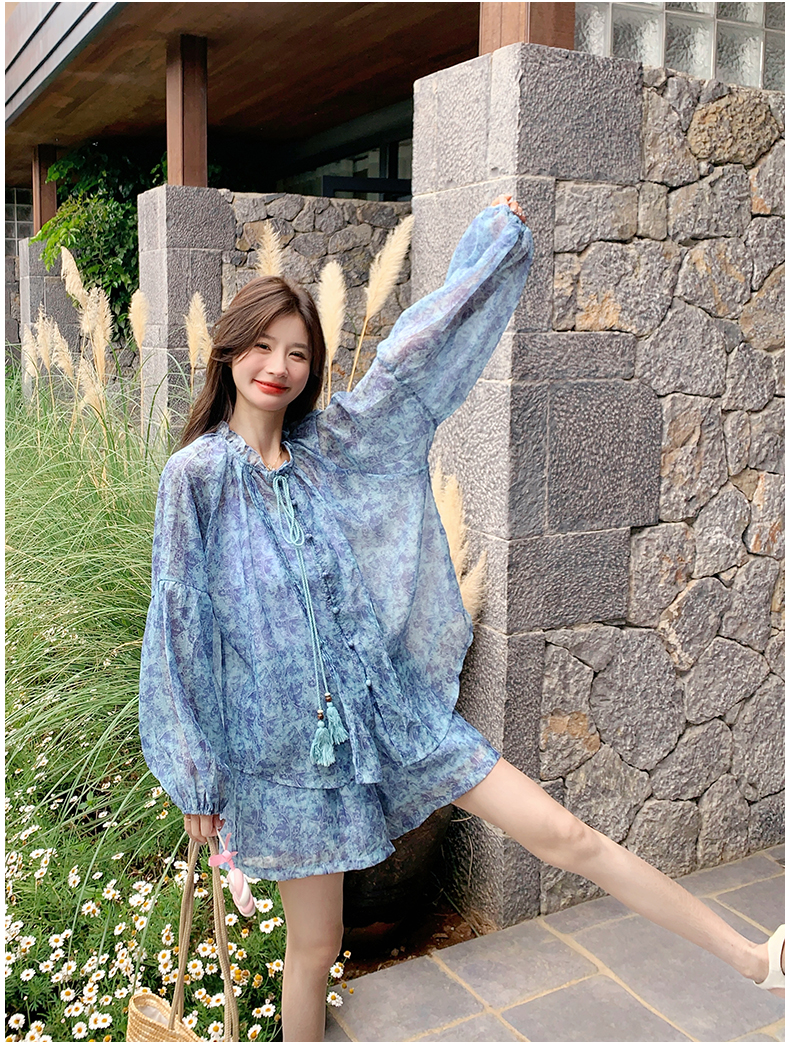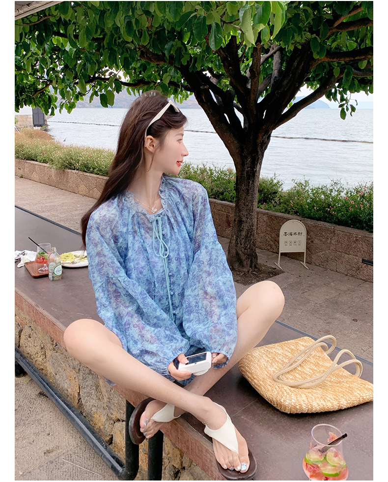 【商品名】2点セット!【ボトムス】紫外線対策◎ ブルー系ぼかし花柄薄手長袖+ショートパンツ 上下セット 夏のリゾートコーデにおすすめ【SHシリーズ】