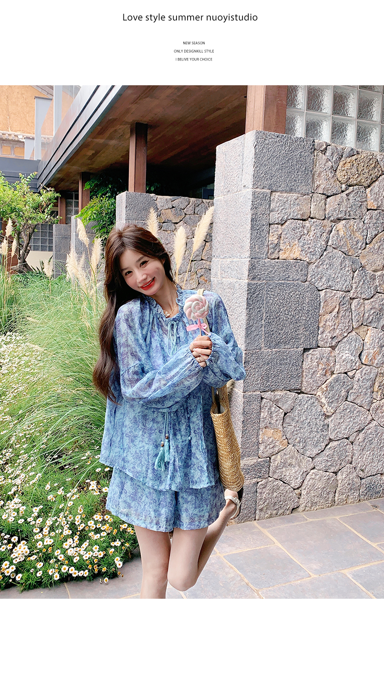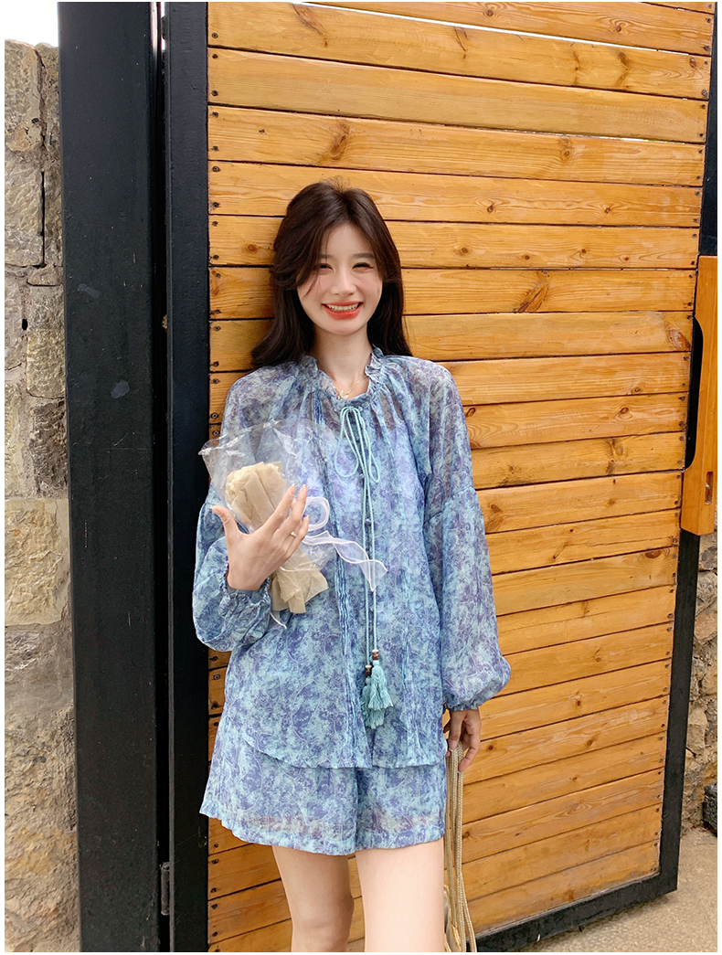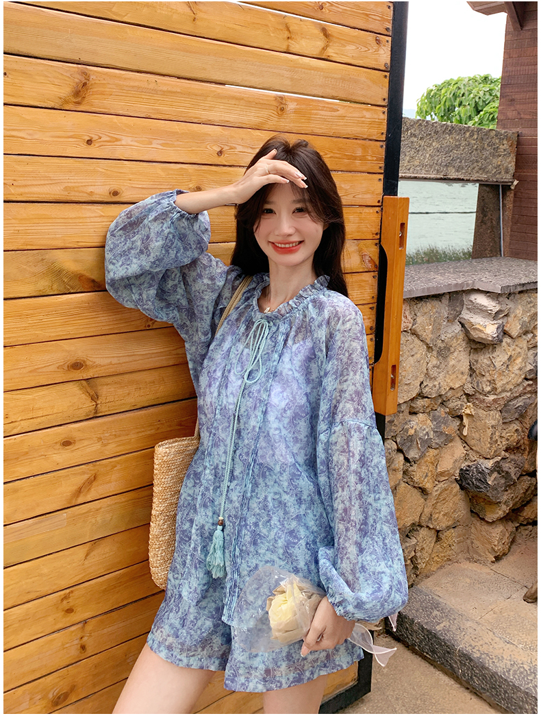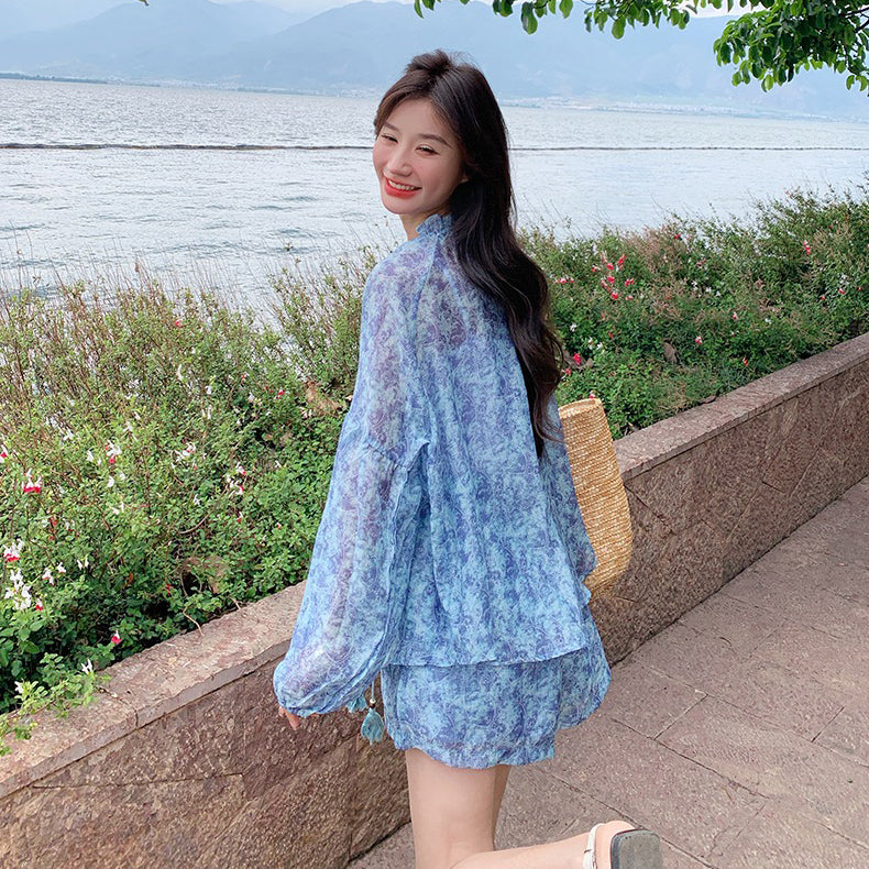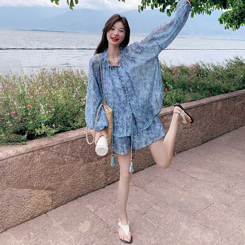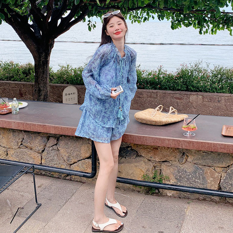 2点セット!【セットアップ】紫外線対策◎ ブルー系ぼかし花柄薄手長袖+ショートパンツ 上下セット 夏のリゾートコーデにおすすめ【SHシリーズ】