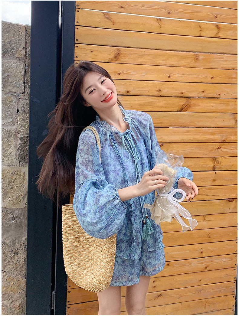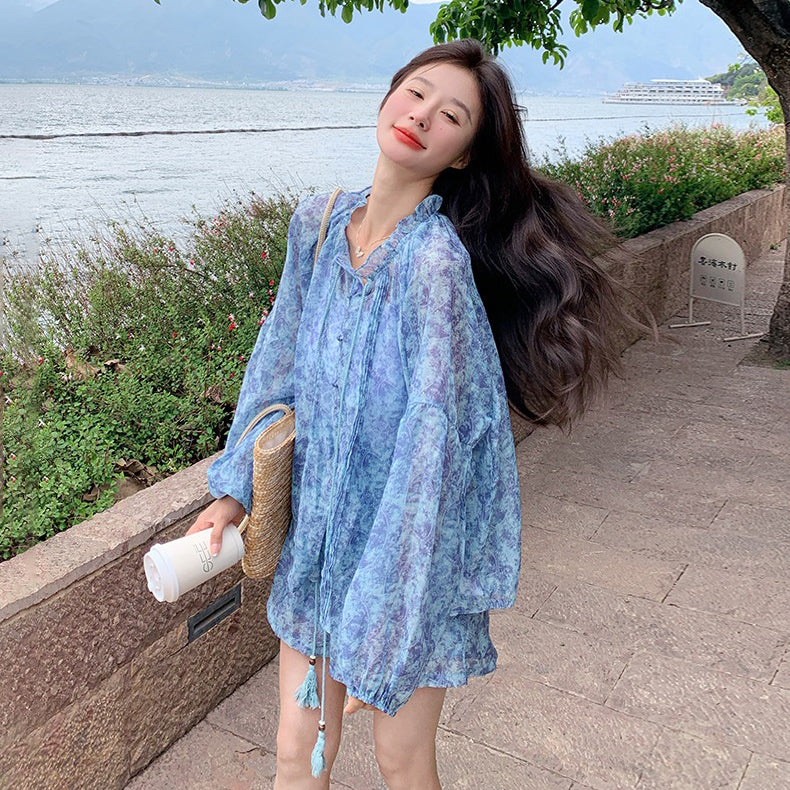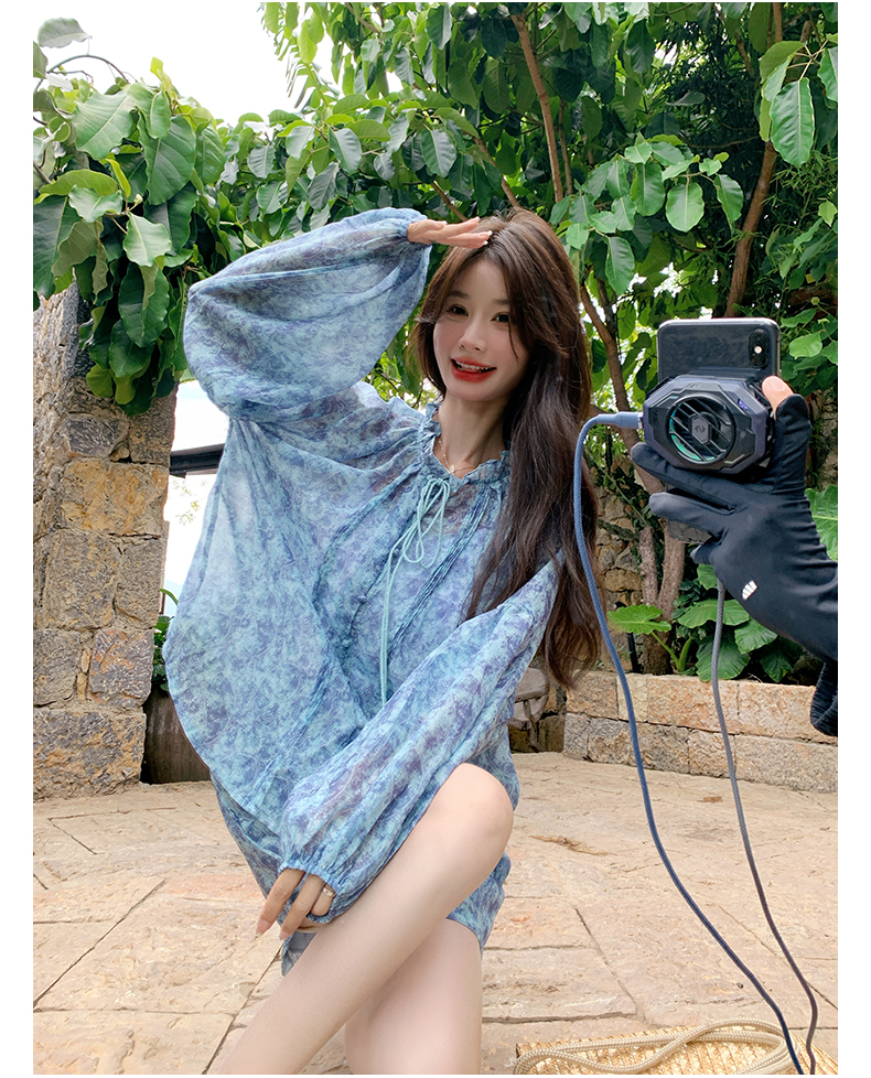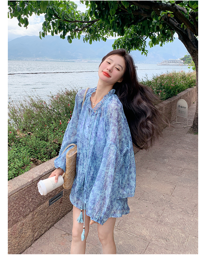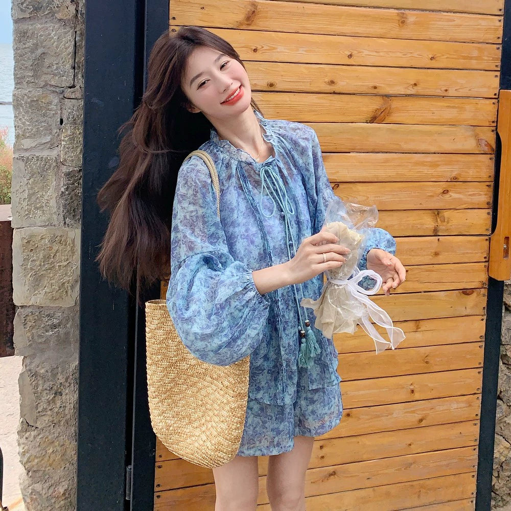 2点セット!【セットアップ】紫外線対策◎ ブルー系ぼかし花柄薄手長袖+ショートパンツ 上下セット 夏のリゾートコーデにおすすめ【SHシリーズ】