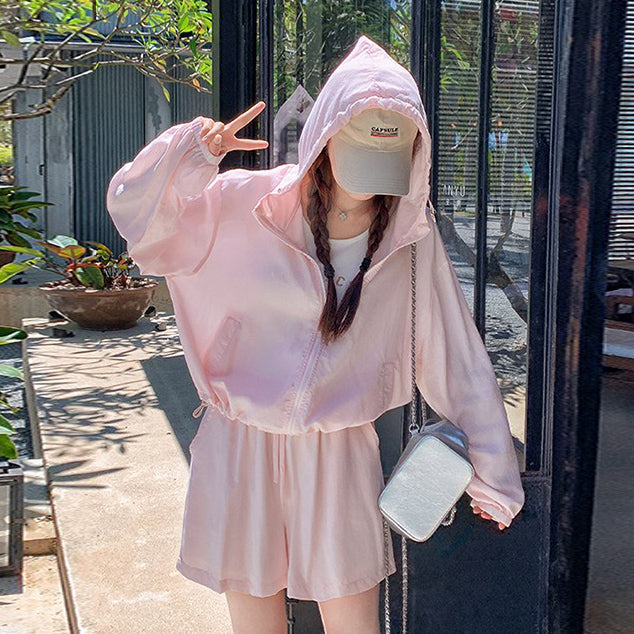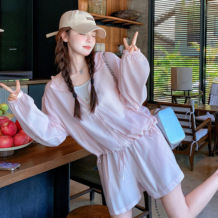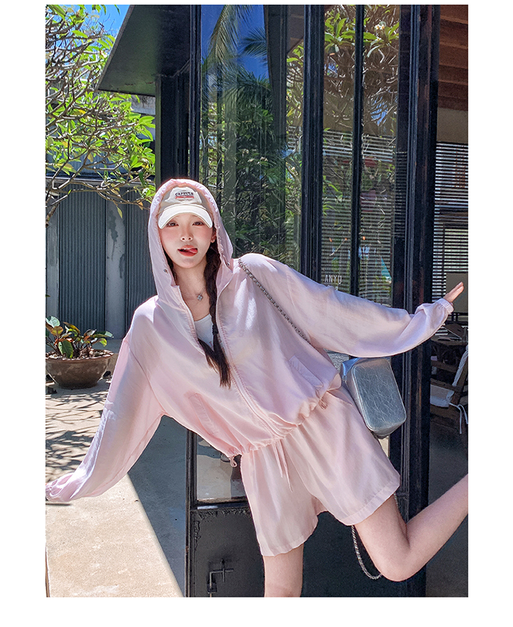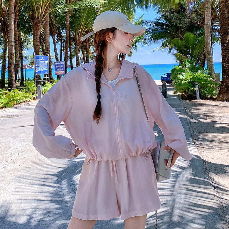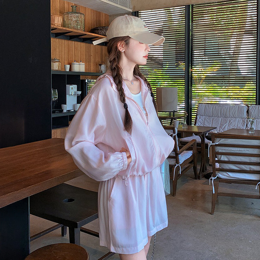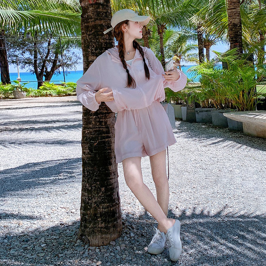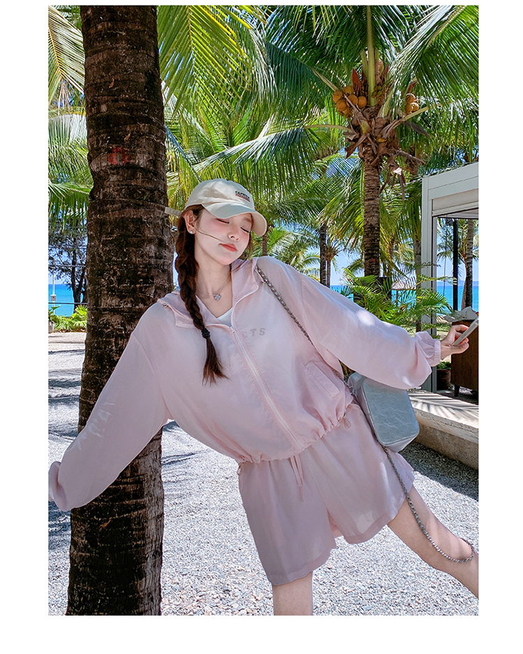 3点セット!【セットアップ】ゆる感たっぷり♡韓国風ピンクUVカットアウター+キャミ+ショーパンセットアップ 夏の注目 上下セット【JZシリーズ】