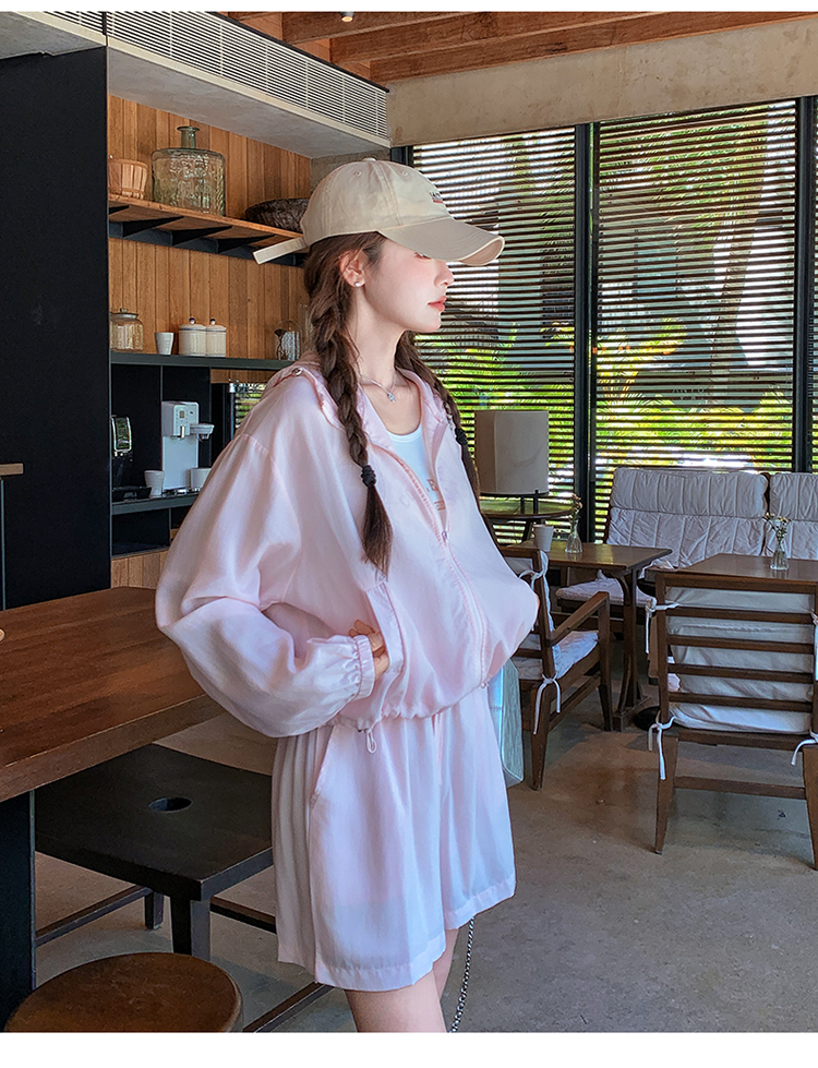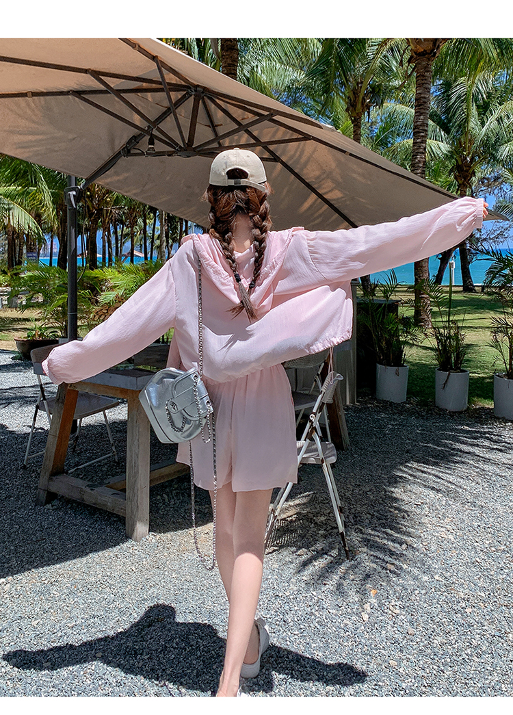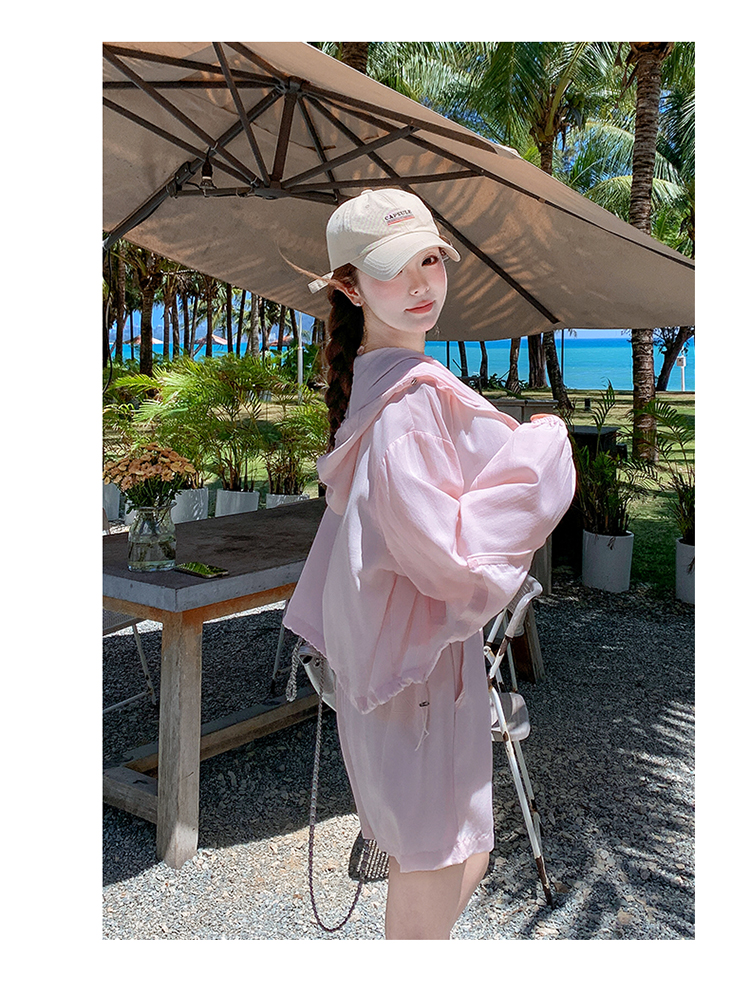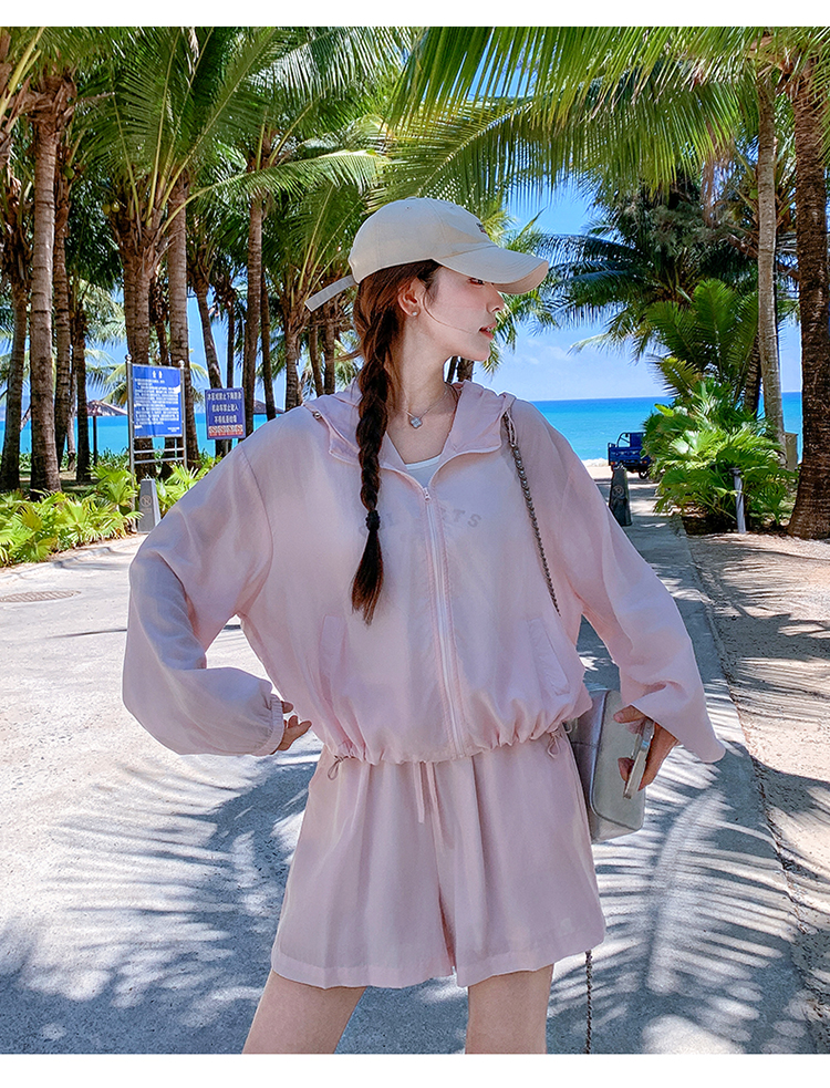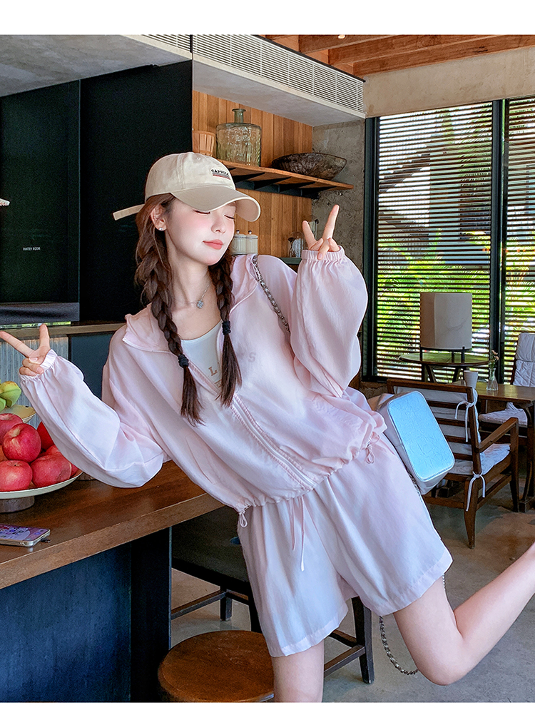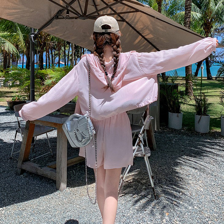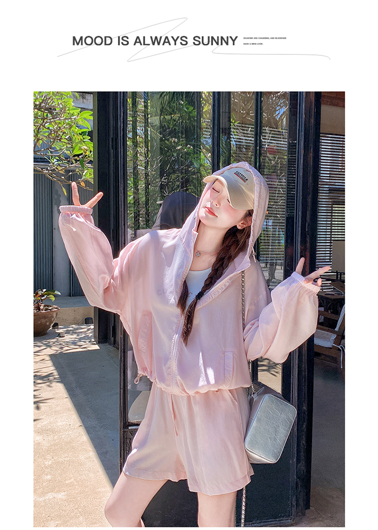 3点セット!【セットアップ】ゆる感たっぷり♡韓国風ピンクUVカットアウター+キャミ+ショーパンセットアップ 夏の注目 上下セット【JZシリーズ】