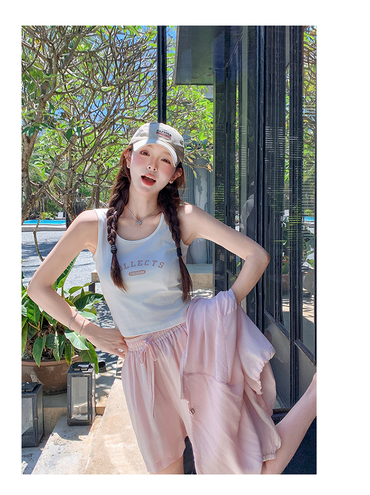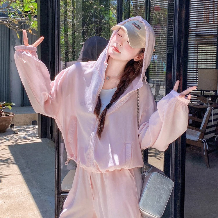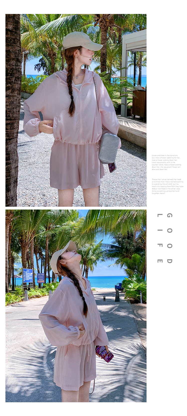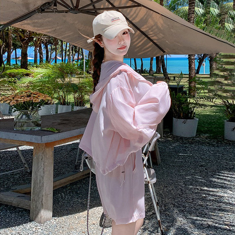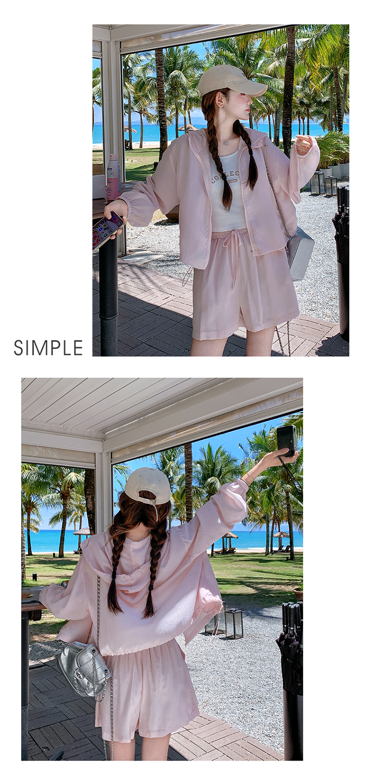 3点セット!【セットアップ】ゆる感たっぷり♡韓国風ピンクUVカットアウター+キャミ+ショーパンセットアップ 夏の注目 上下セット【JZシリーズ】