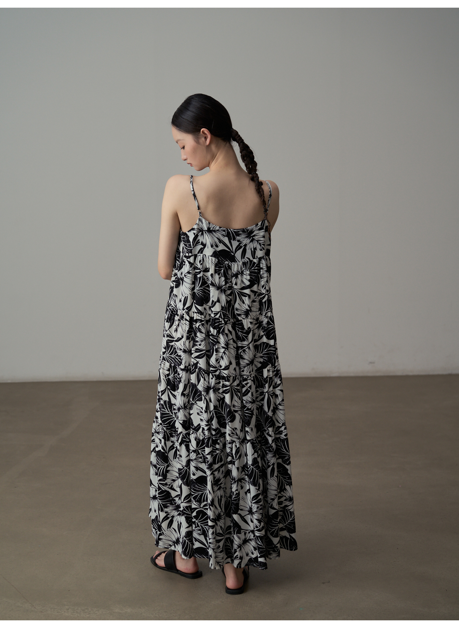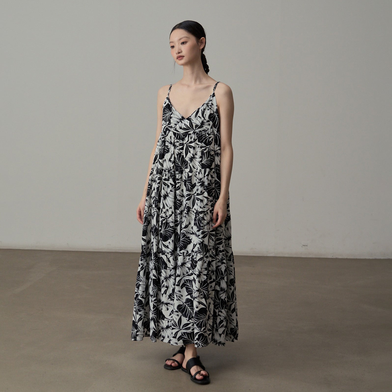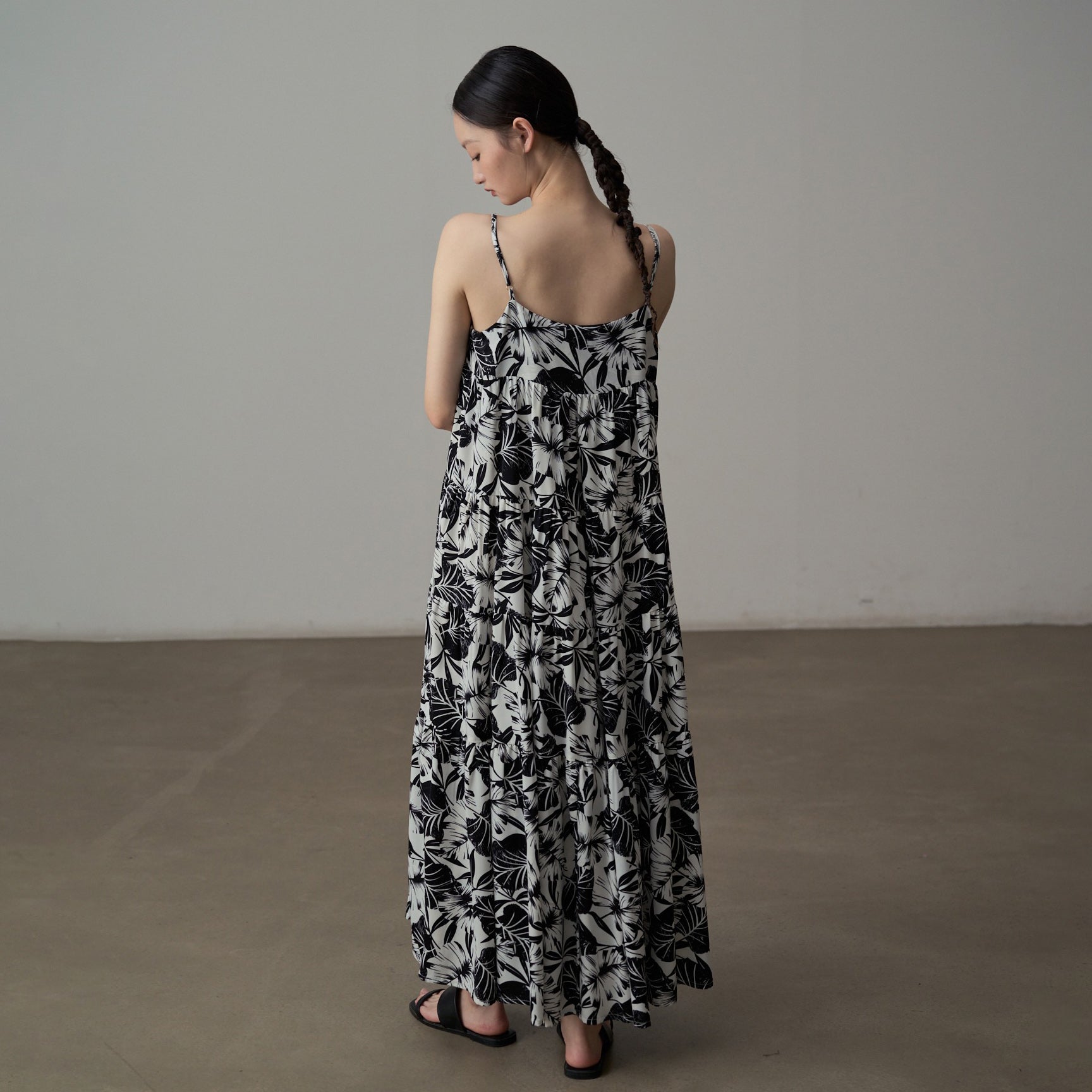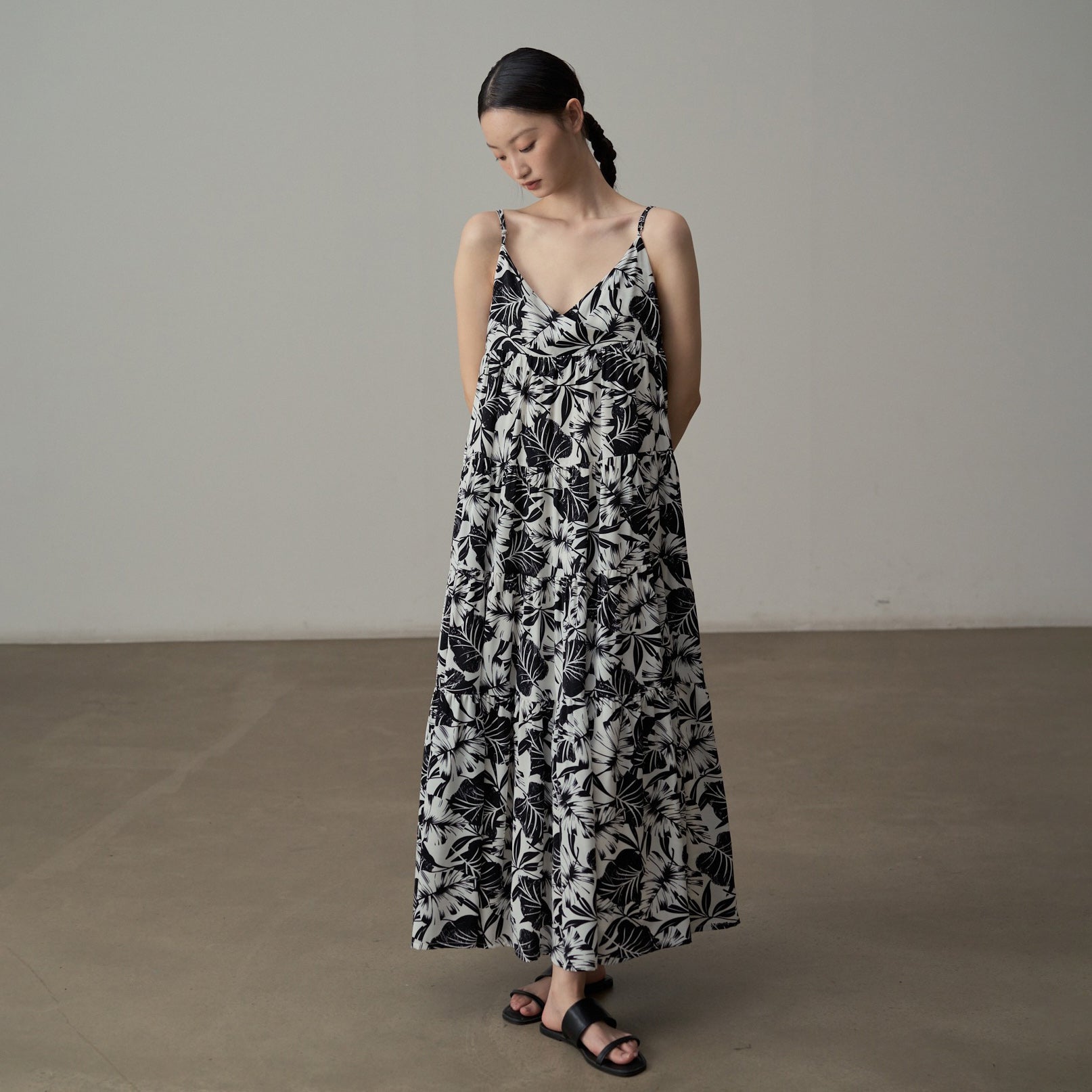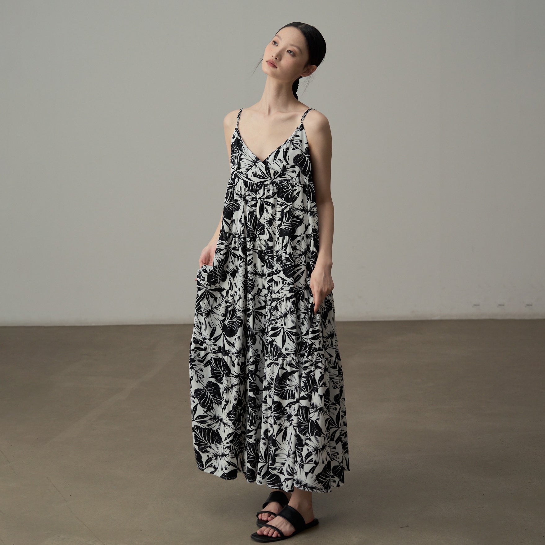 【ワンピース】フレンチシックなモノクロ花柄ワンピース ノースリーブ ゆる可愛スリム見えデザイン【SHシリーズ】