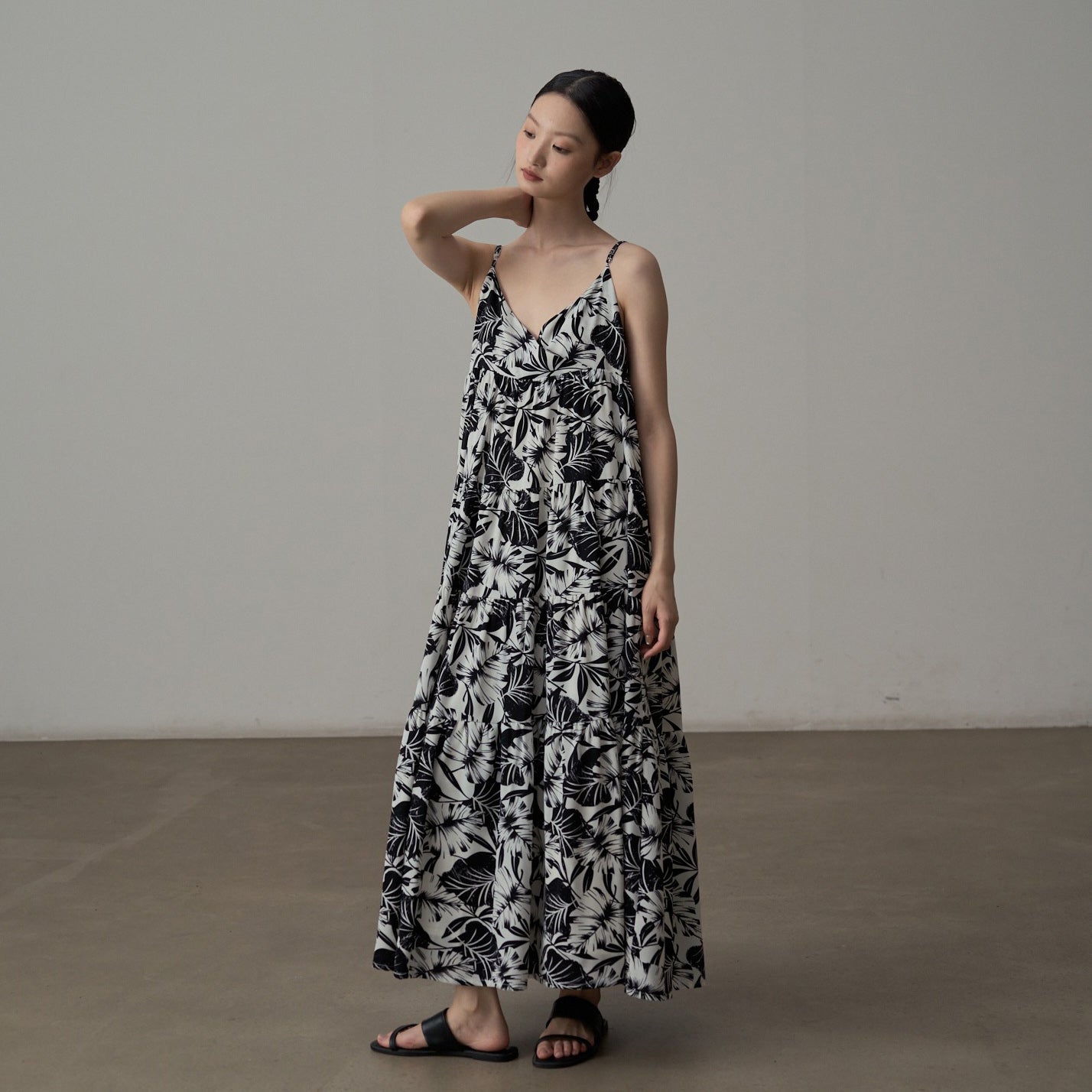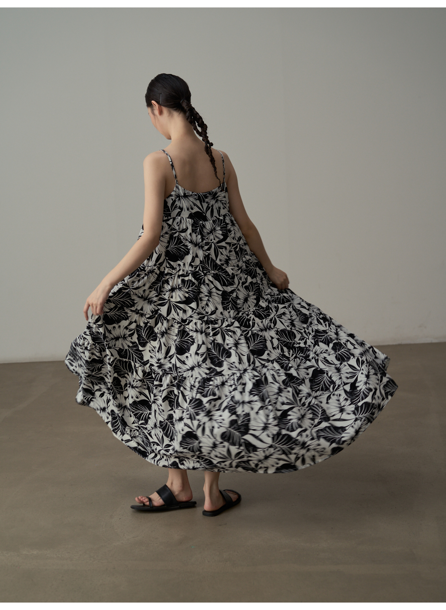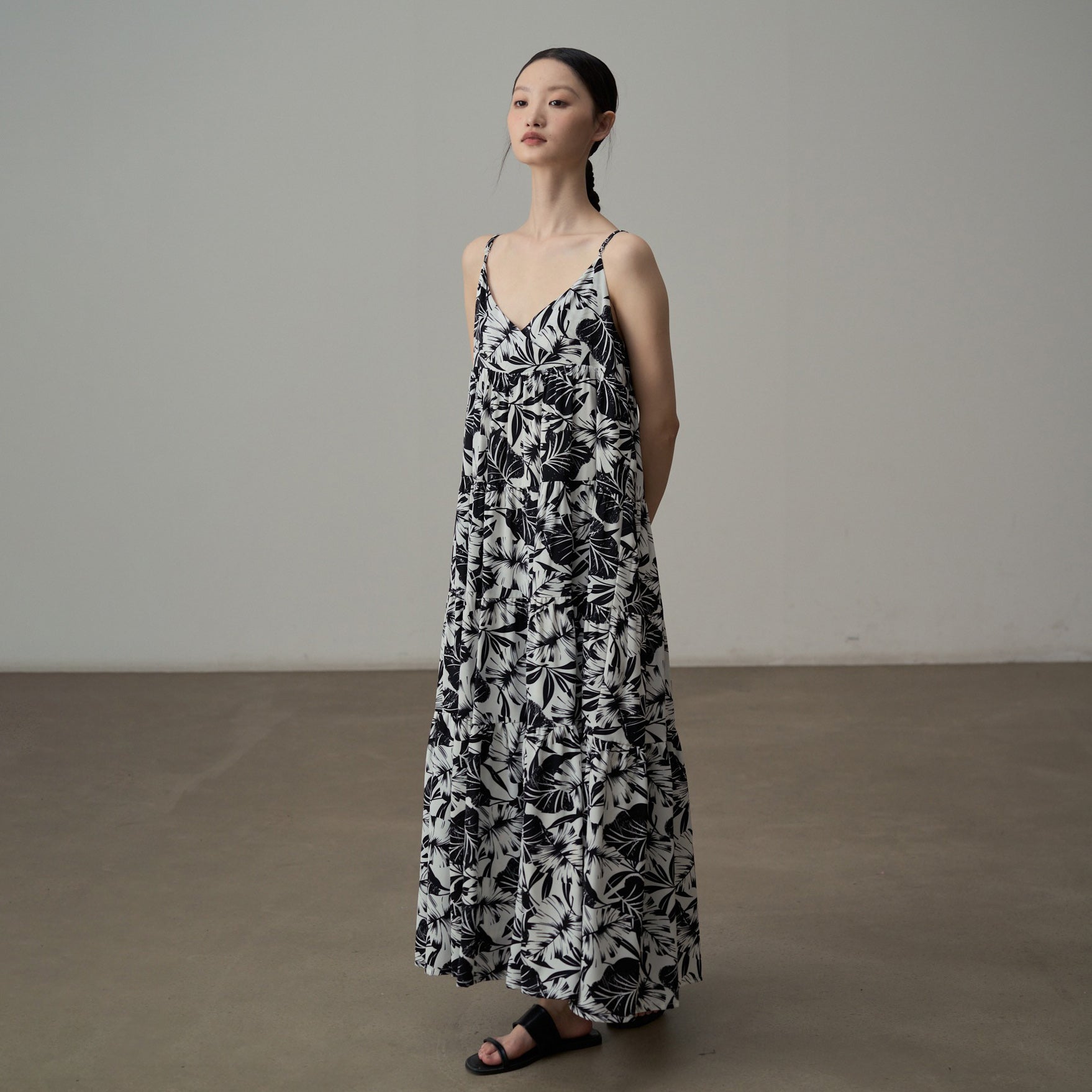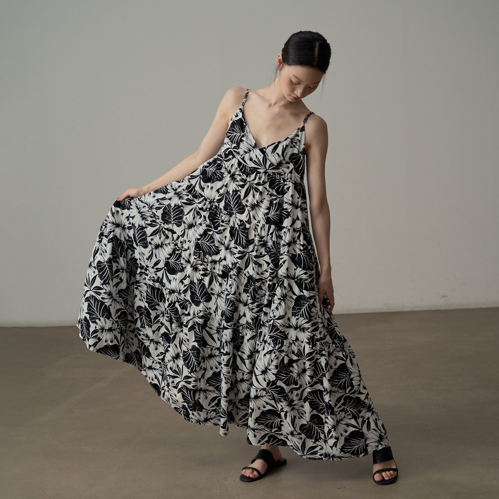 【商品名】【ワンピース】フレンチシックなモノクロ花柄ワンピース ノースリーブ ゆる可愛スリム見えデザイン【SHシリーズ】