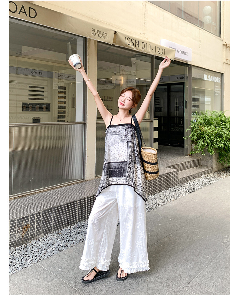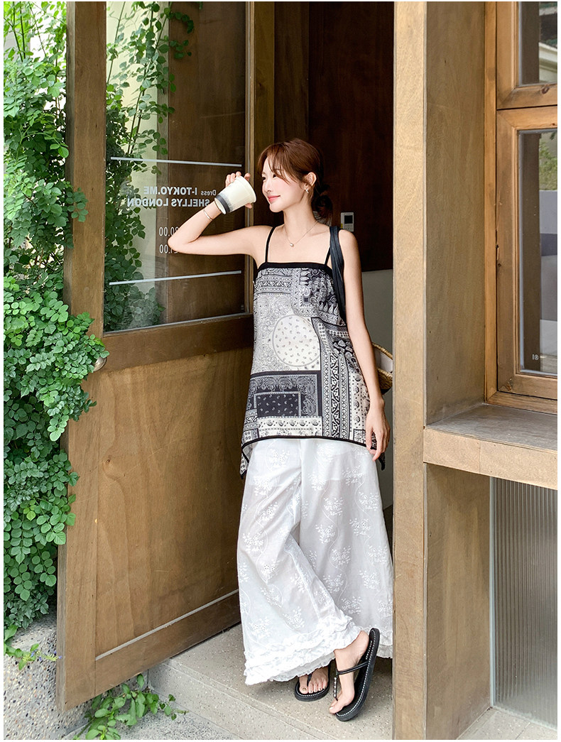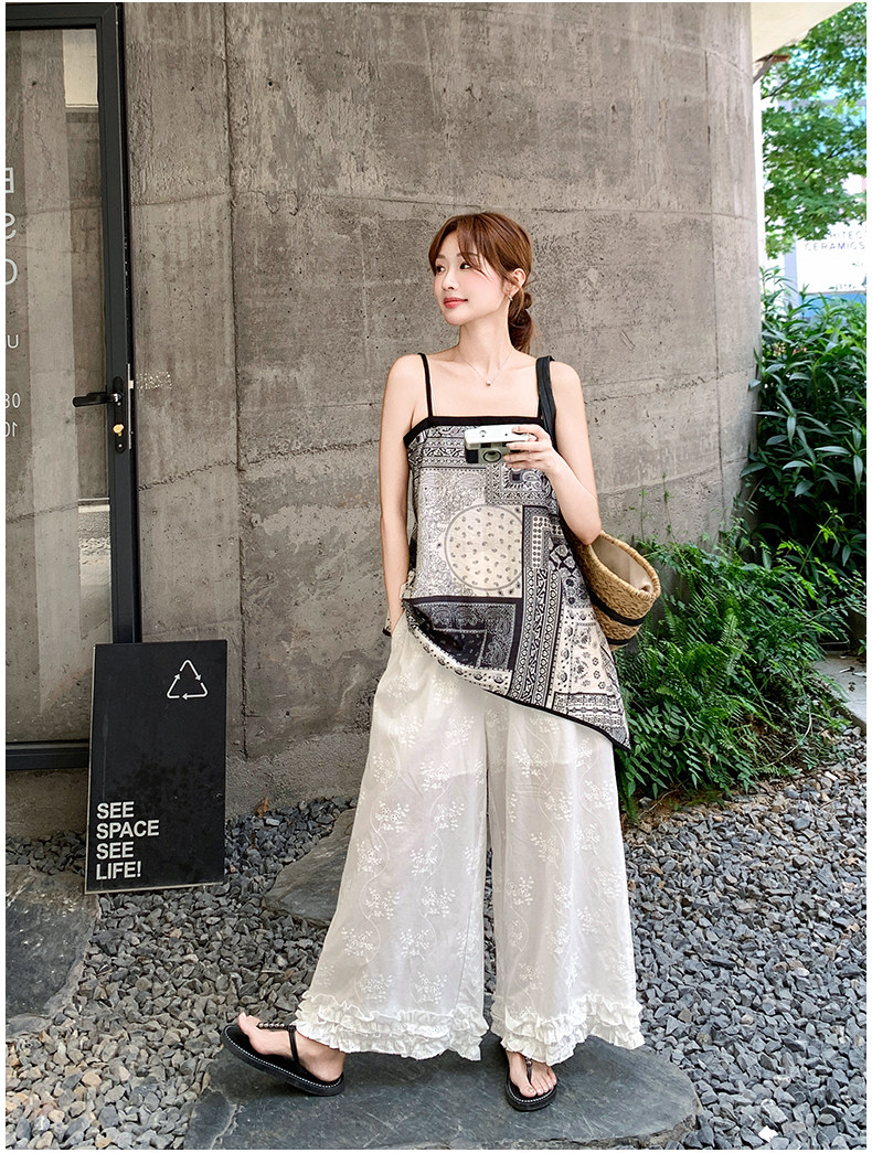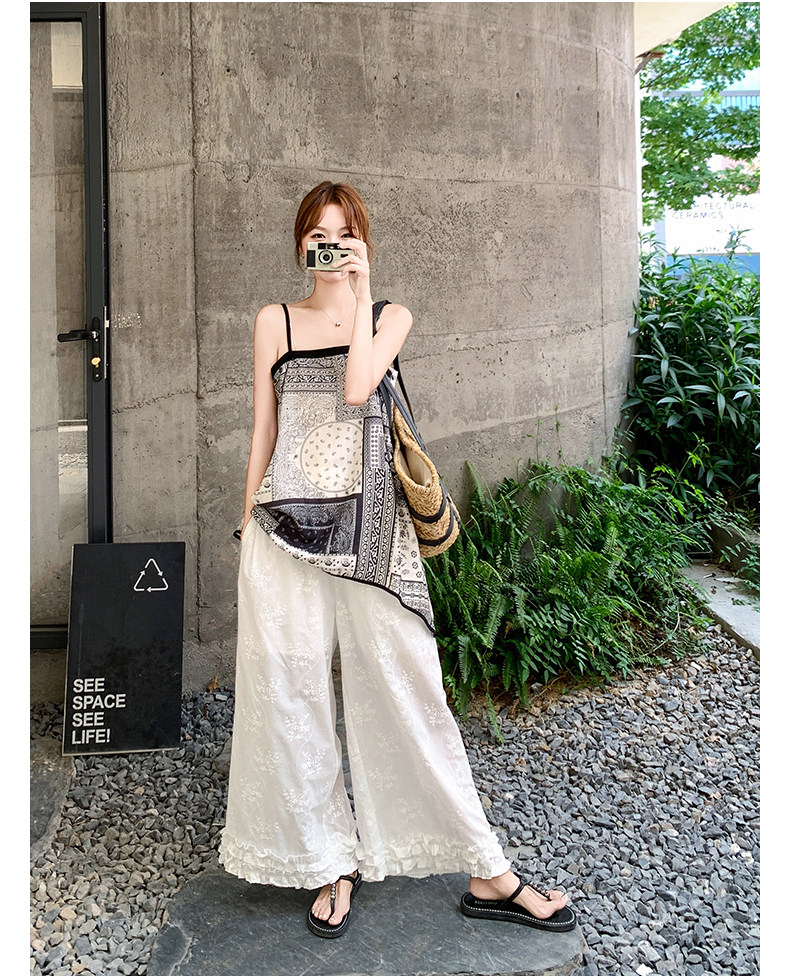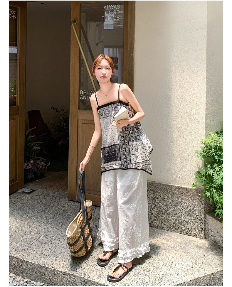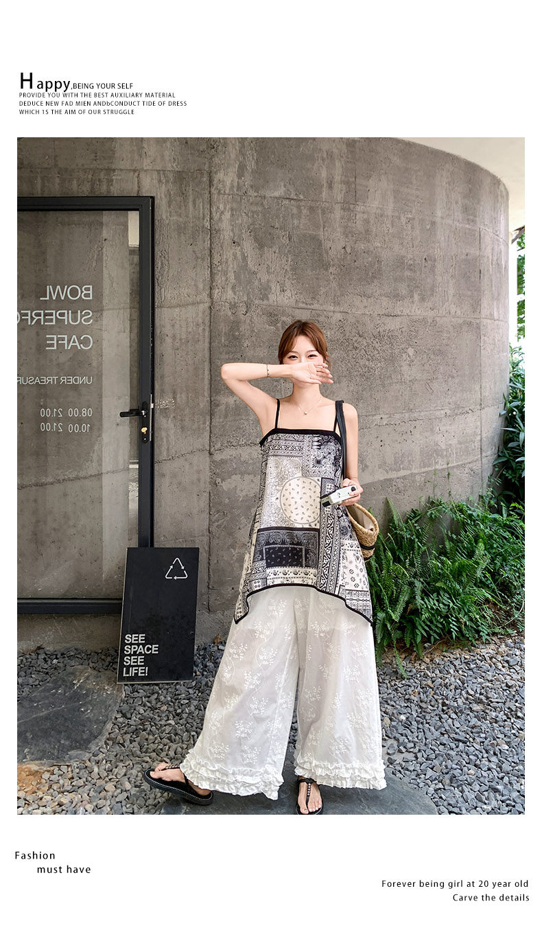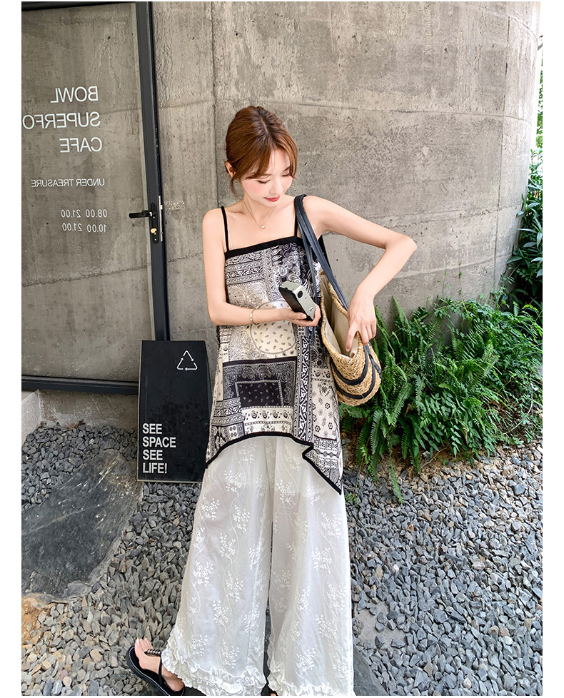 2点セット!【セットアップ】デザイン性抜群!エスニック風 花柄キャミ+刺繍ワイドパンツ上下セット 小洒落感たっぷり【SHシリーズ】