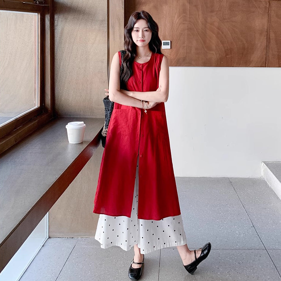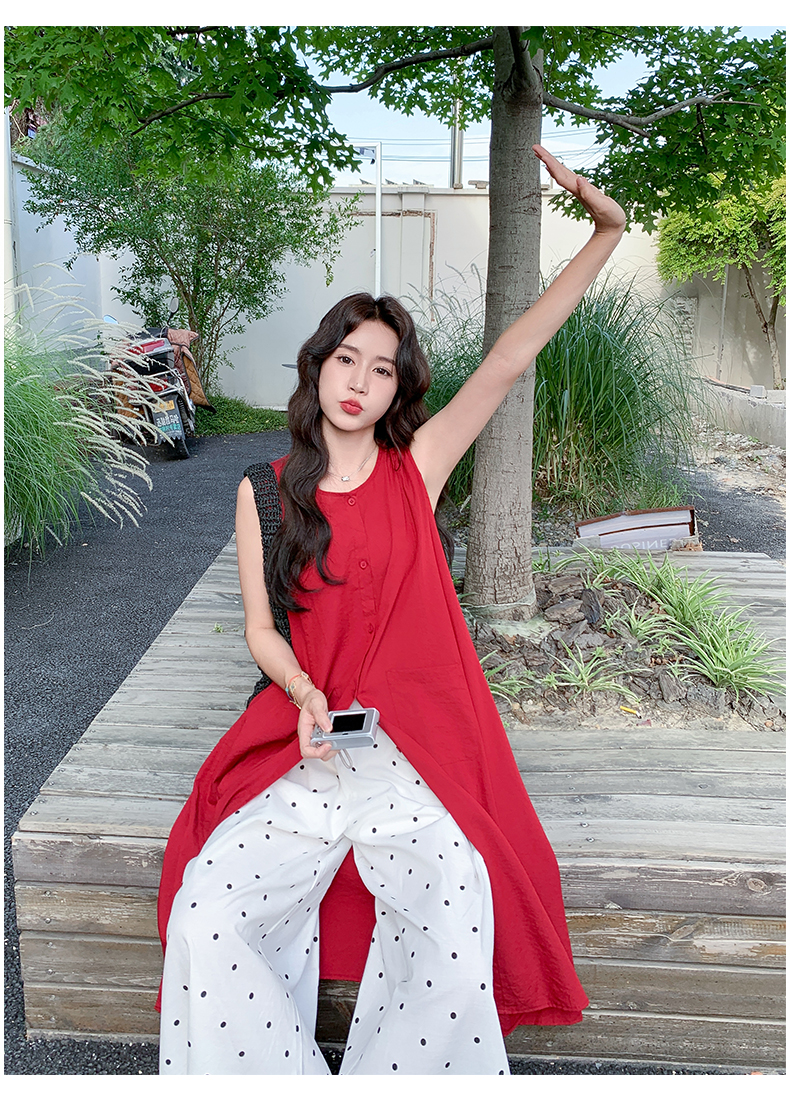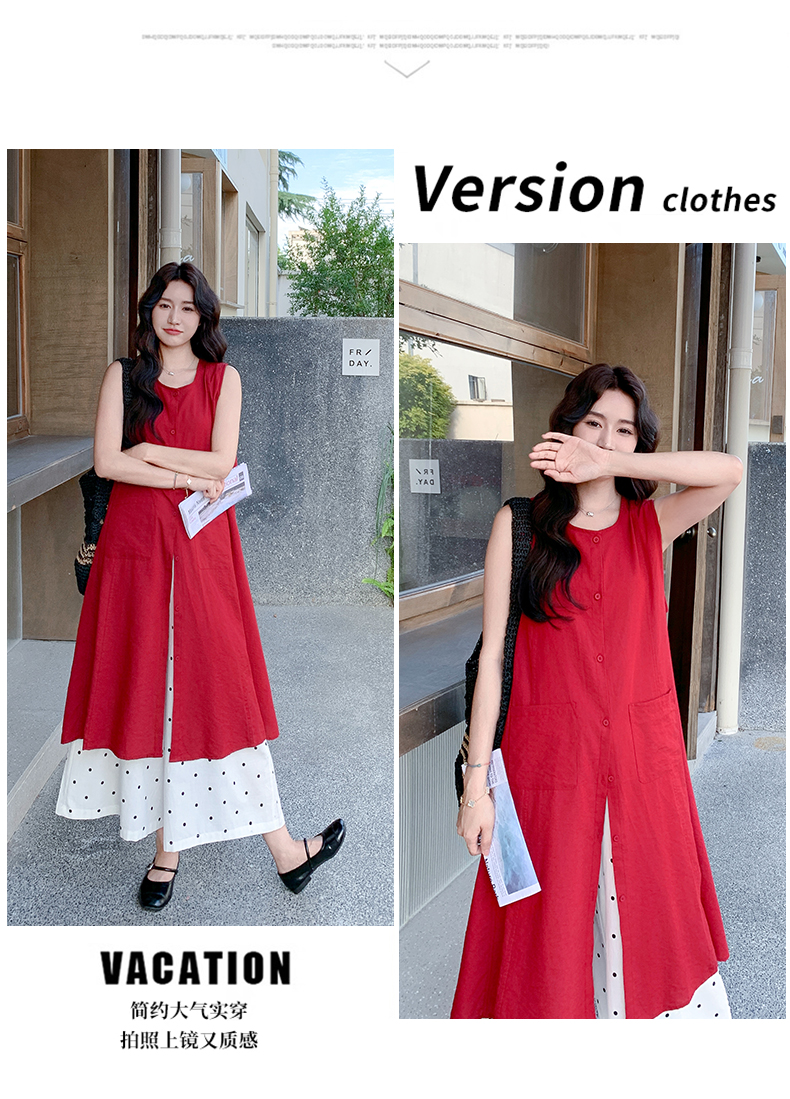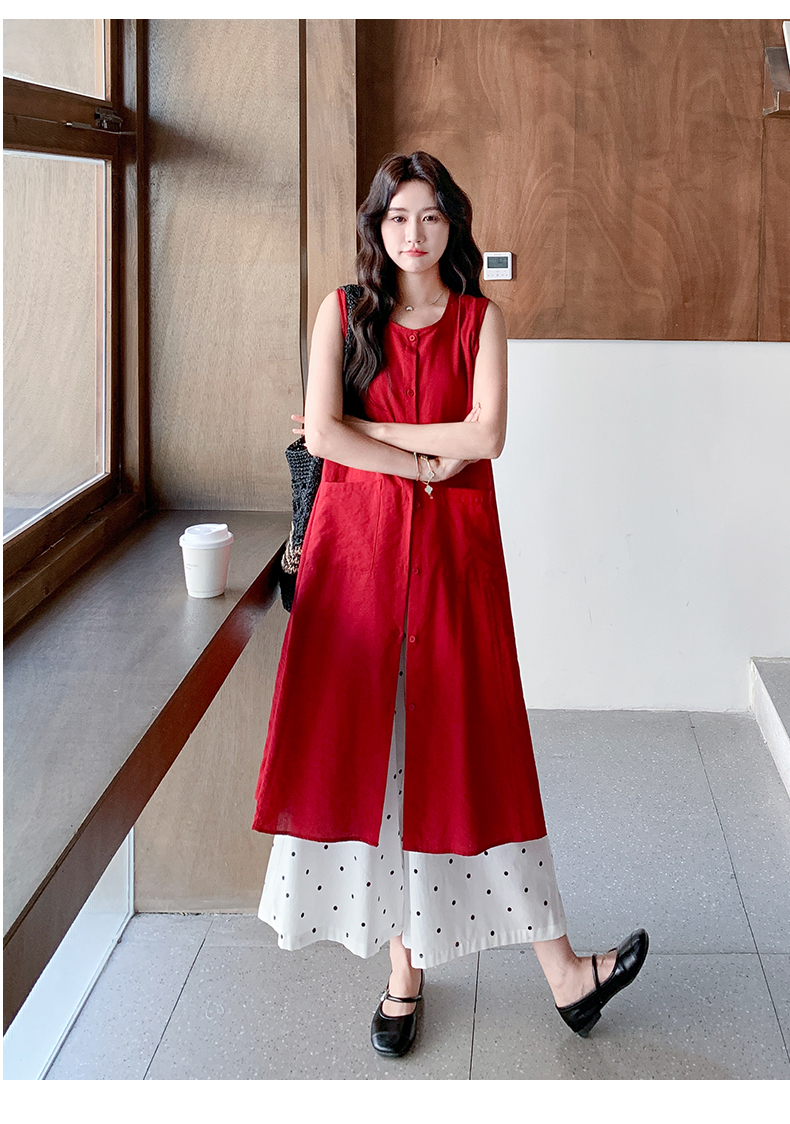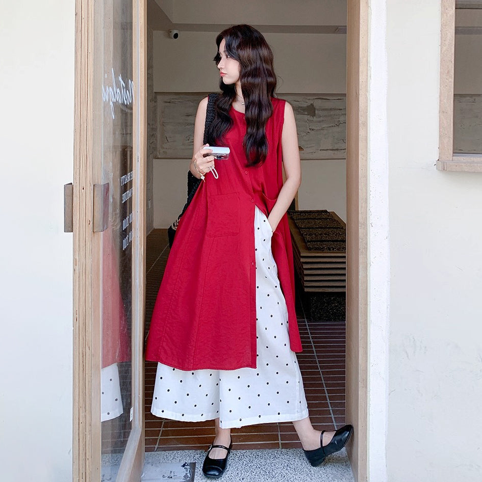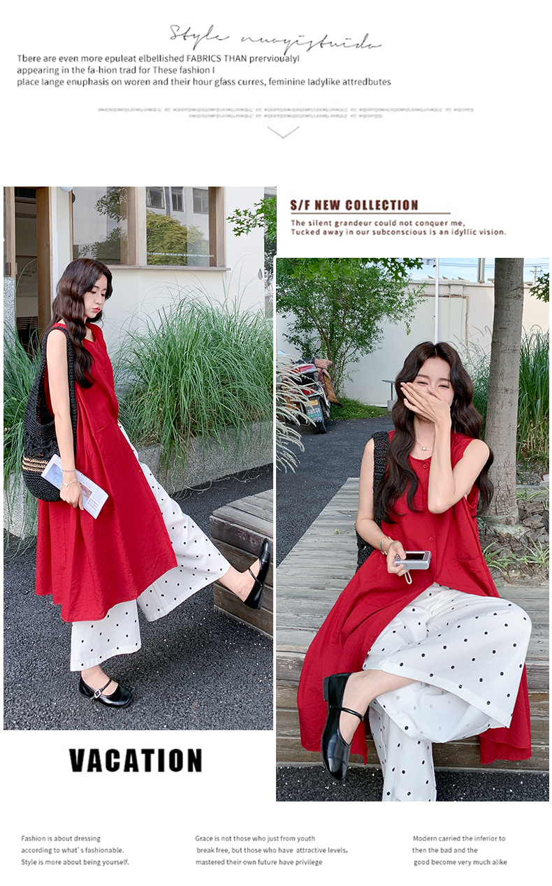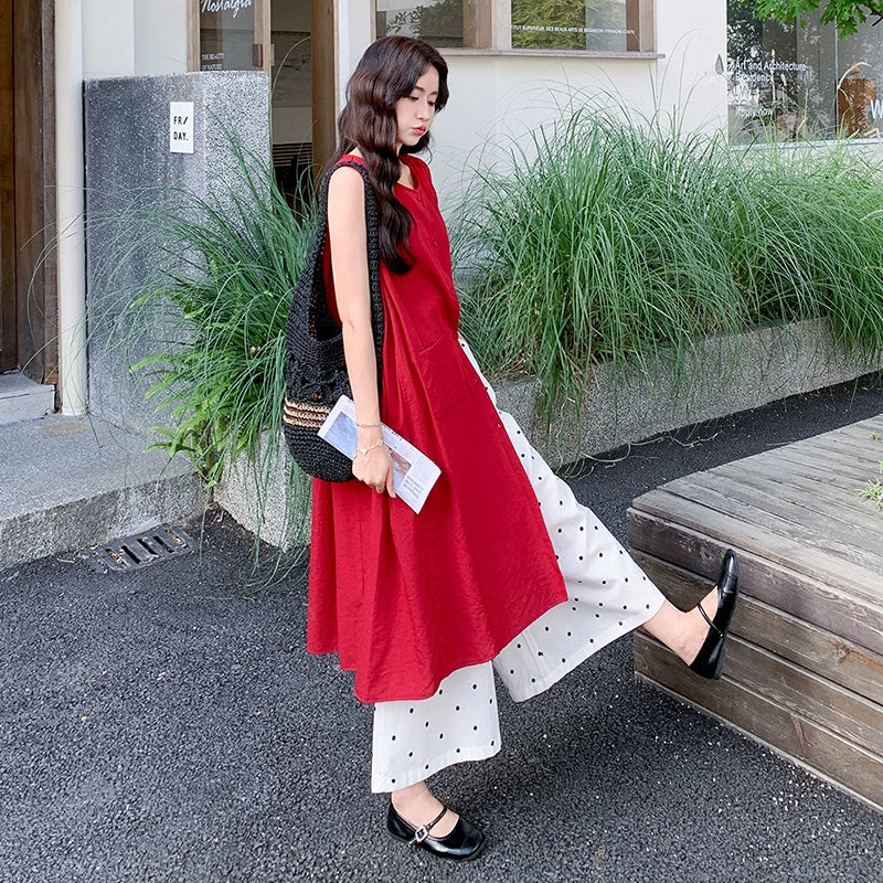 【商品名】2点セット!【ボトムス】赤ノースリーブロングジレワンピース+ドットワイドパンツ 上下セットアップ 夏コーデ【JZシリーズ】