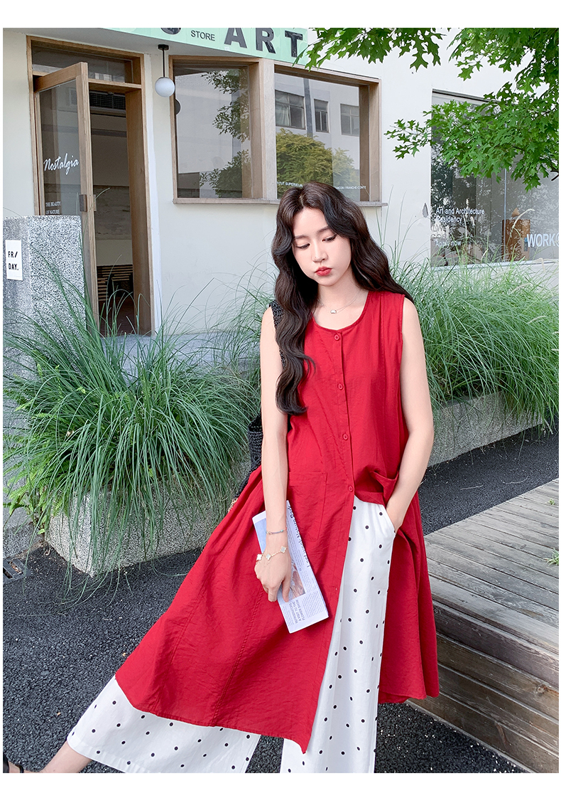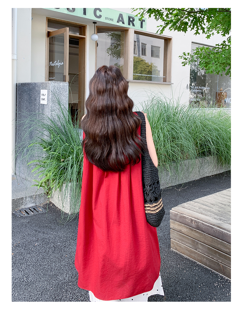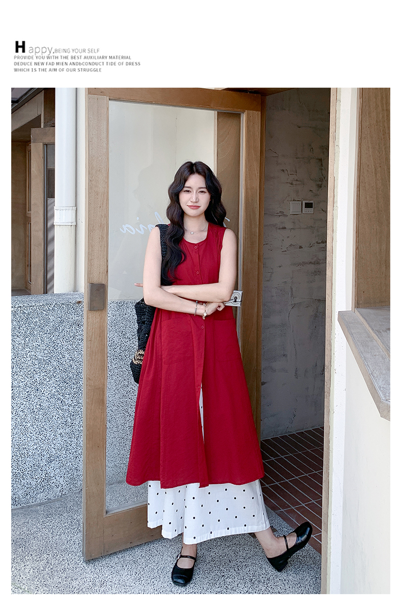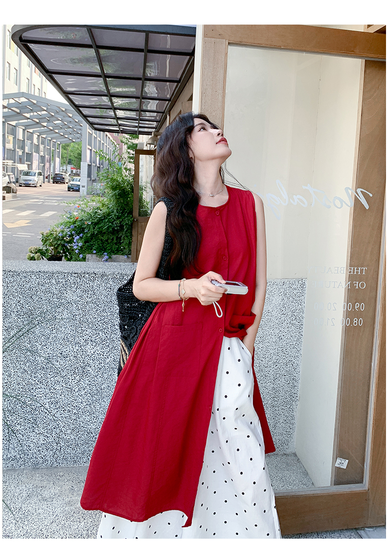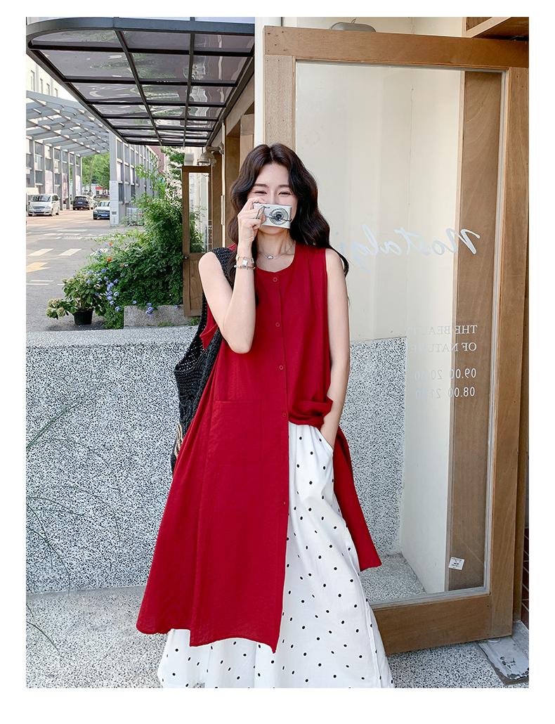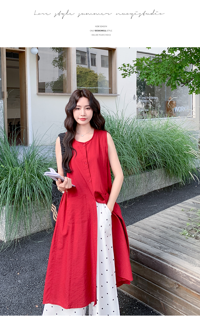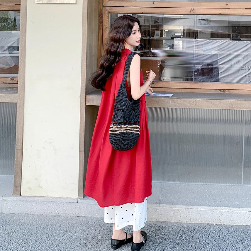 【商品名】2点セット!【ボトムス】赤ノースリーブロングジレワンピース+ドットワイドパンツ 上下セットアップ 夏コーデ【JZシリーズ】
