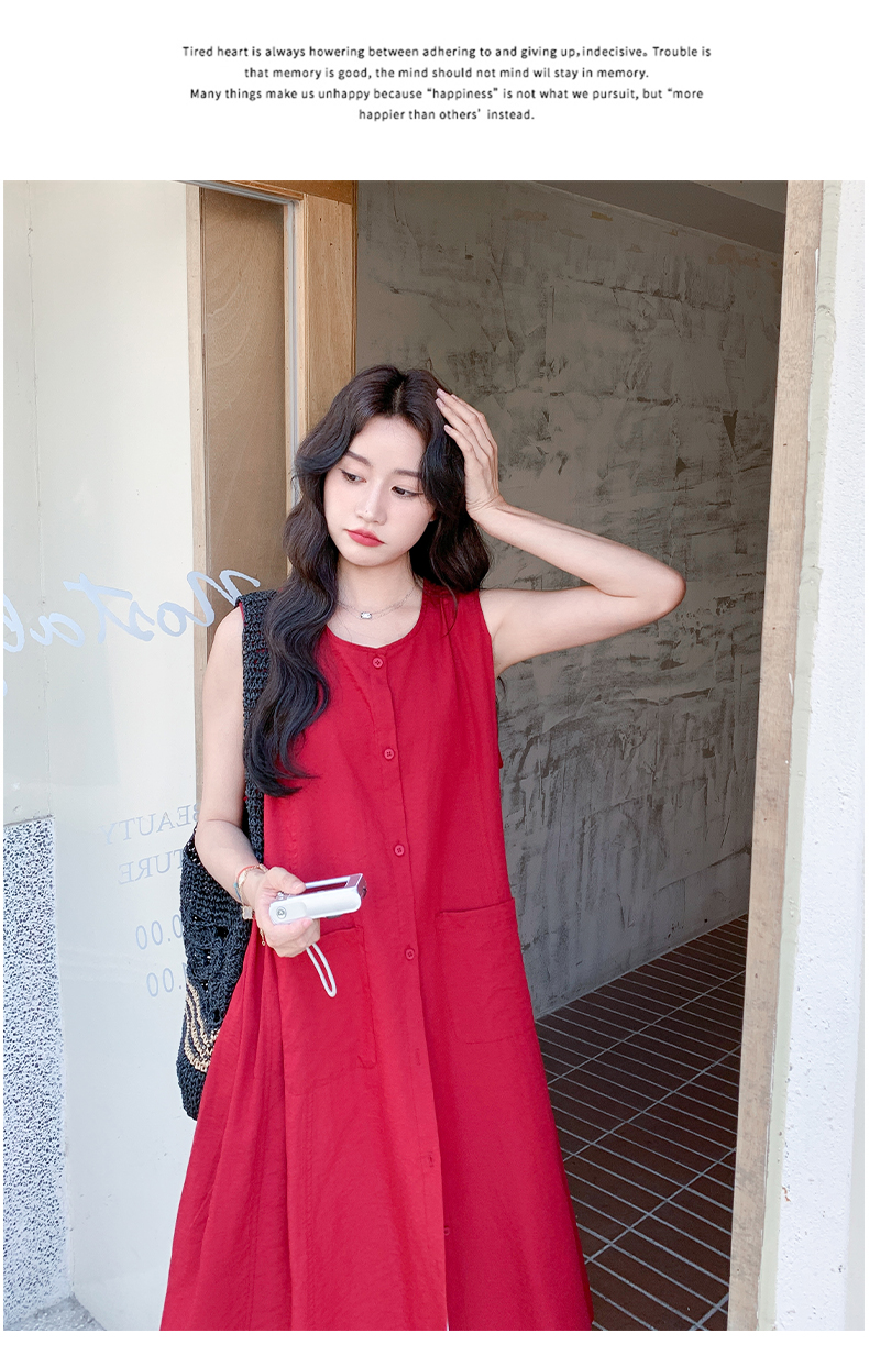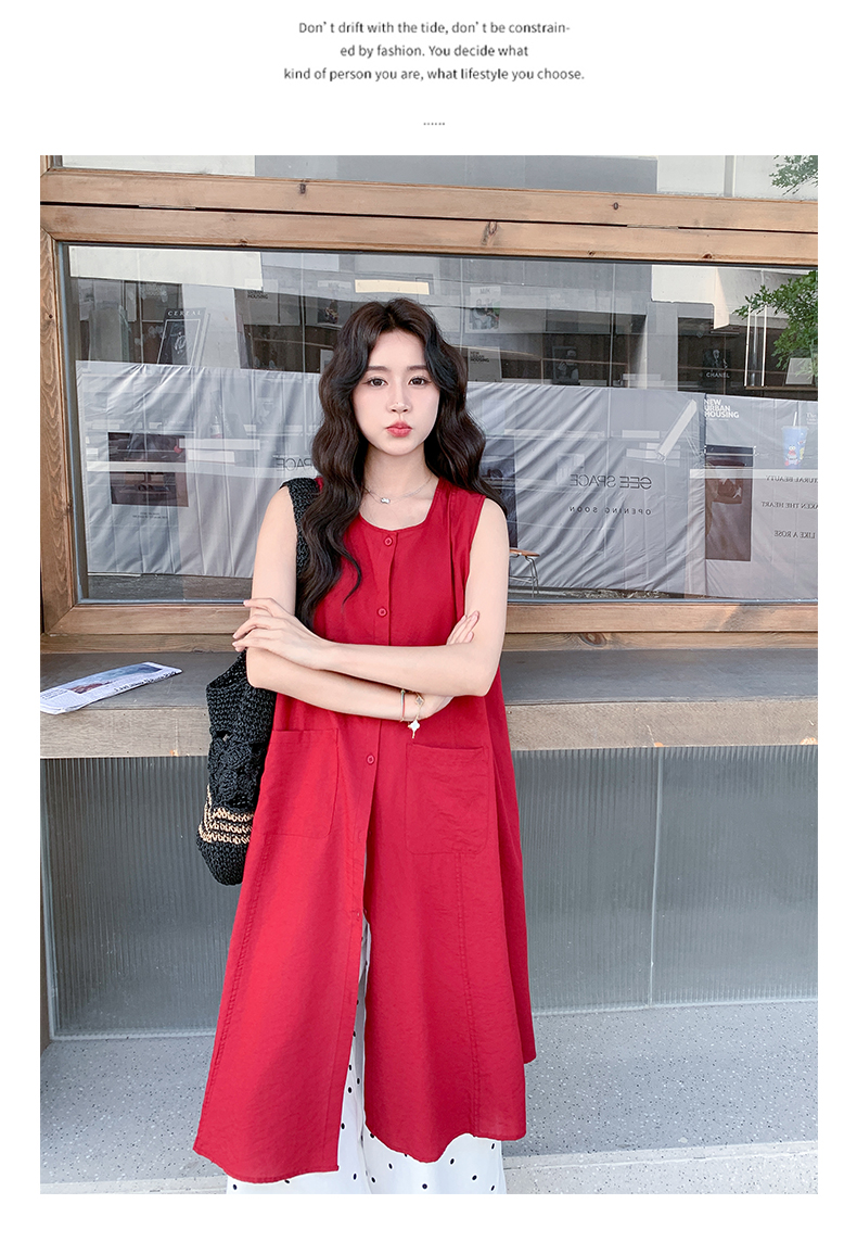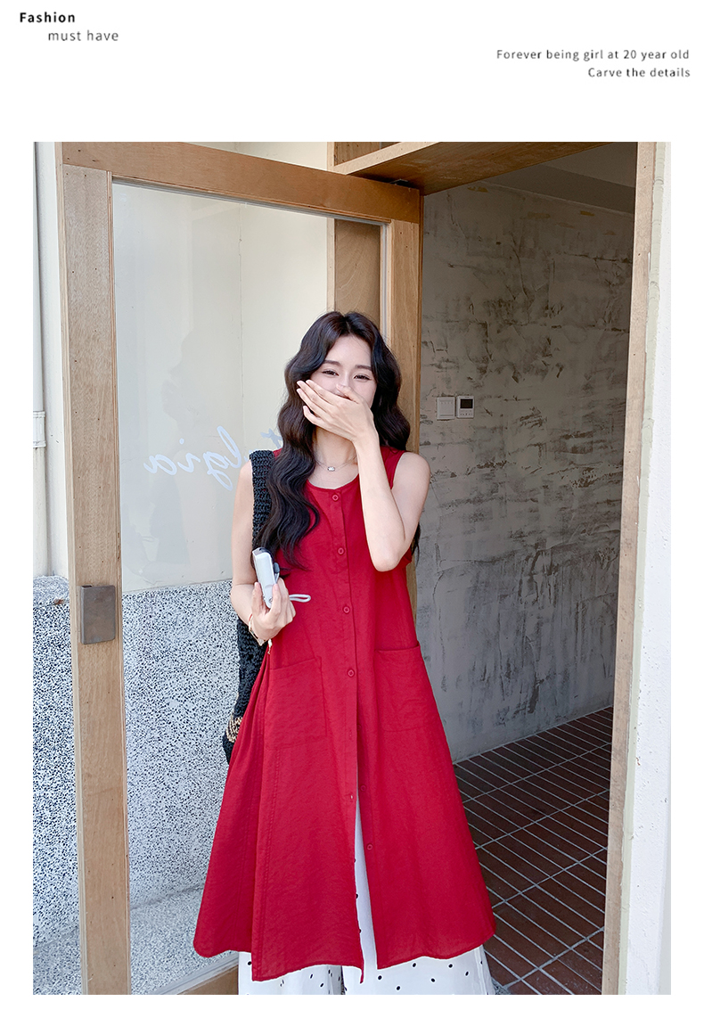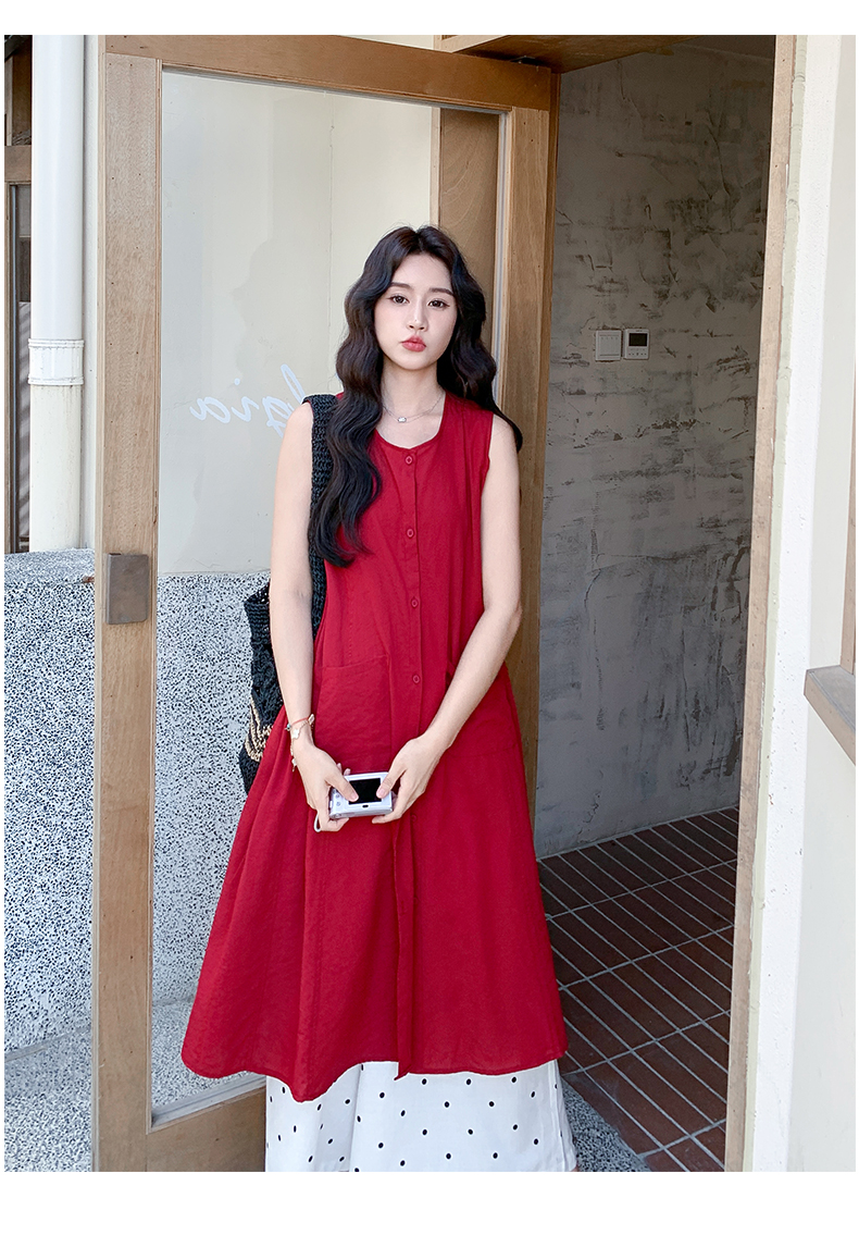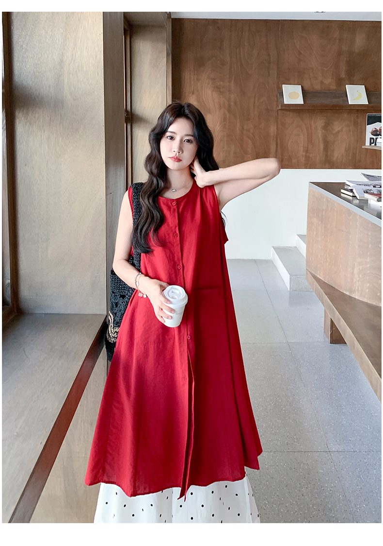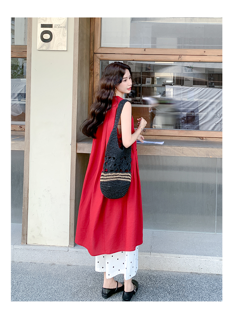 【商品名】2点セット!【ボトムス】赤ノースリーブロングジレワンピース+ドットワイドパンツ 上下セットアップ 夏コーデ【JZシリーズ】