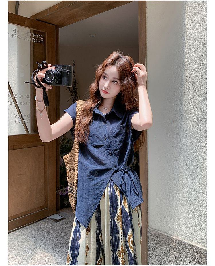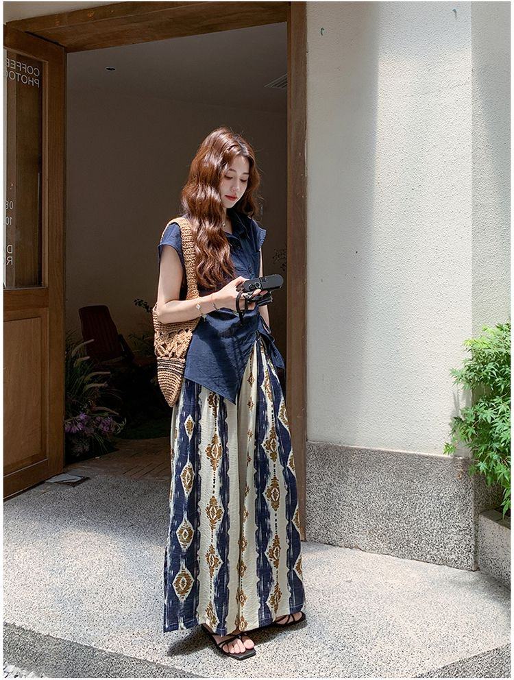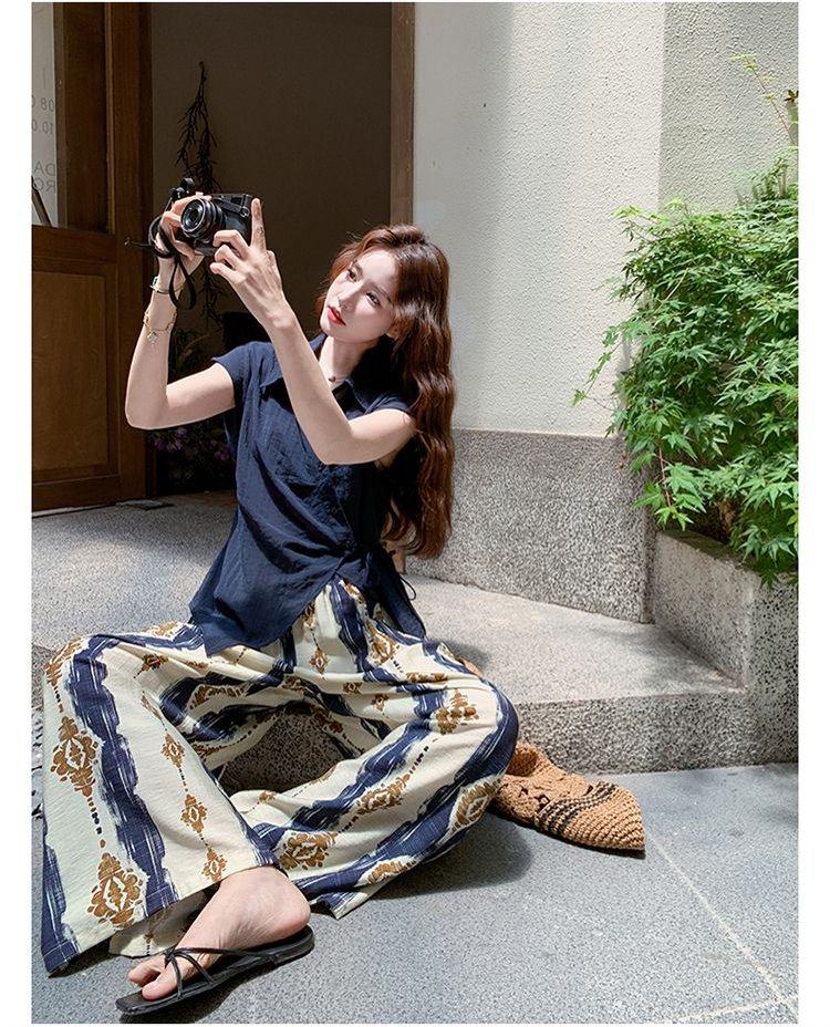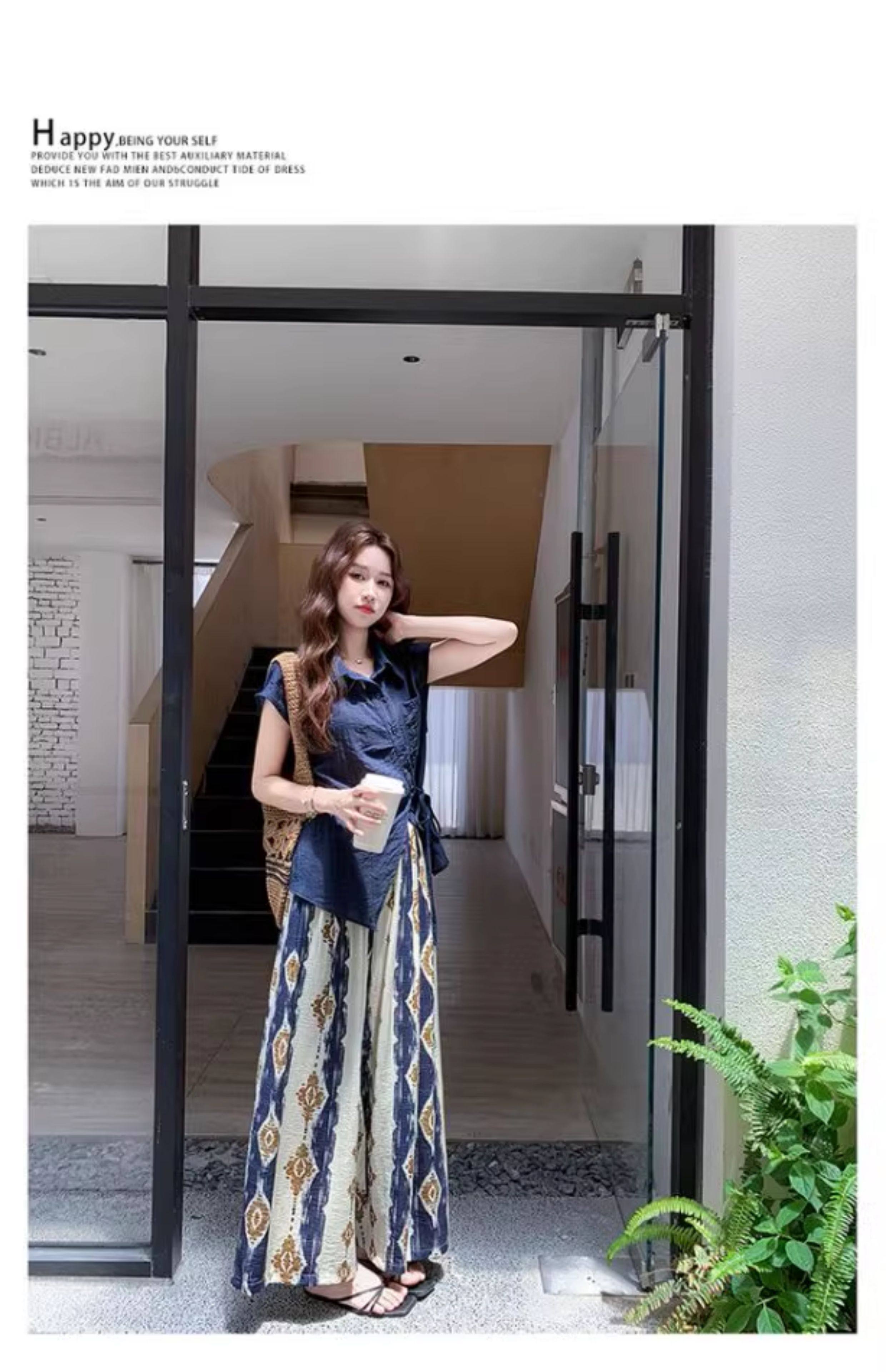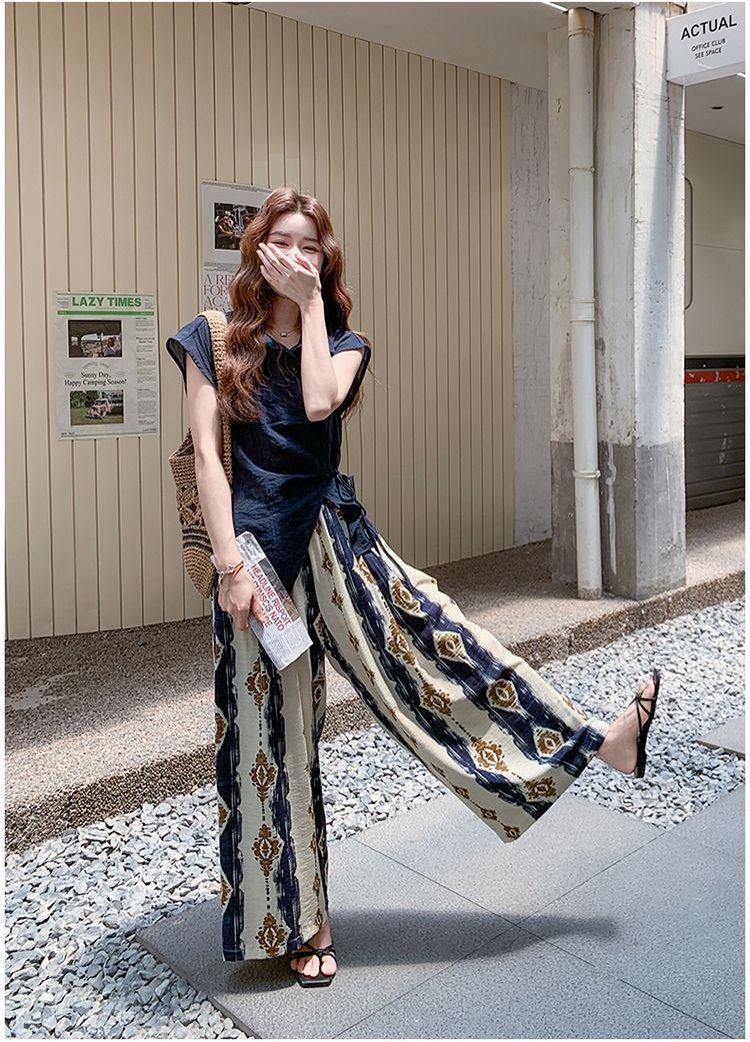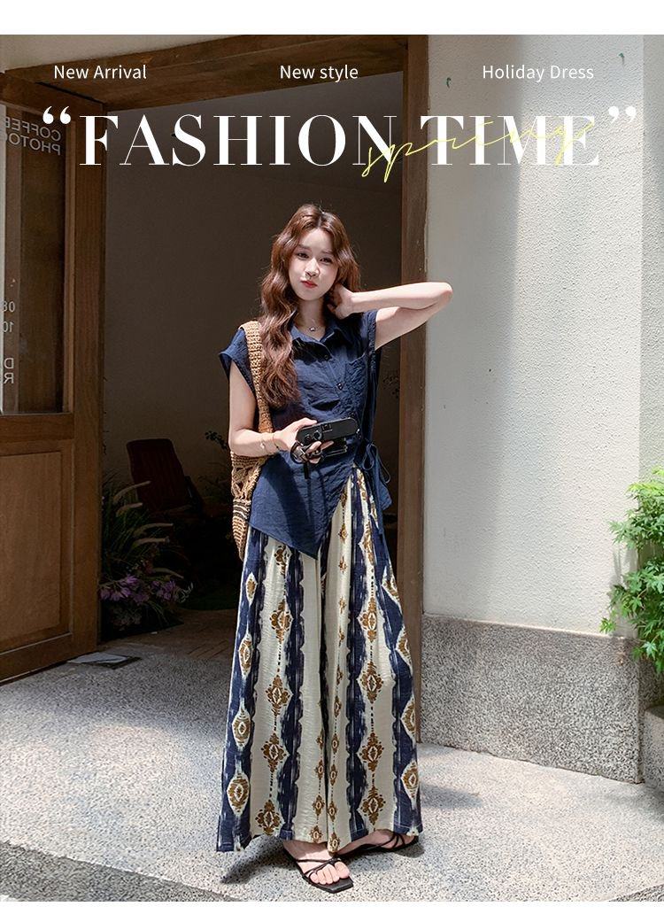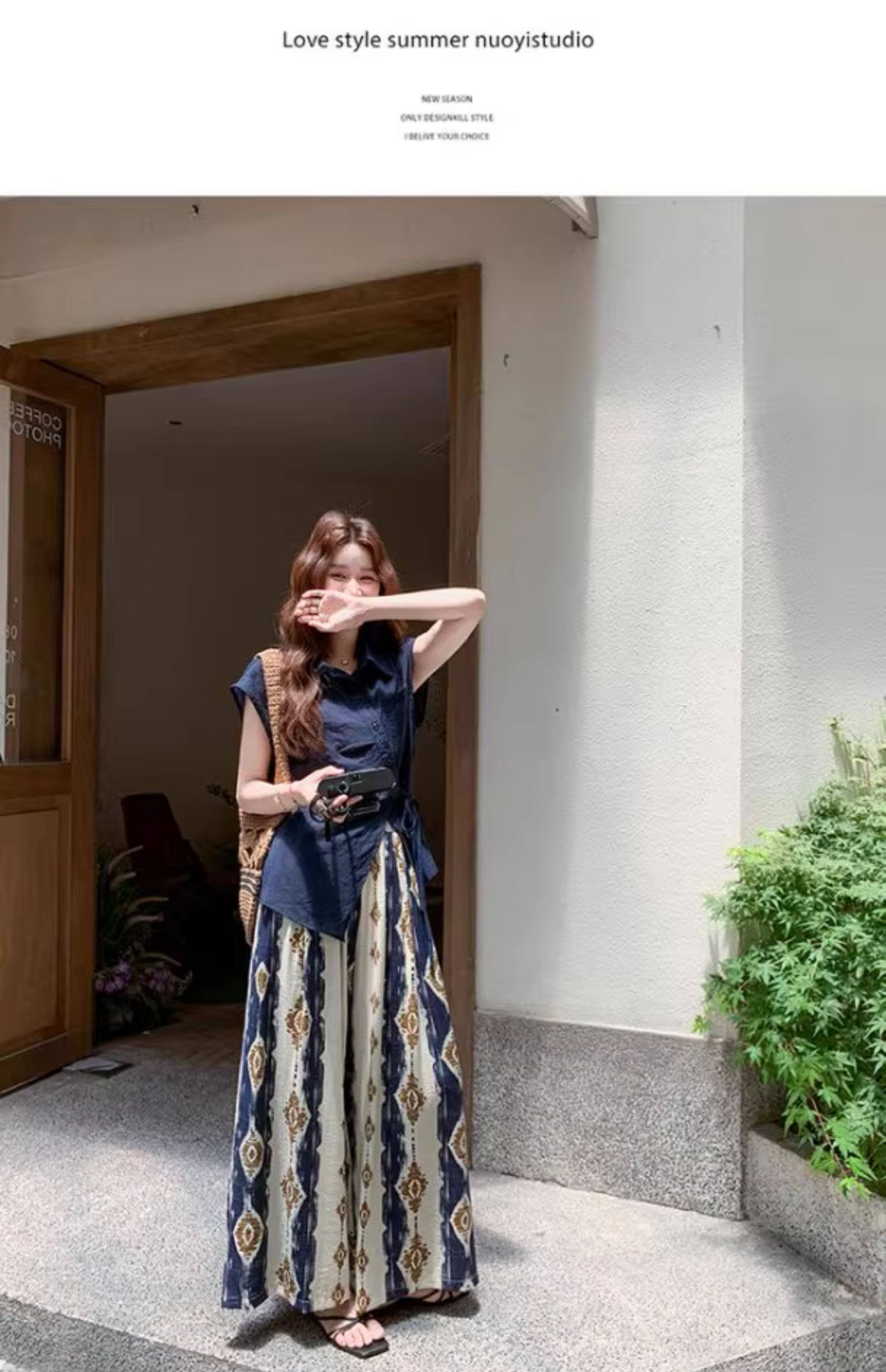 【商品名】2点セット!【ボトムス】レトロ感漂うアシンメトリー ノースリーブシャツ+プリントワイドパンツ 上下セットアップ【SHシリーズ】
