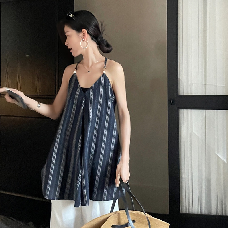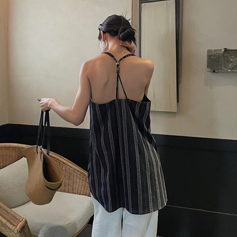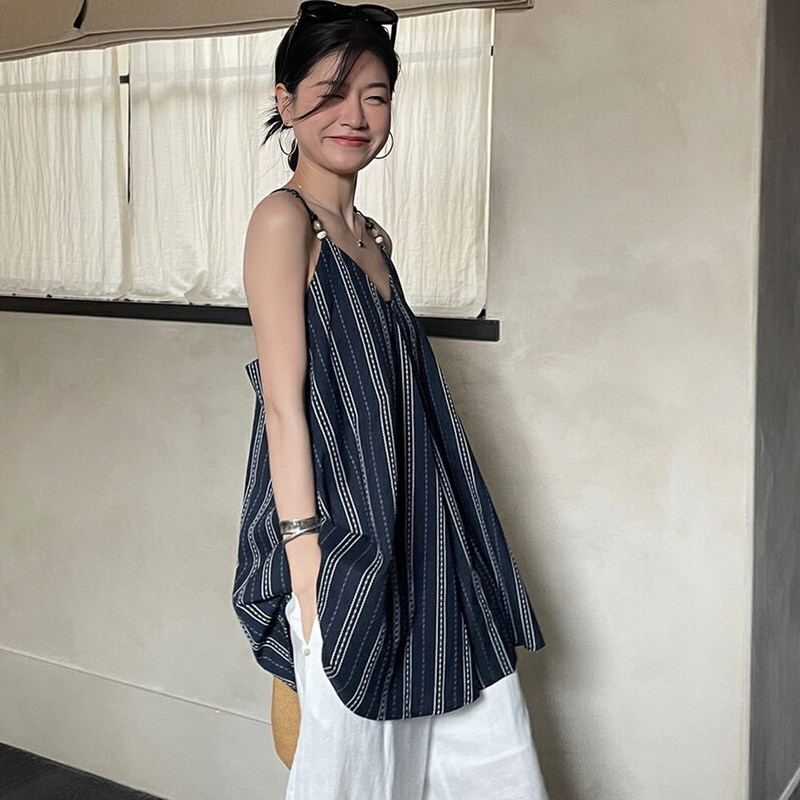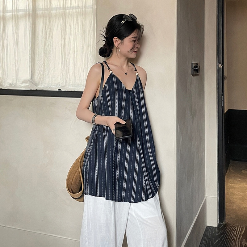 【トップス】夏 フレンチVネック ストライプキャミソール ゆったりシルエット×バックオープンが大人映え【SHシリーズ】