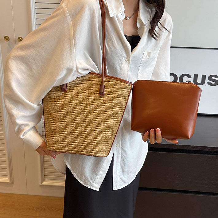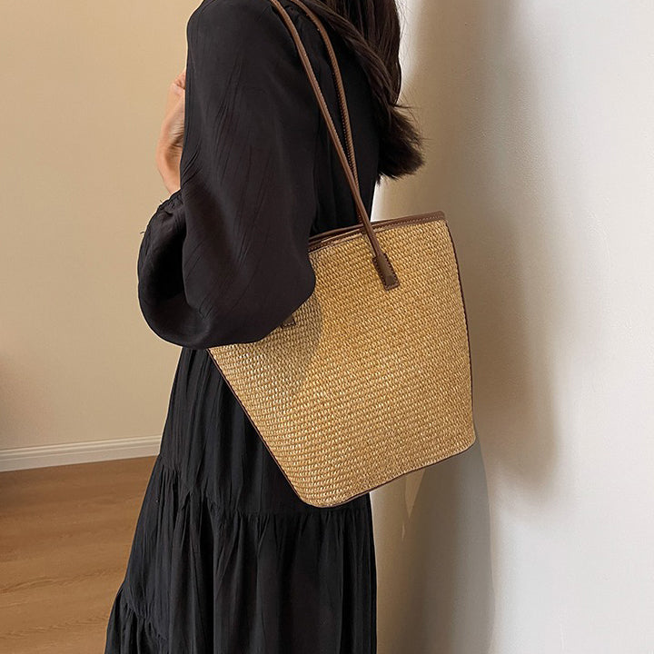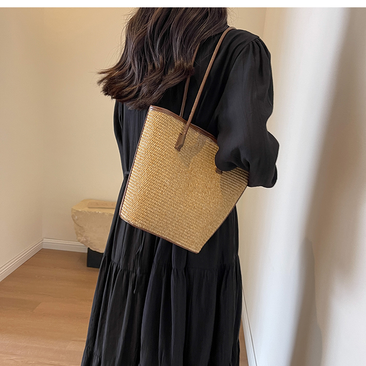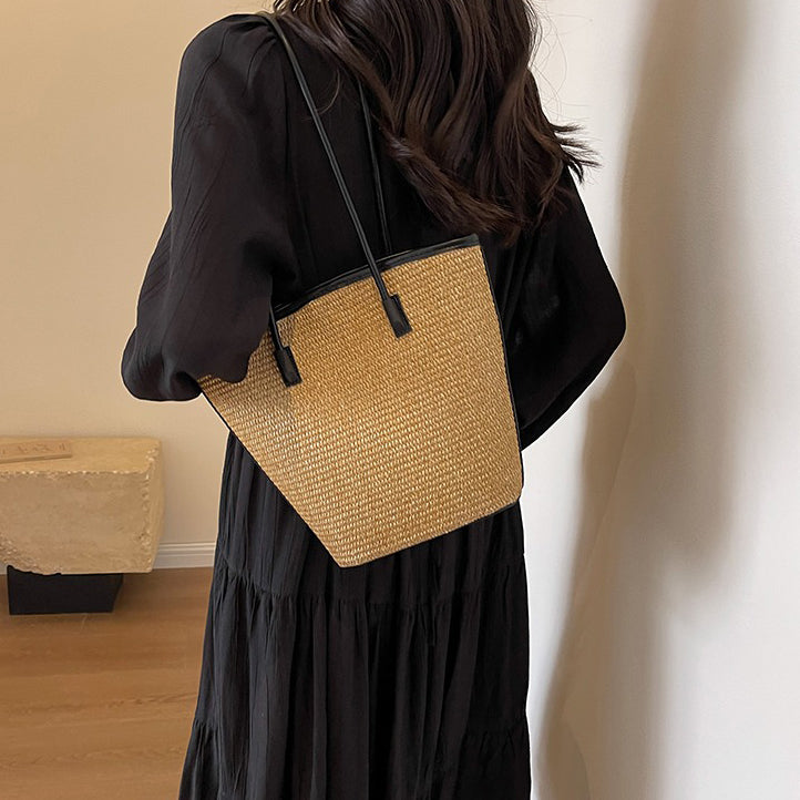 【商品名】内袋プレゼント!【バッグ】ラフィア風トートバッグ 大容量 通勤OK 流行バケツ型ショルダー