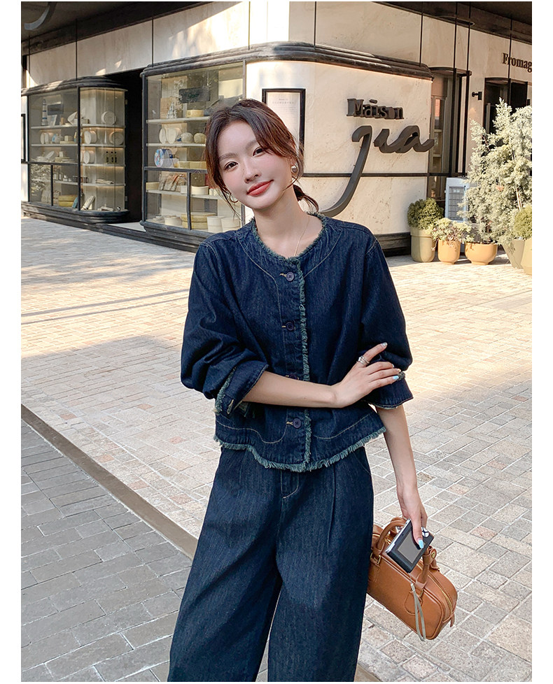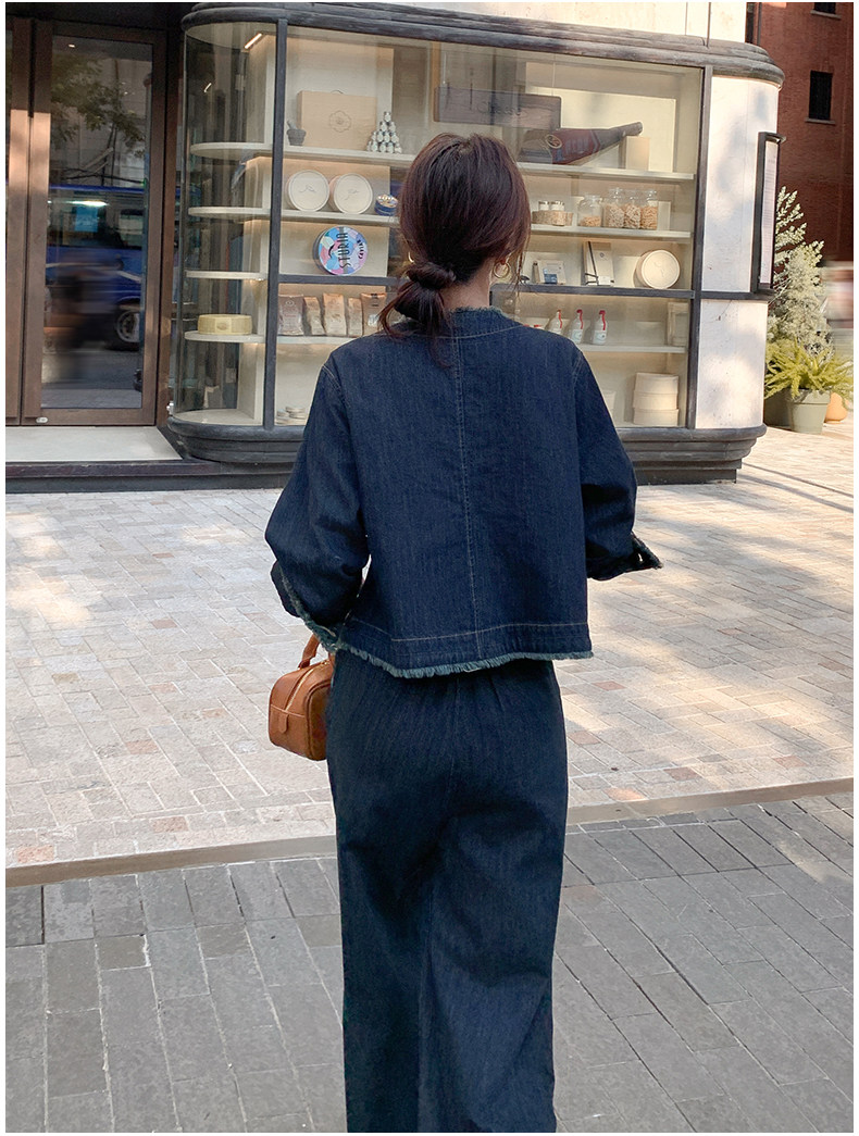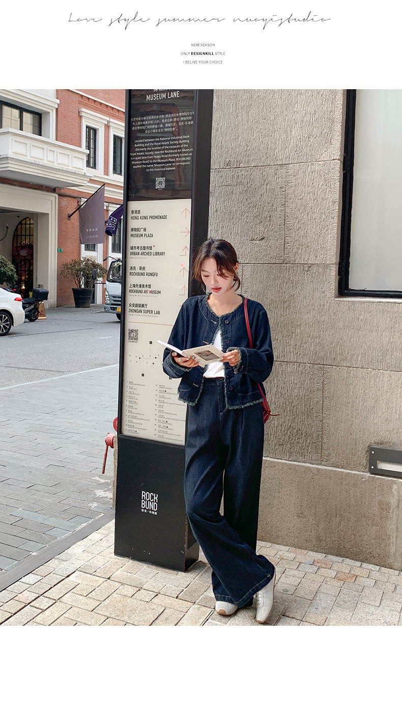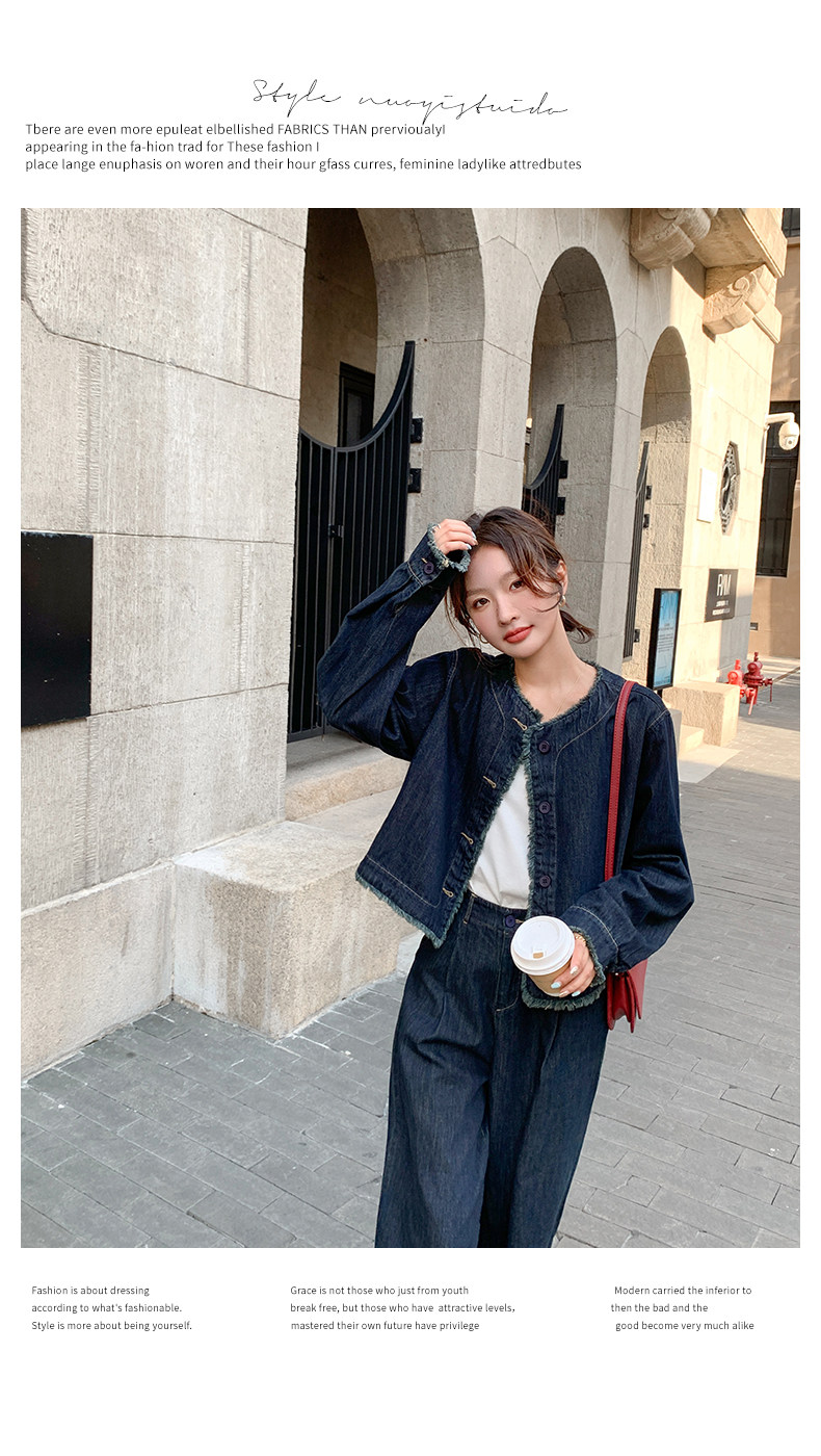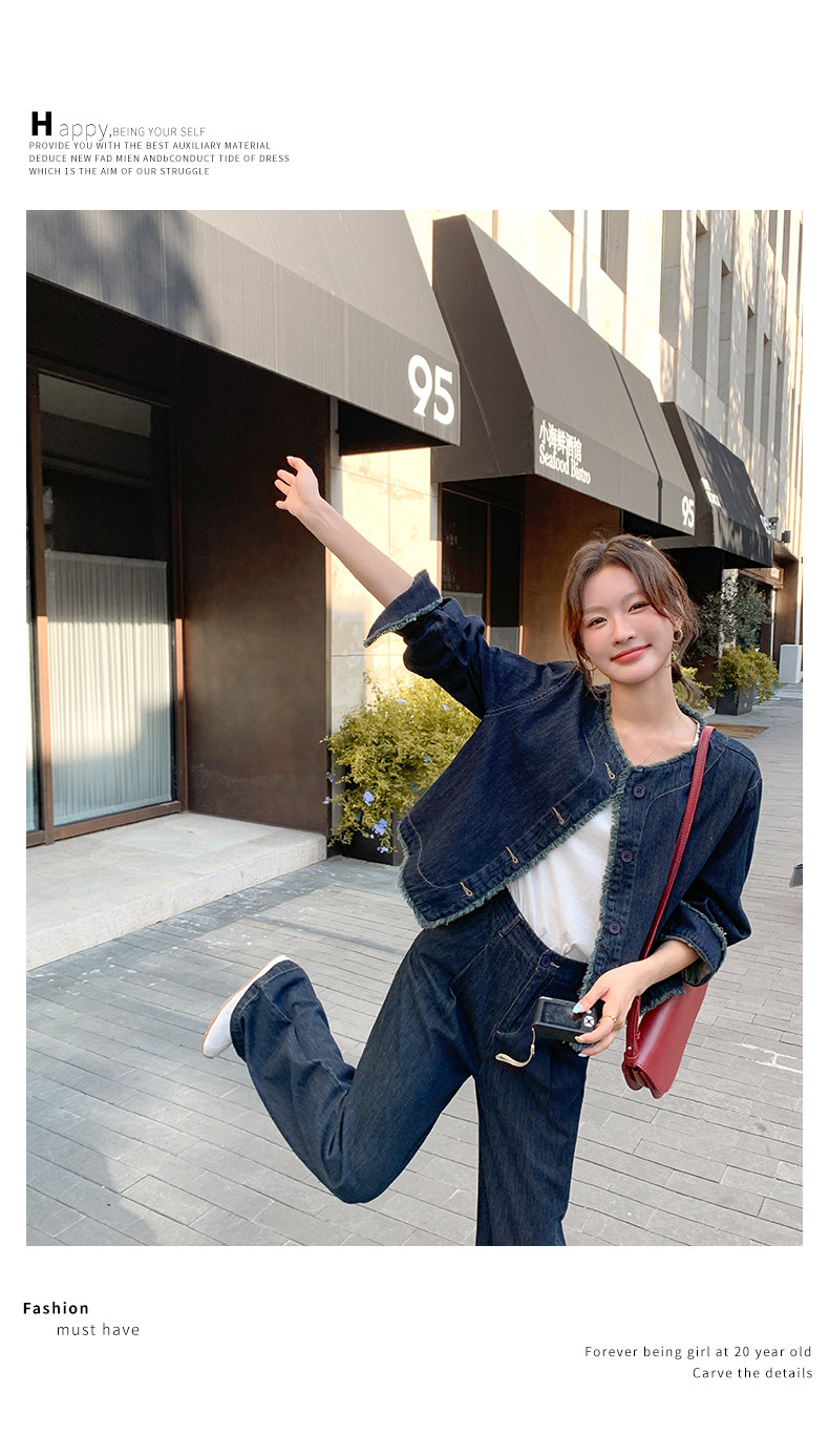 【商品名】2点セット!【ボトムス】春秋 細見えセットアップ レディース フリンジデニムジャケット+ワイドパンツ 上下セット【JZシリーズ】