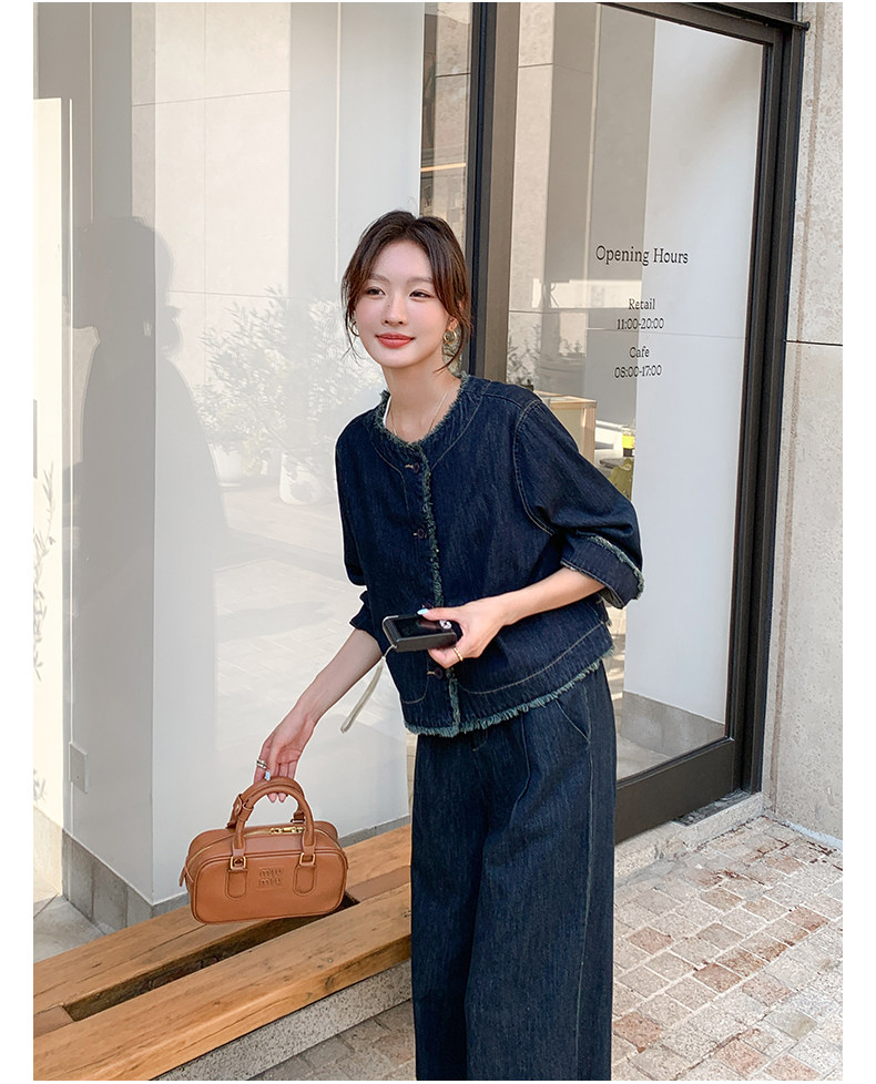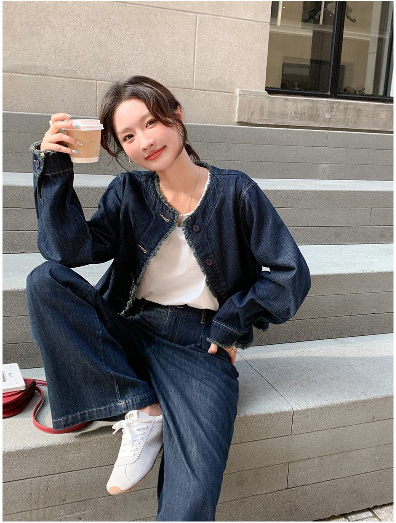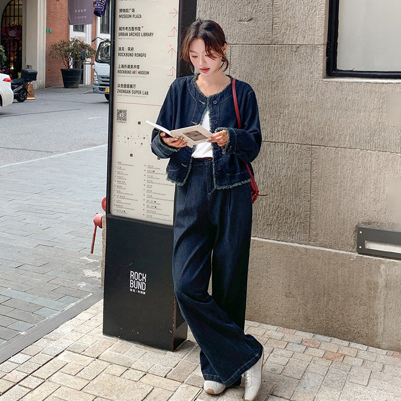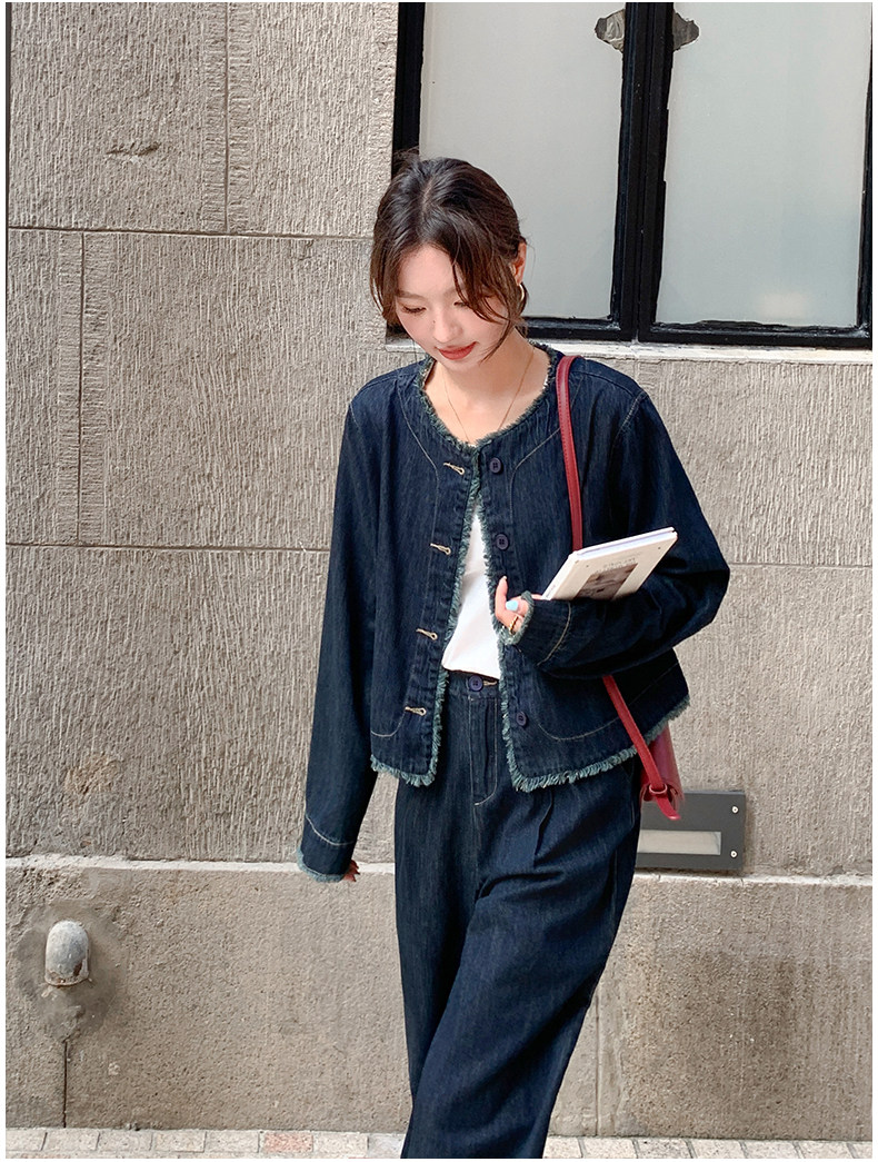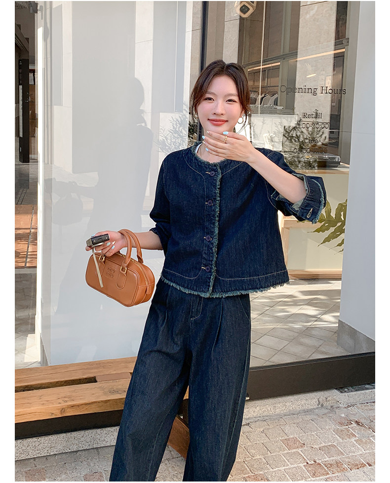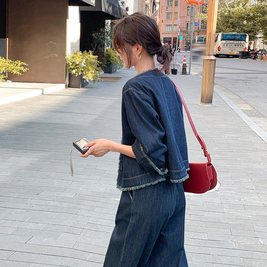 【商品名】2点セット!【ボトムス】春秋 細見えセットアップ レディース フリンジデニムジャケット+ワイドパンツ 上下セット【JZシリーズ】
