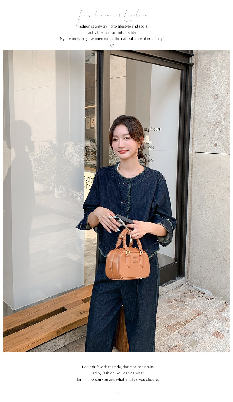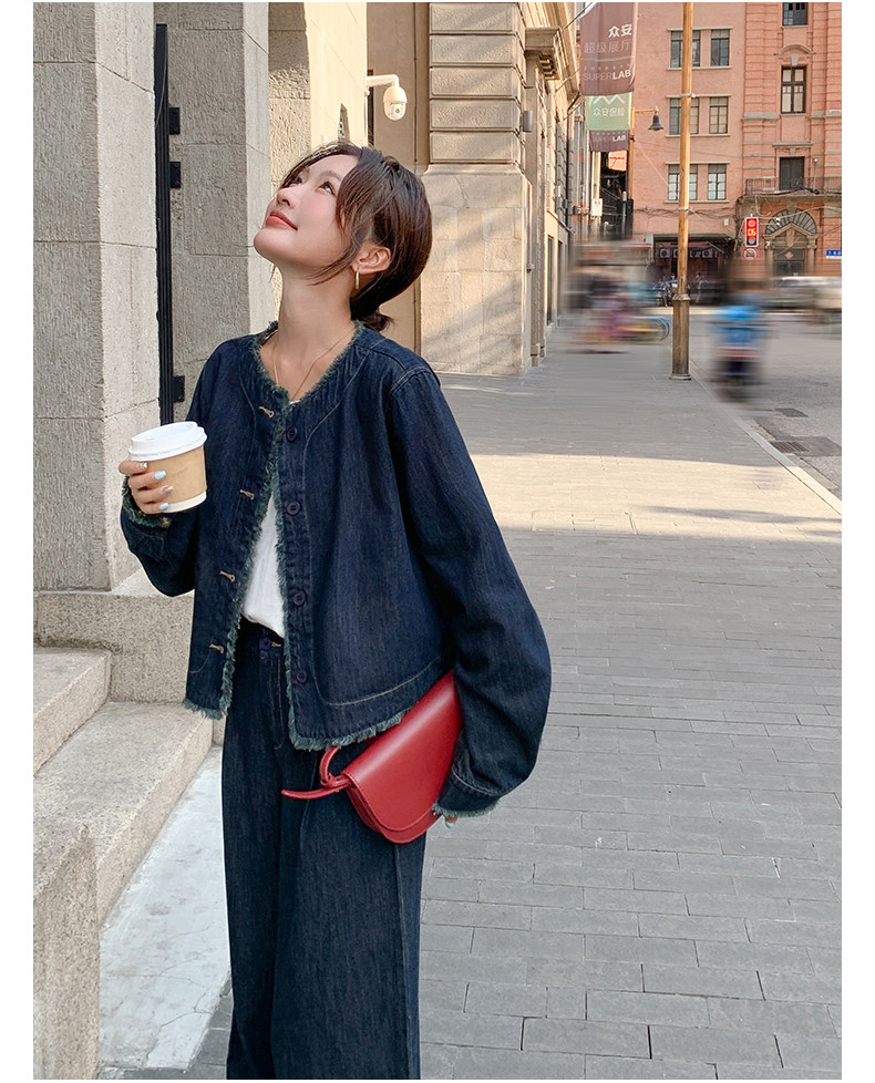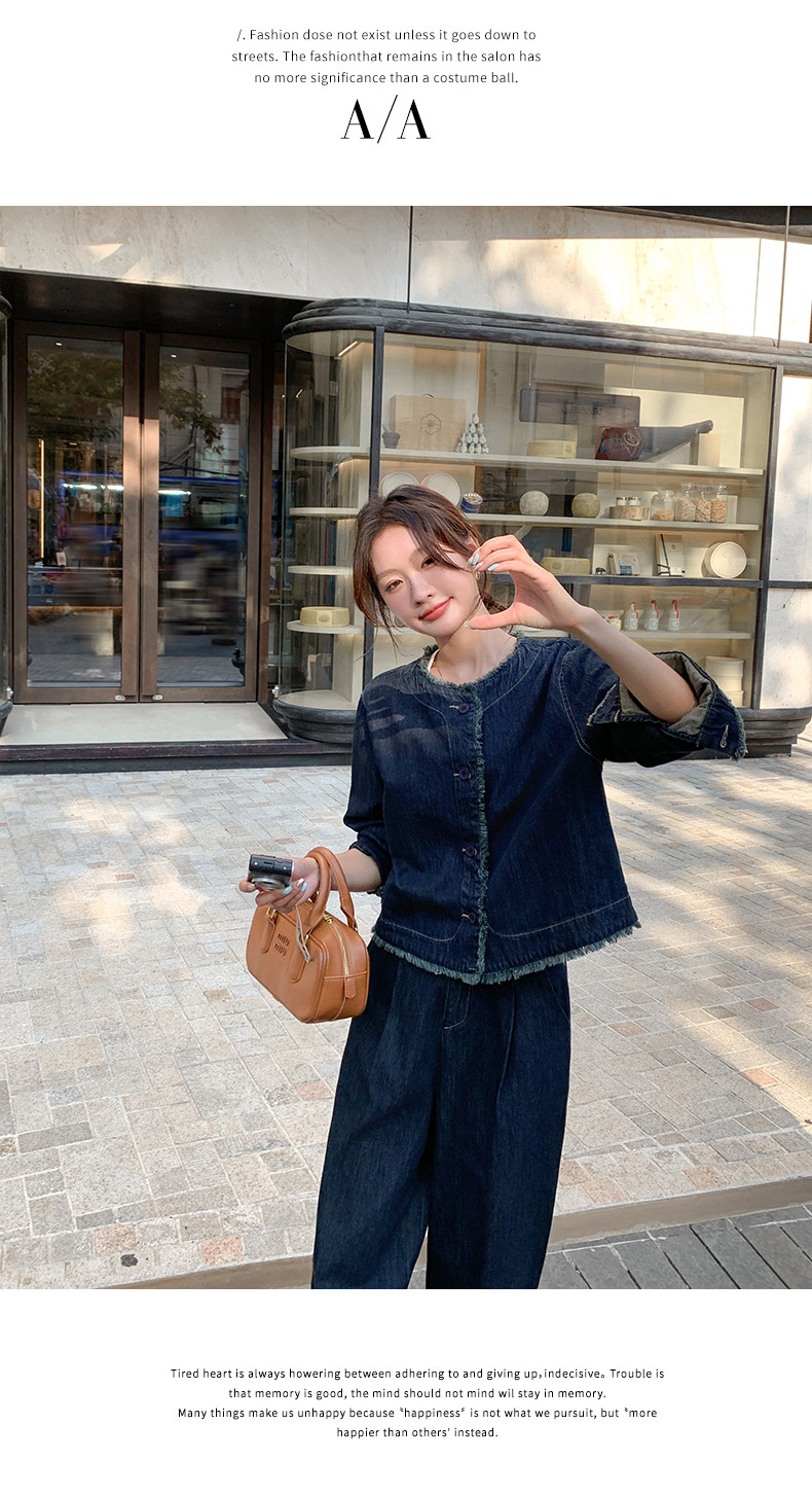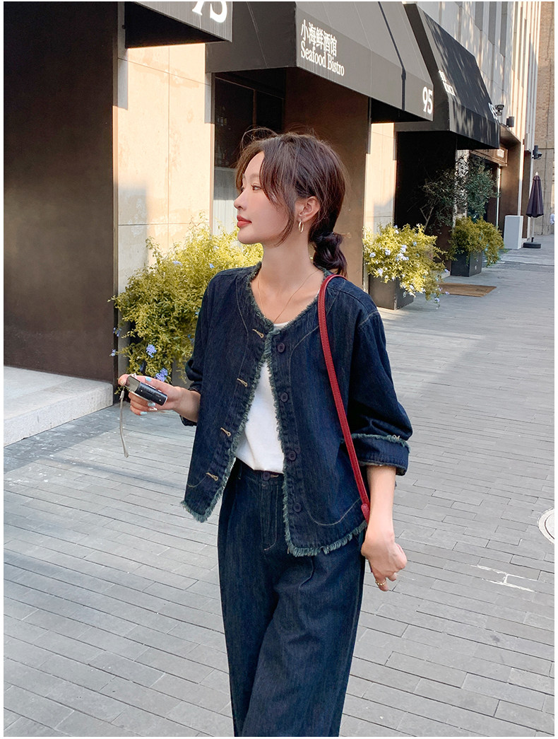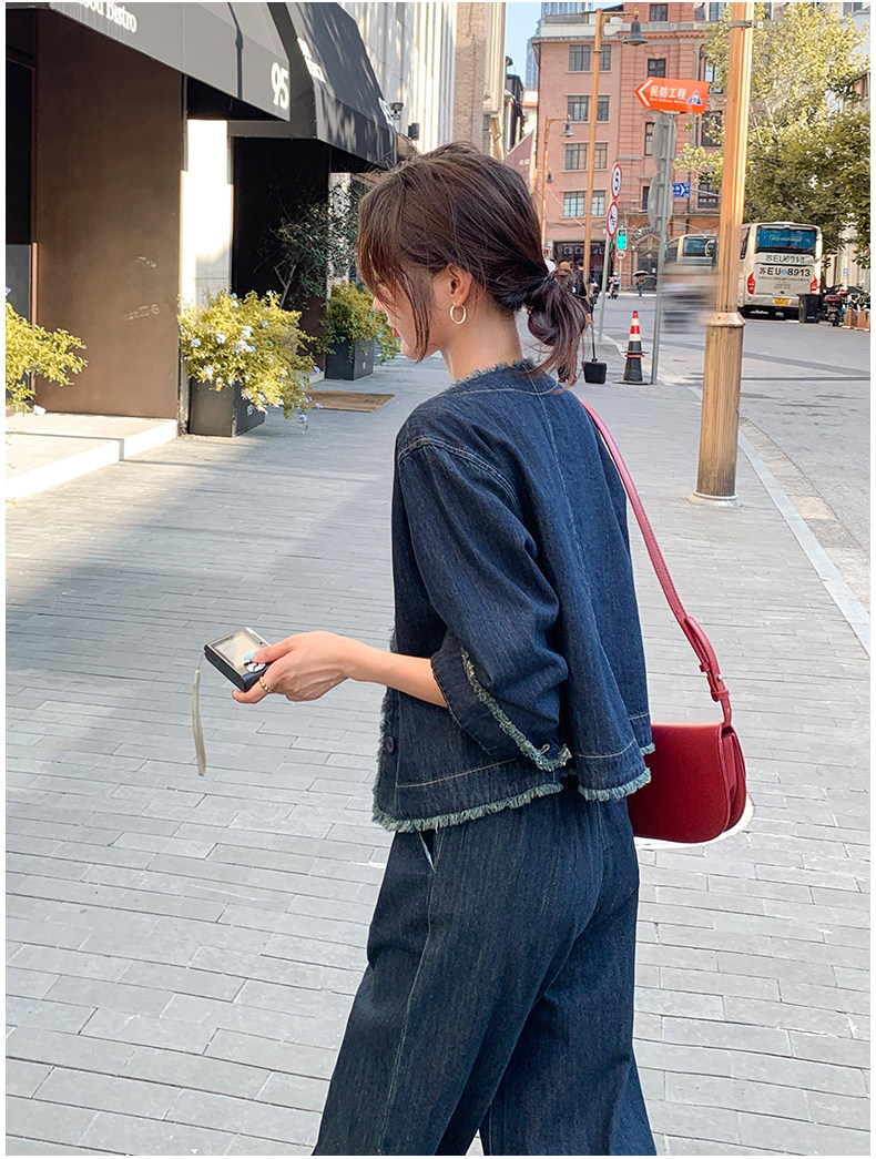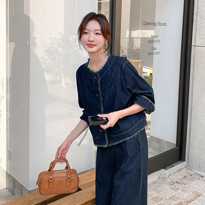 【商品名】2点セット!【ボトムス】春秋 細見えセットアップ レディース フリンジデニムジャケット+ワイドパンツ 上下セット【JZシリーズ】
