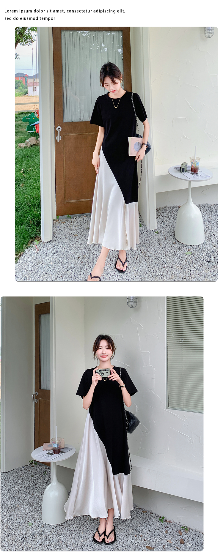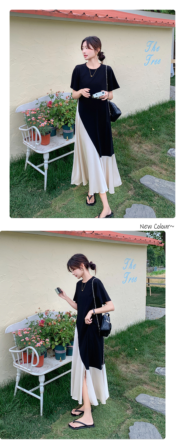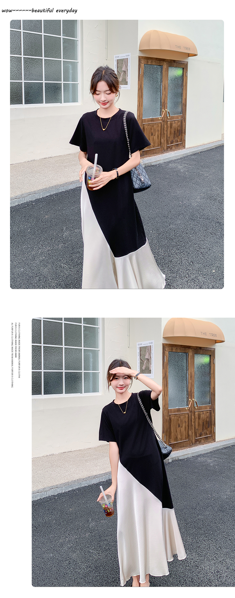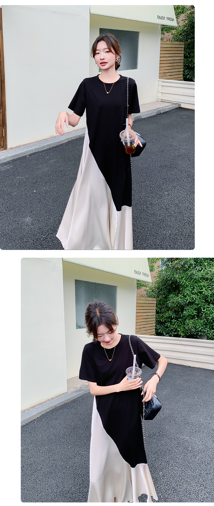 【ワンピース】個性配色切り替えアシンメトリー半袖 Tシャツワンピース 夏 ゆったりロング丈【JZシリーズ】