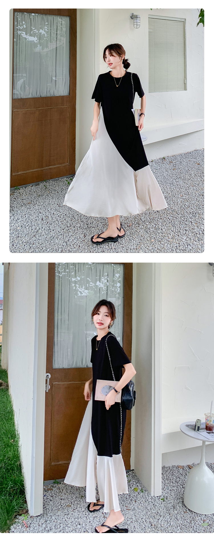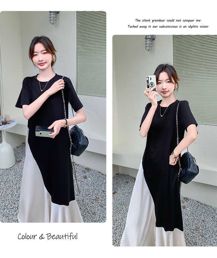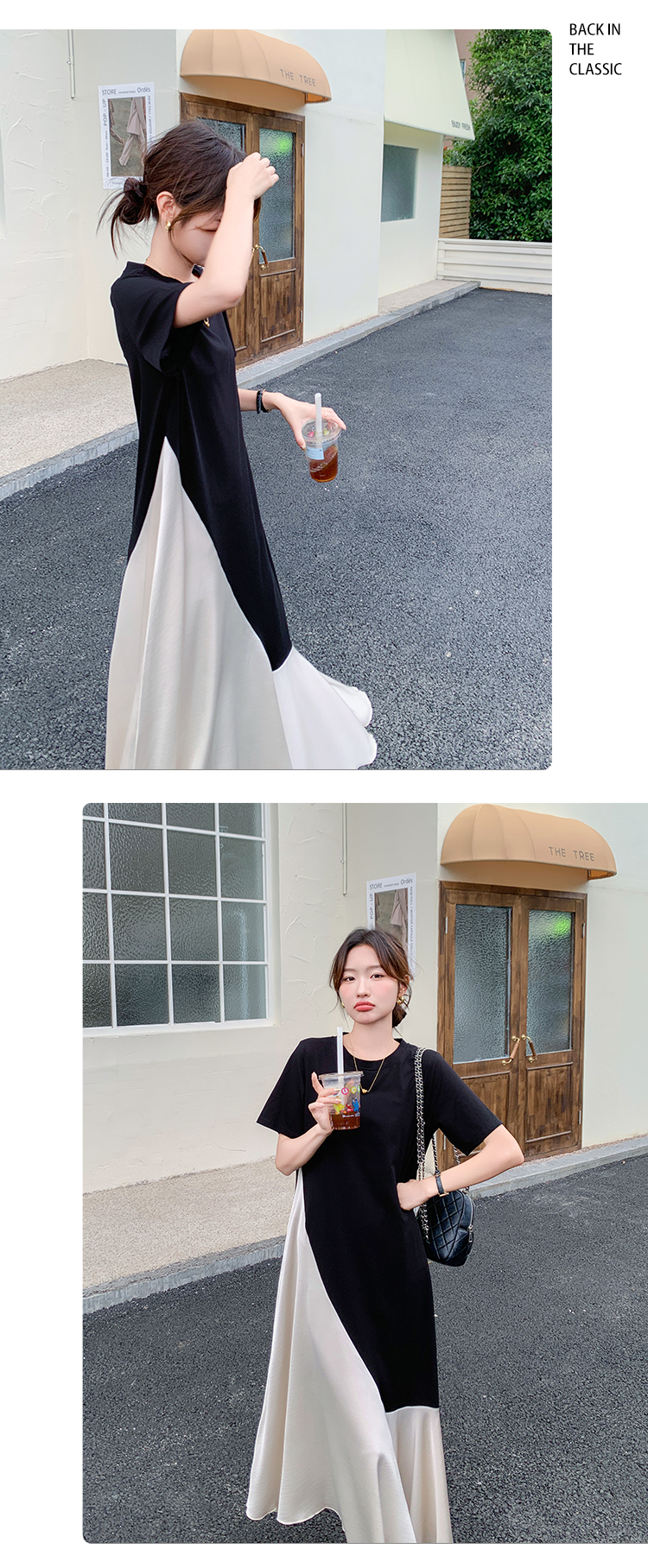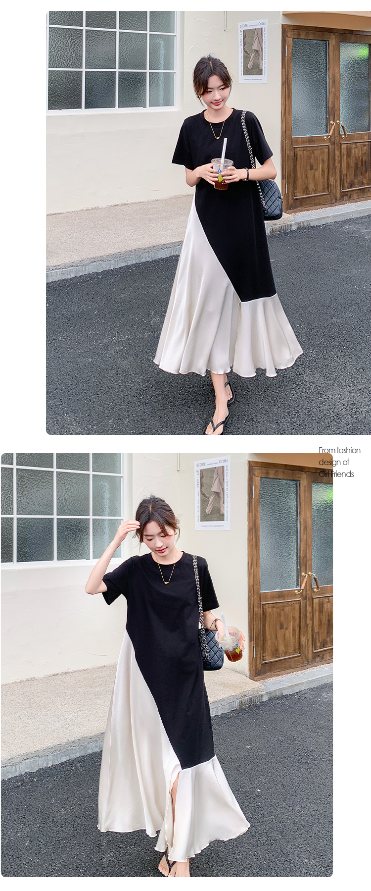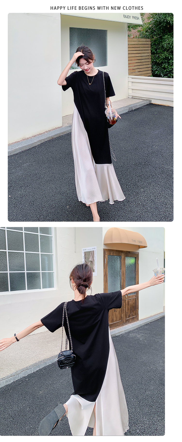 【ワンピース】個性配色切り替えアシンメトリー半袖 Tシャツワンピース 夏 ゆったりロング丈【JZシリーズ】