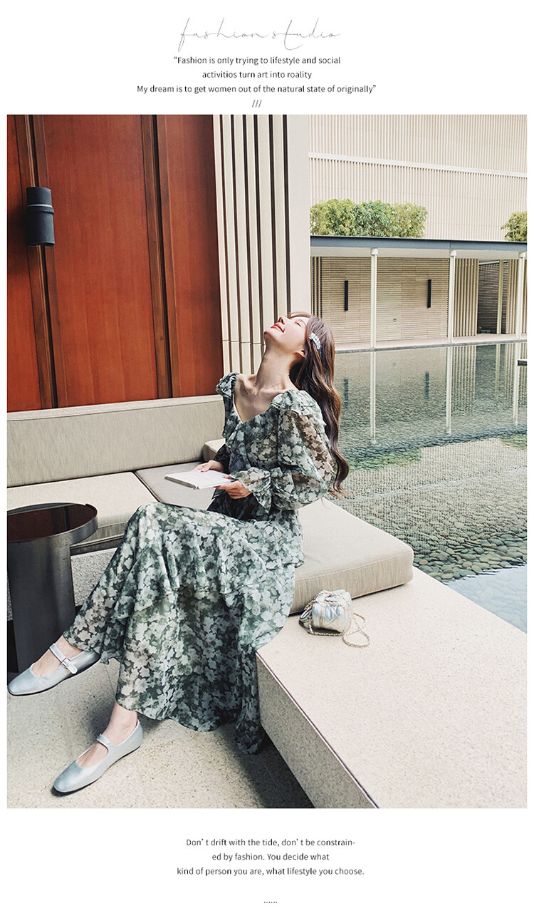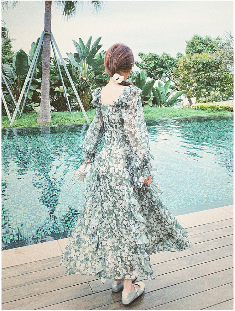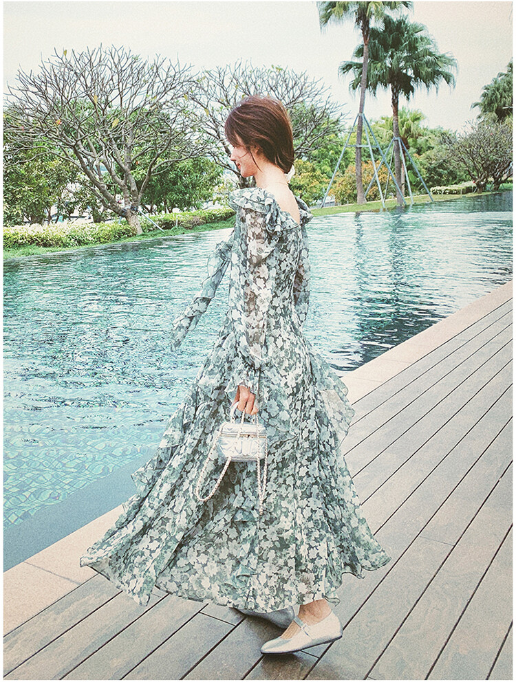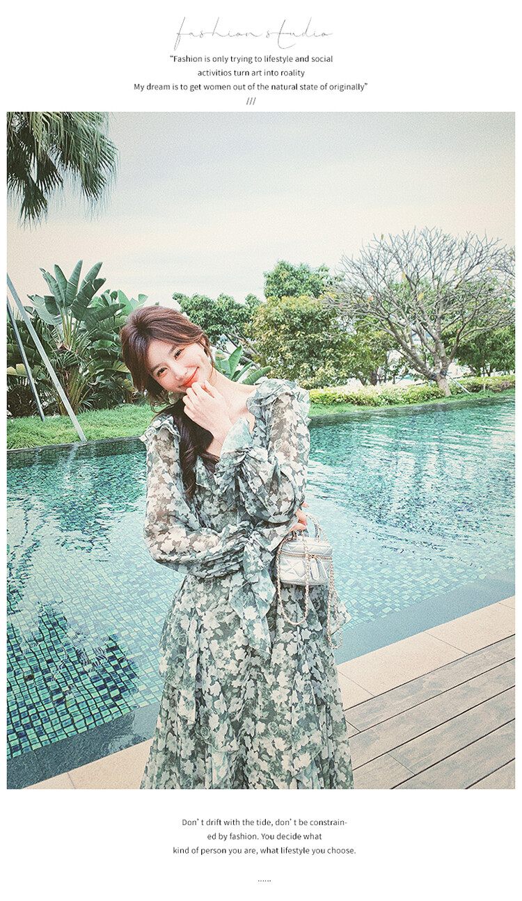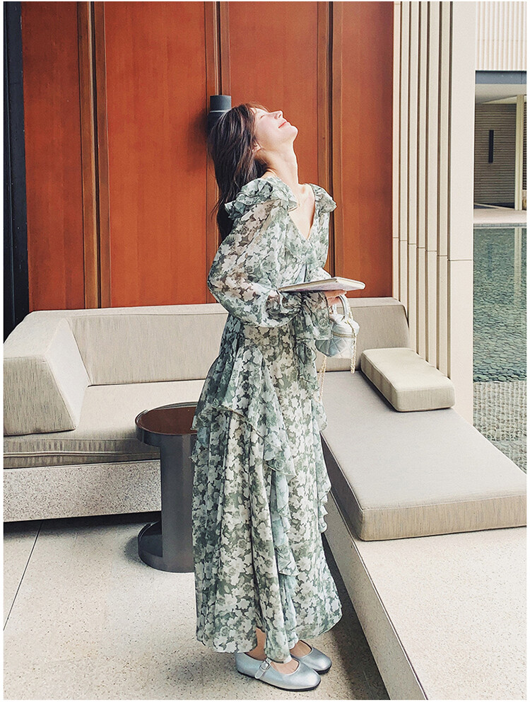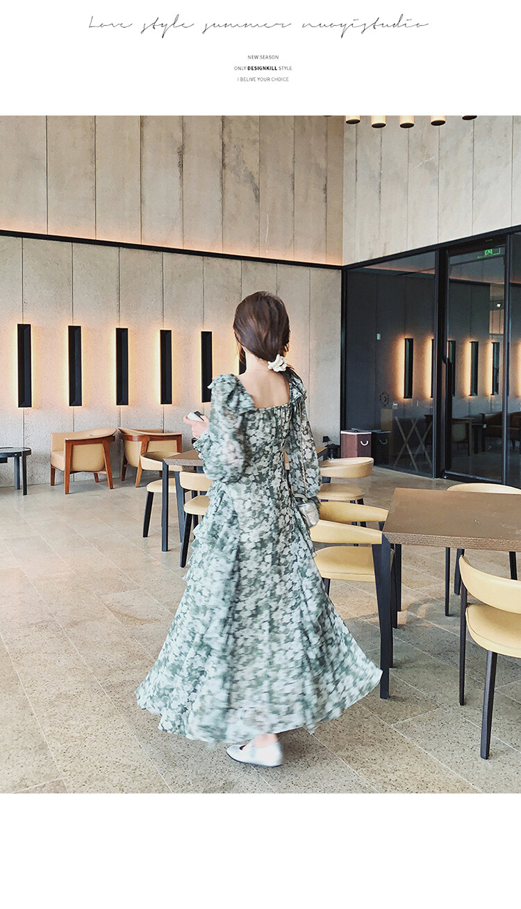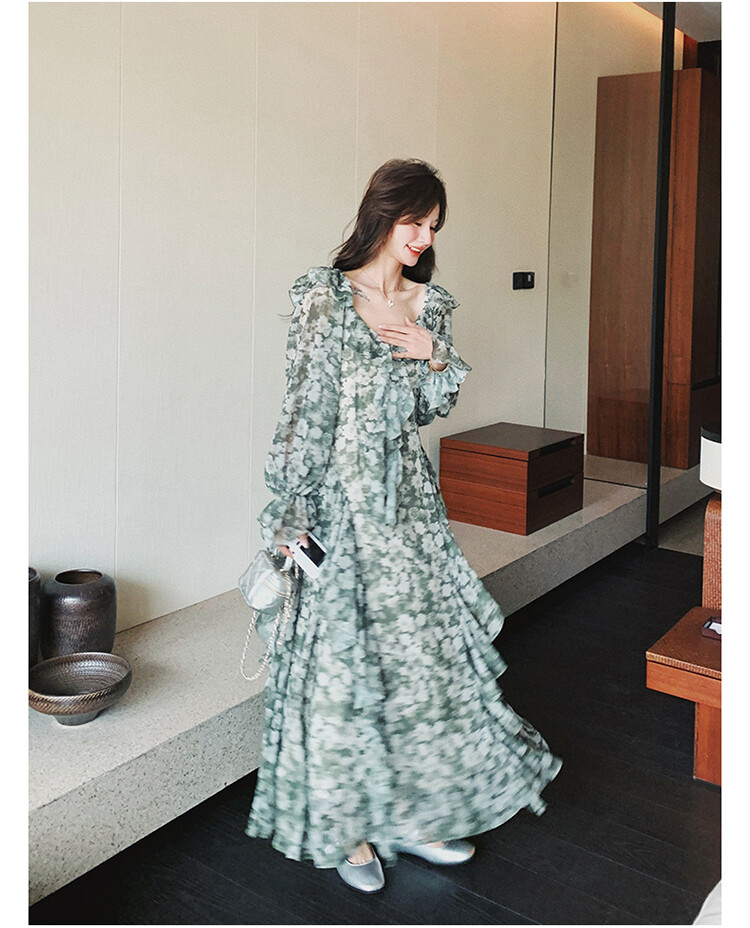 【商品名】【ワンピース】森系花柄シフォン長袖ワンピース レディース 春夏秋 薄手 ウエストマーク Aライン ロング丈【SHシリーズ】